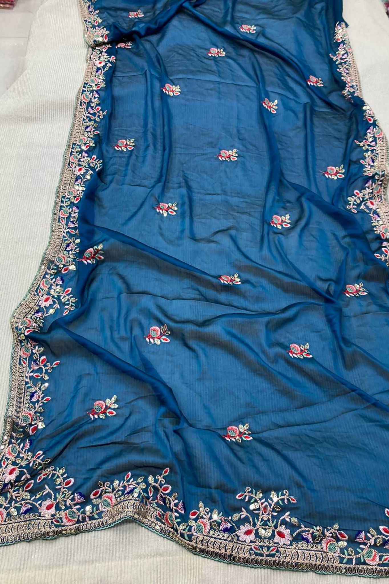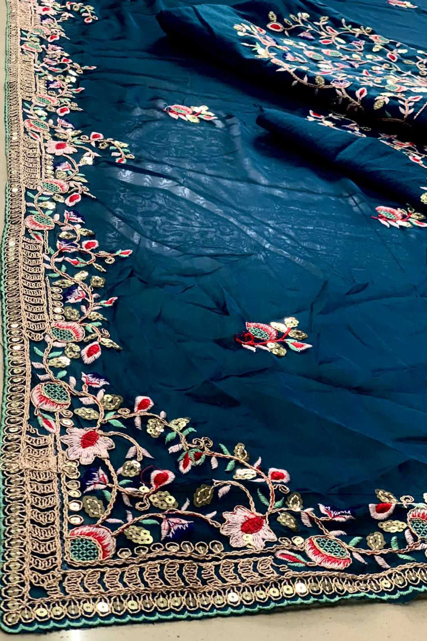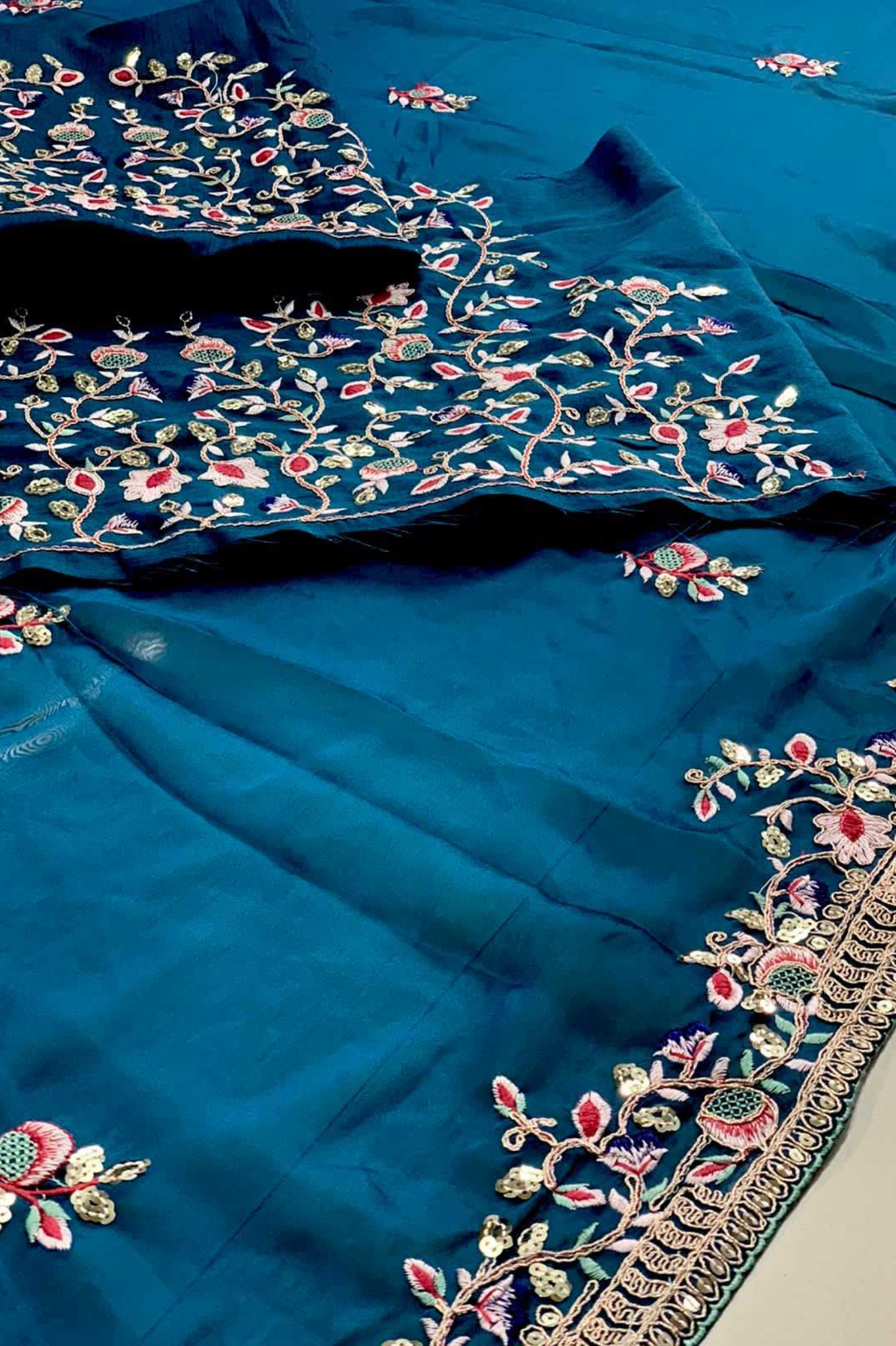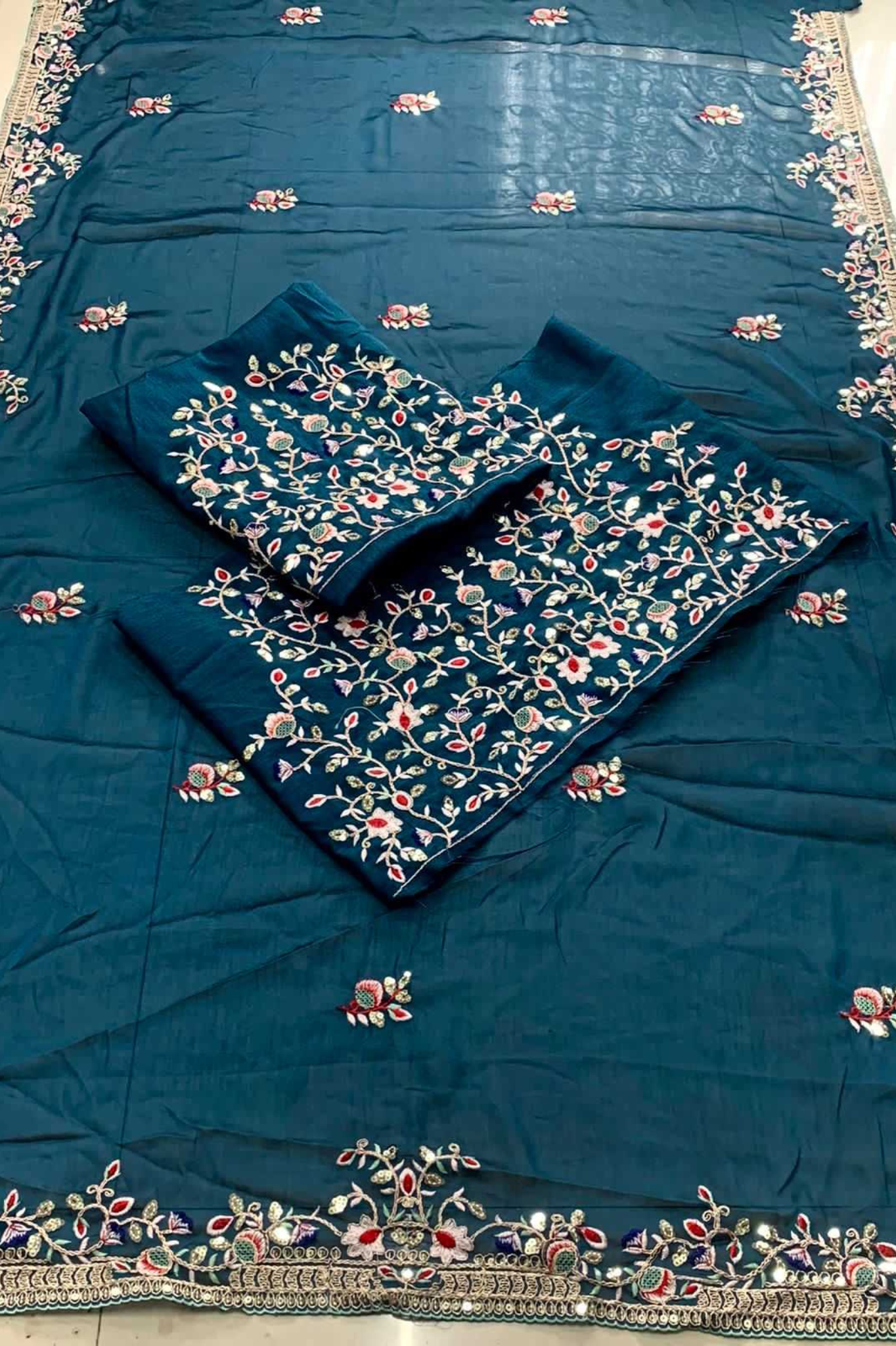 Elevate your festive and wedding wardrobe with this luxurious teal blue Rangoli Silk Saree, adorned with rich embroidered detailing across the border, pallu, and body. The premium drape, combined with stunning craftsmanship, gives a royal and elegant look perfect for weddings, receptions, and grand celebrations.