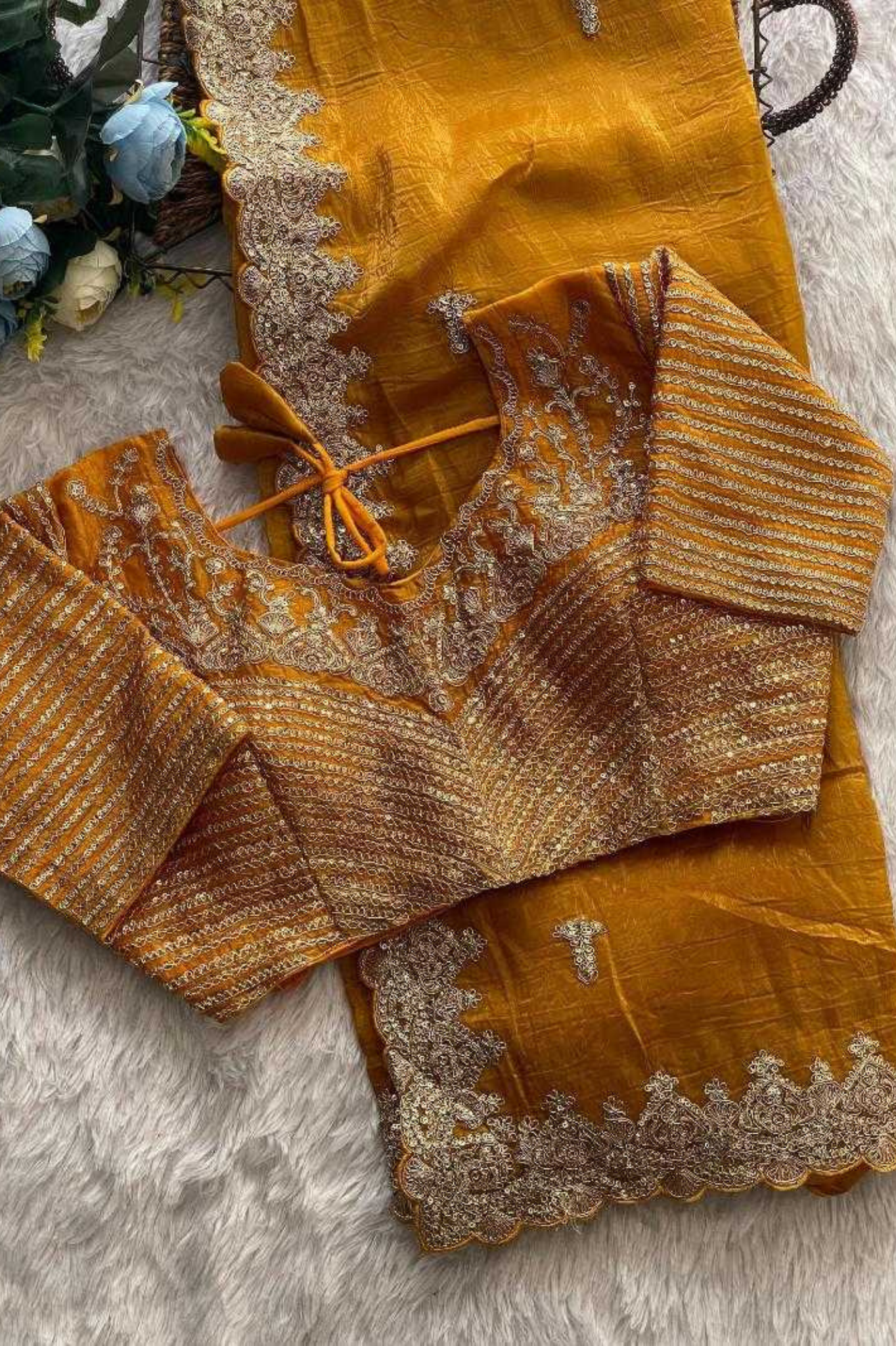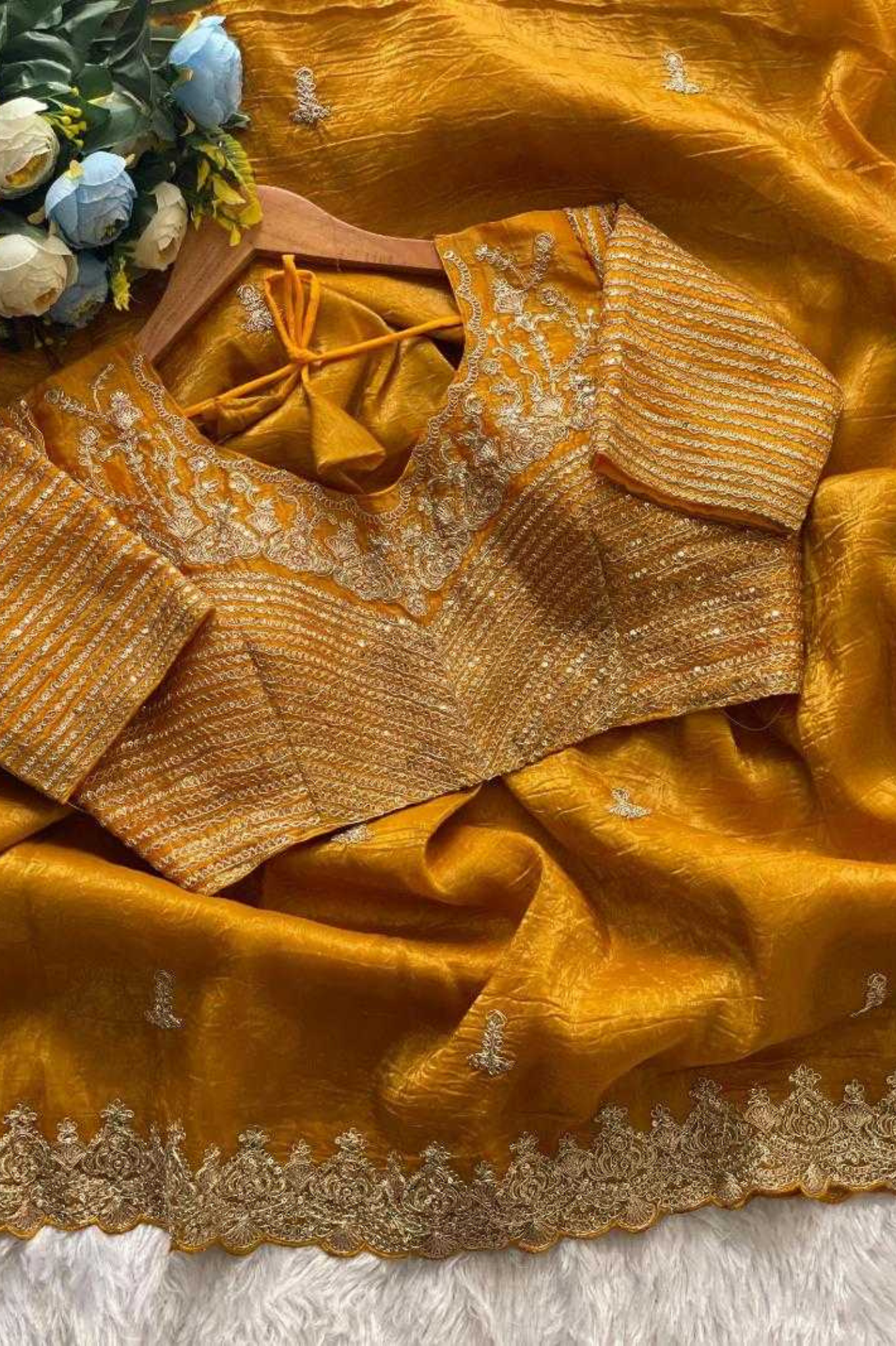 The saree is paired with a matching unstitched blouse made from heavy soft gold crush silk, adorned with matching zari, sequence, and coding embroidery for a perfectly coordinated ensemble.