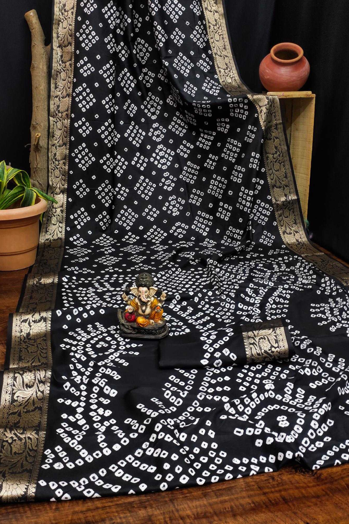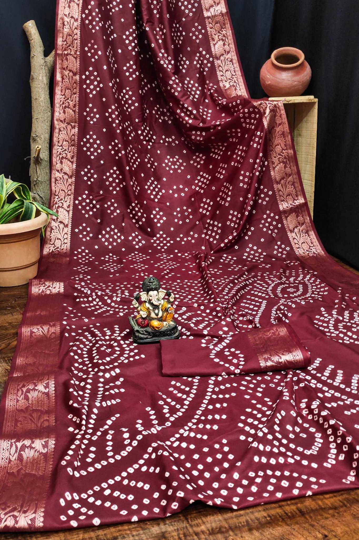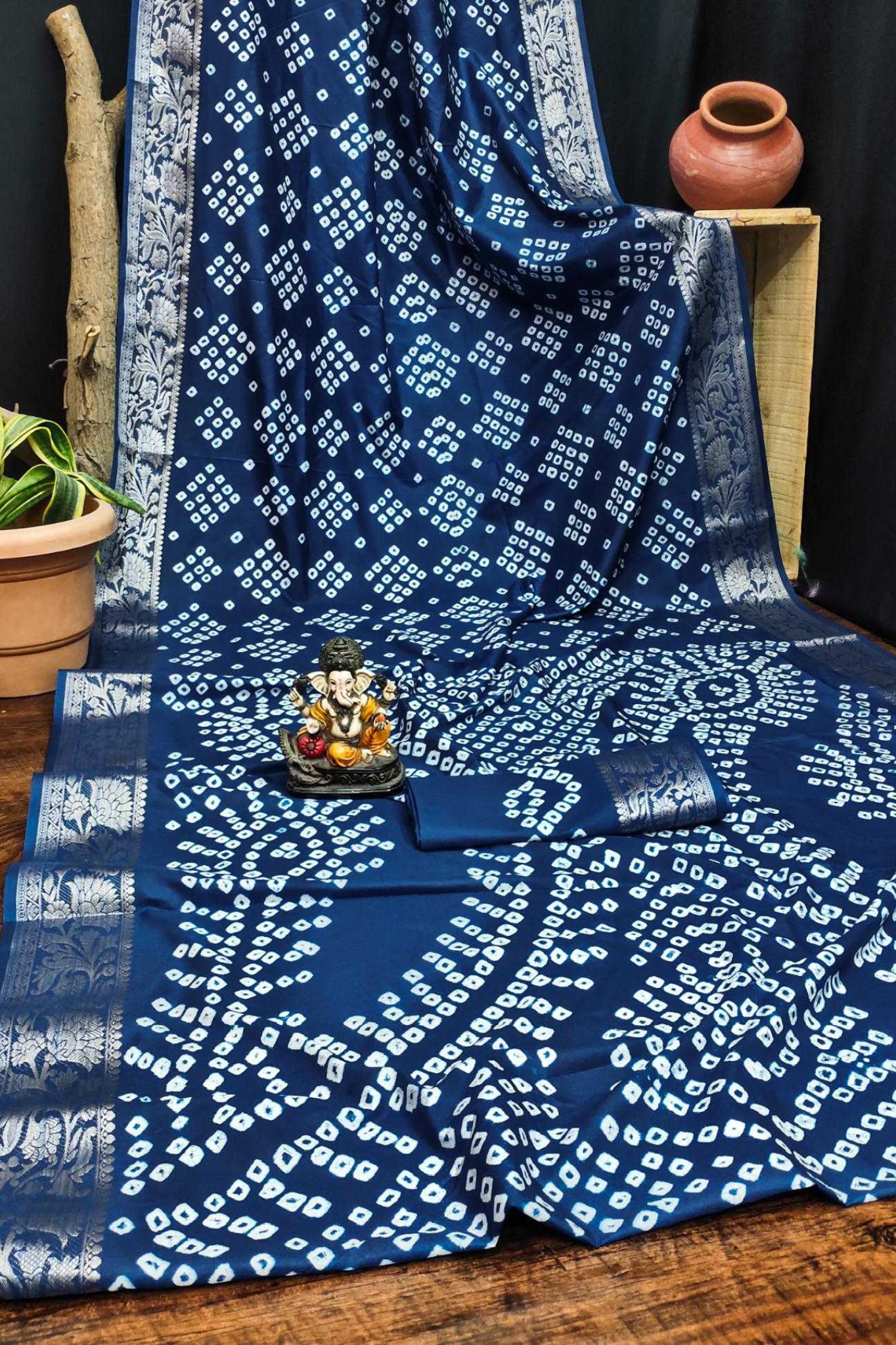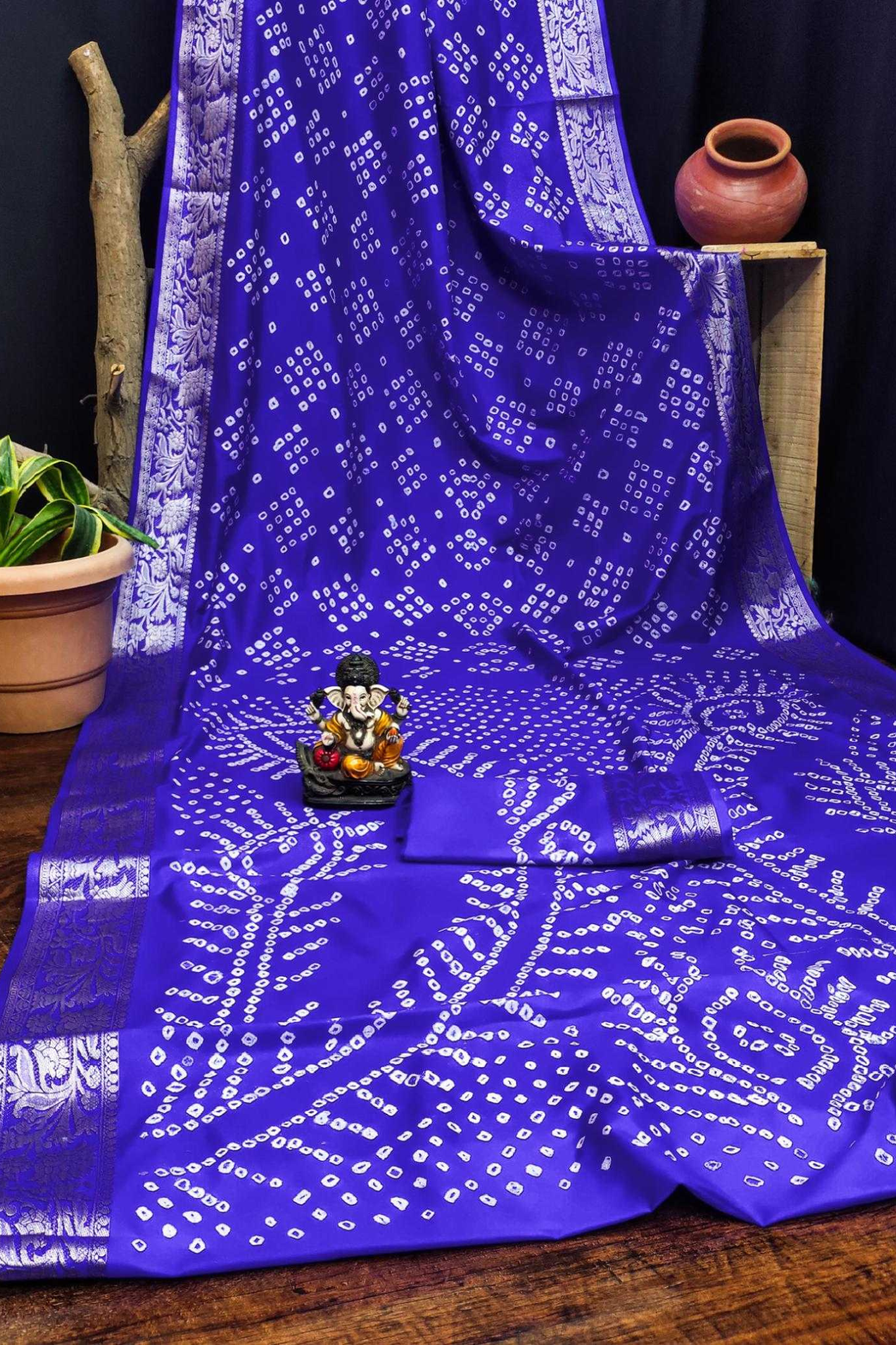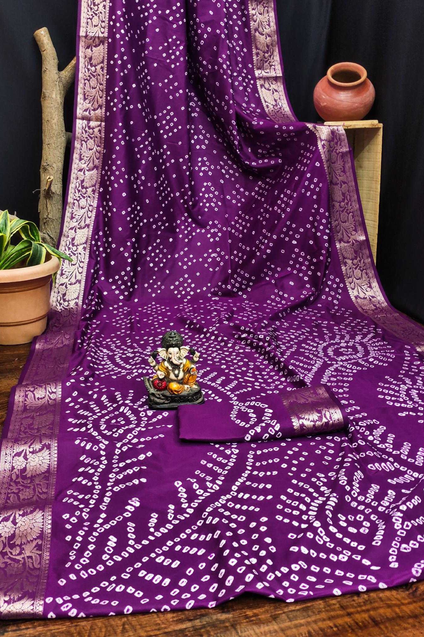 Handcrafted with fine artistry, this saree reflects the timeless beauty of traditional Bandhej while ensuring a soft, smooth drape and royal sheen.
