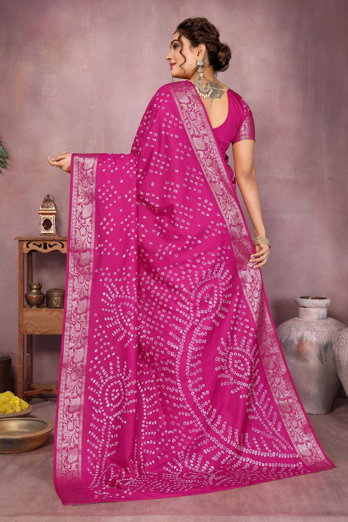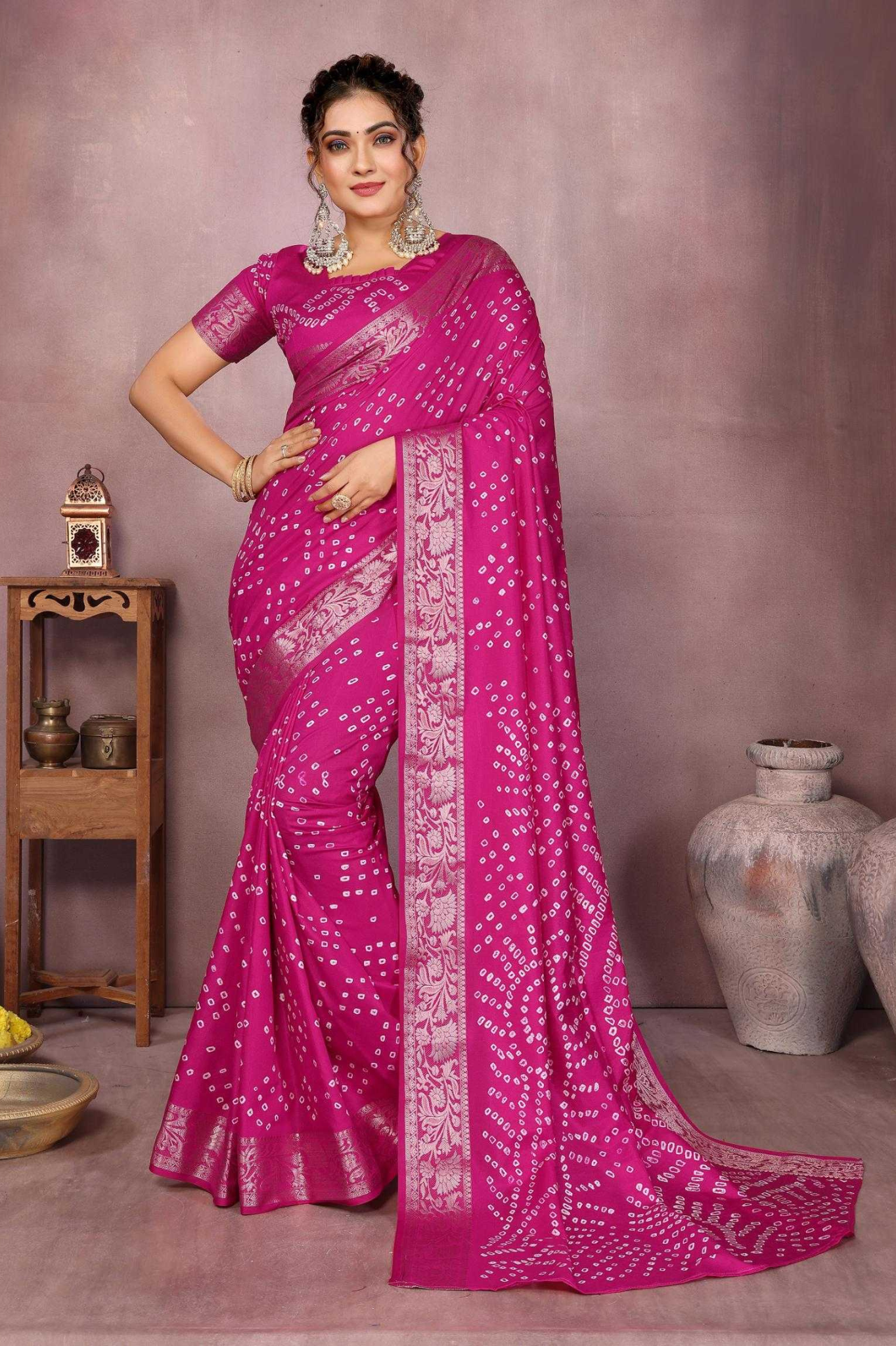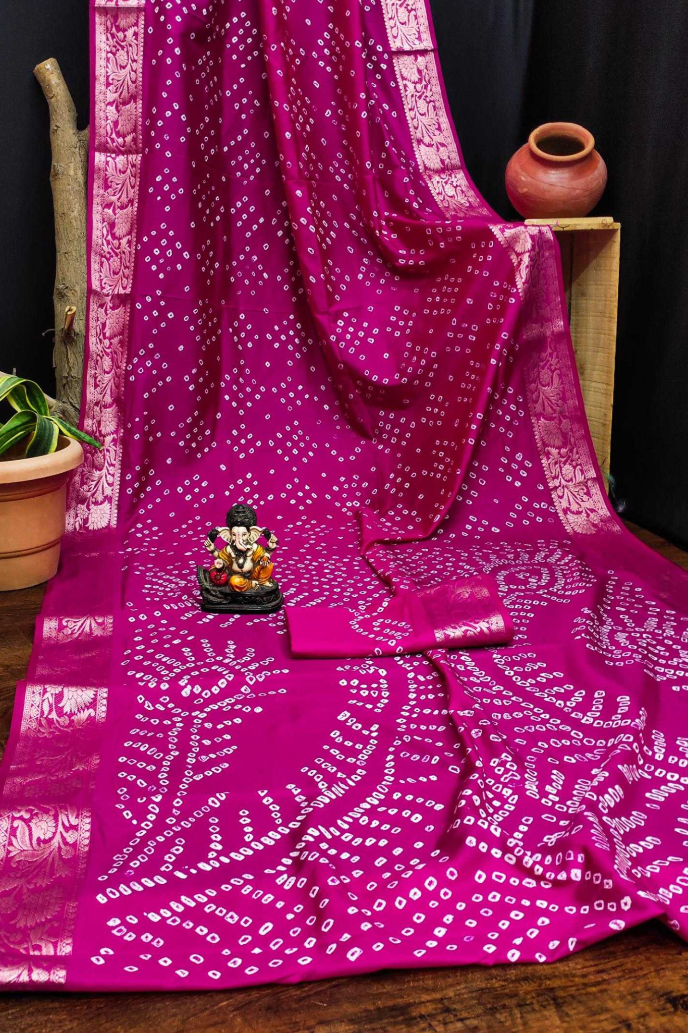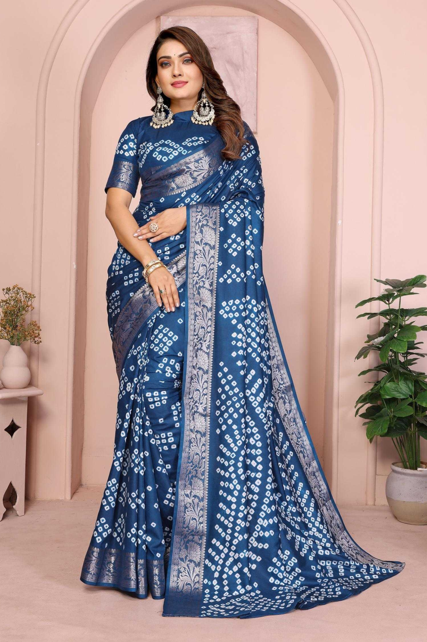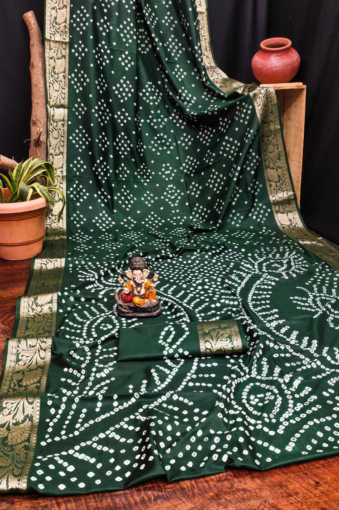 Handcrafted with fine artistry, this saree reflects the timeless beauty of traditional Bandhej while ensuring a soft, smooth drape and royal sheen.