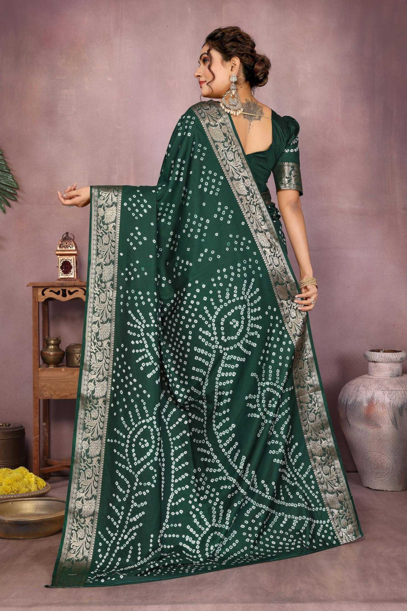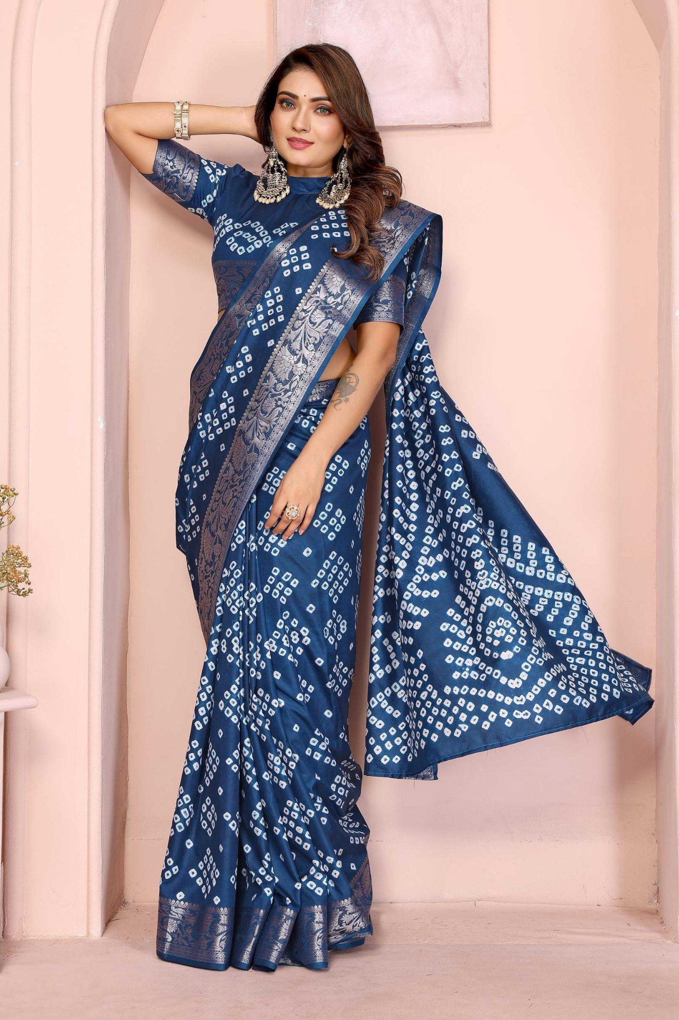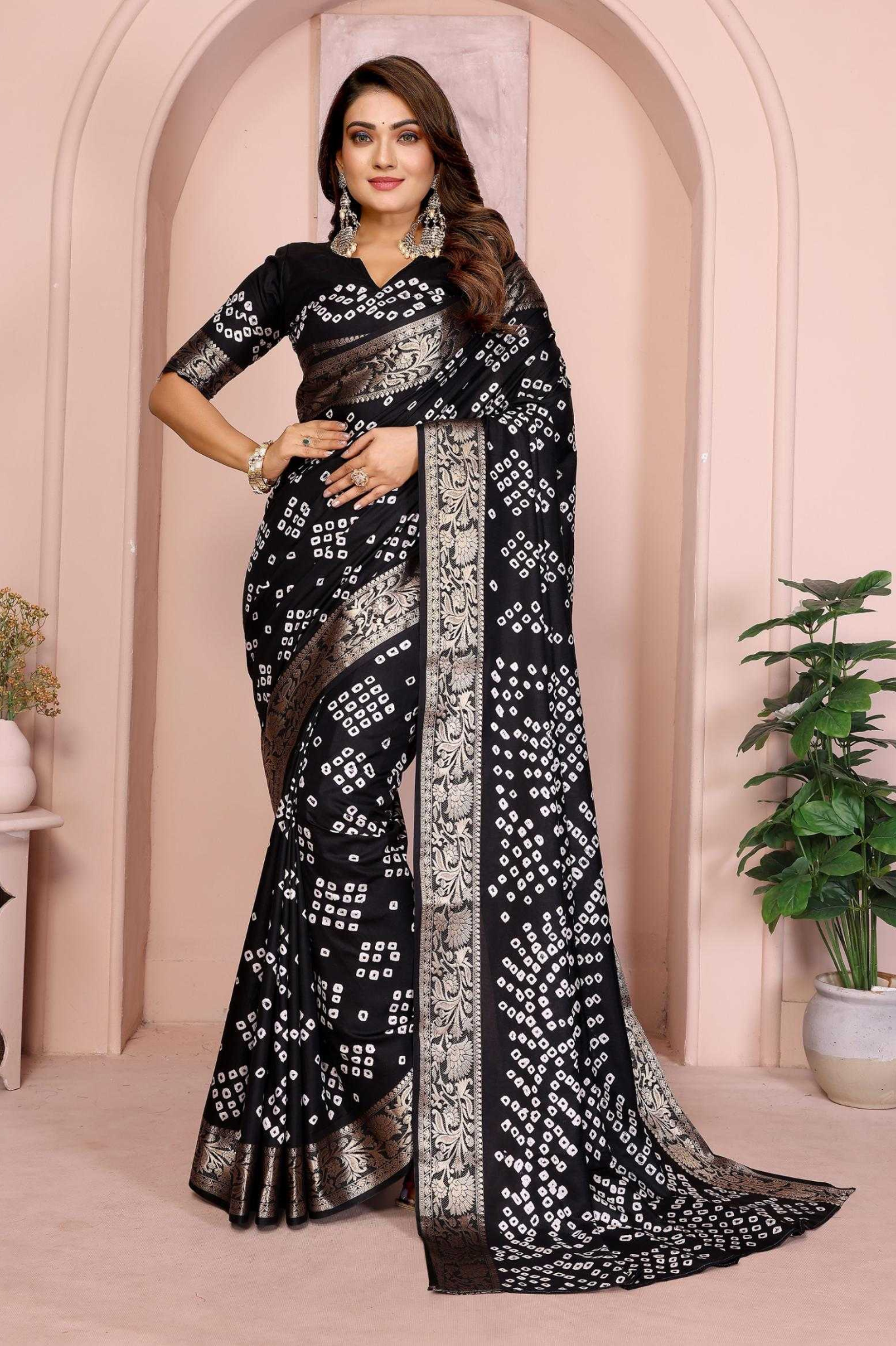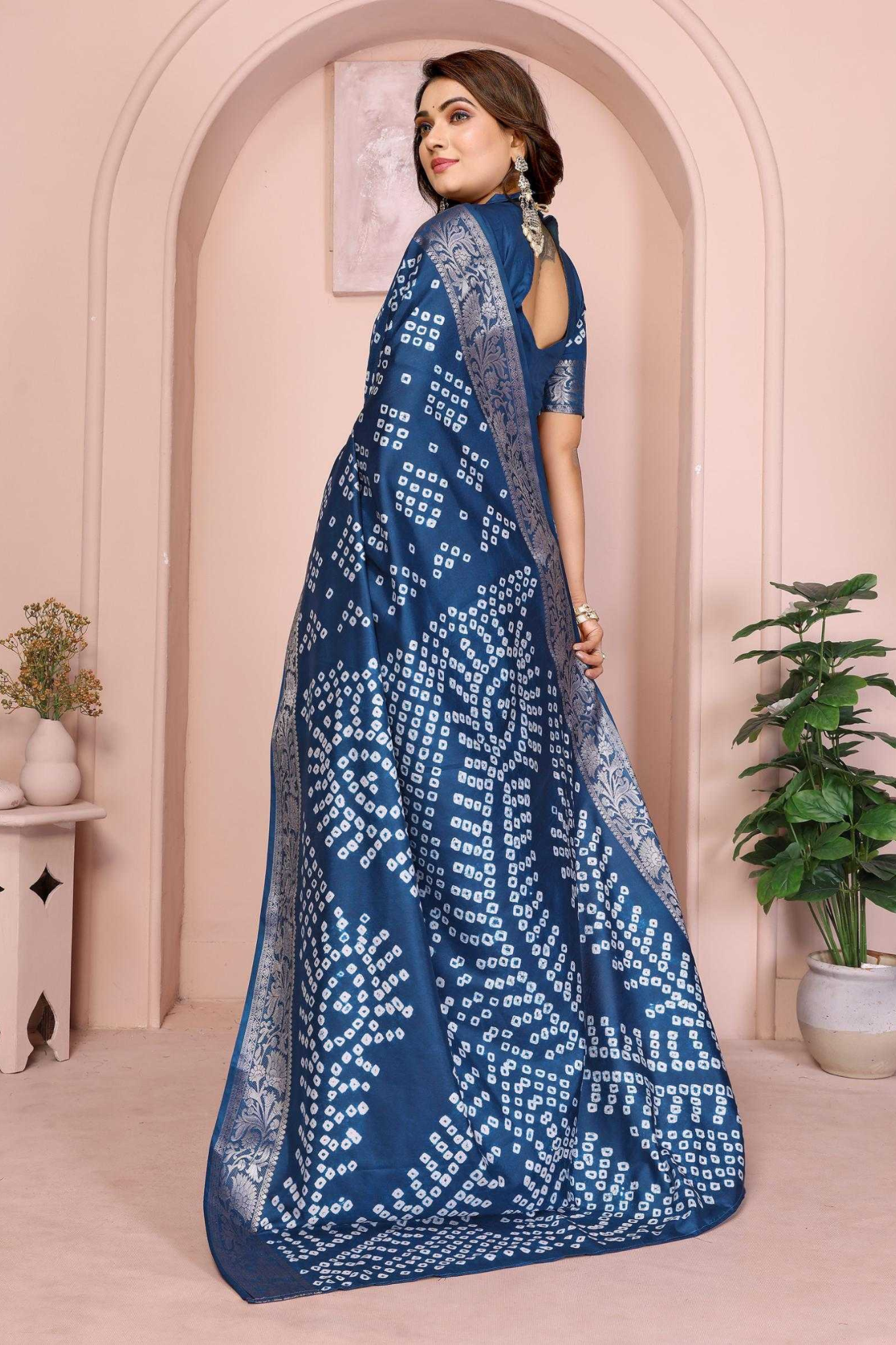 Handcrafted with fine artistry, this saree reflects the timeless beauty of traditional Bandhej while ensuring a soft, smooth drape and royal sheen.