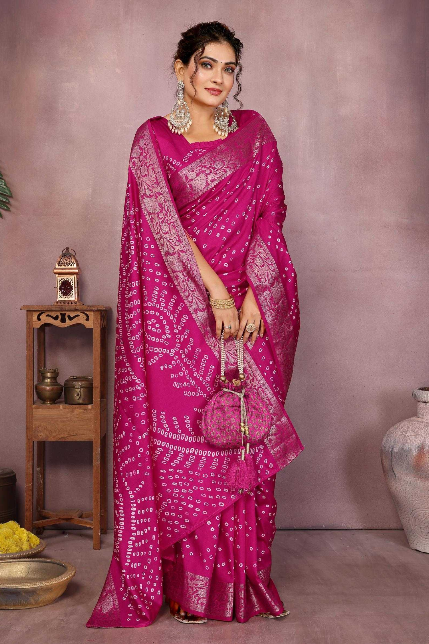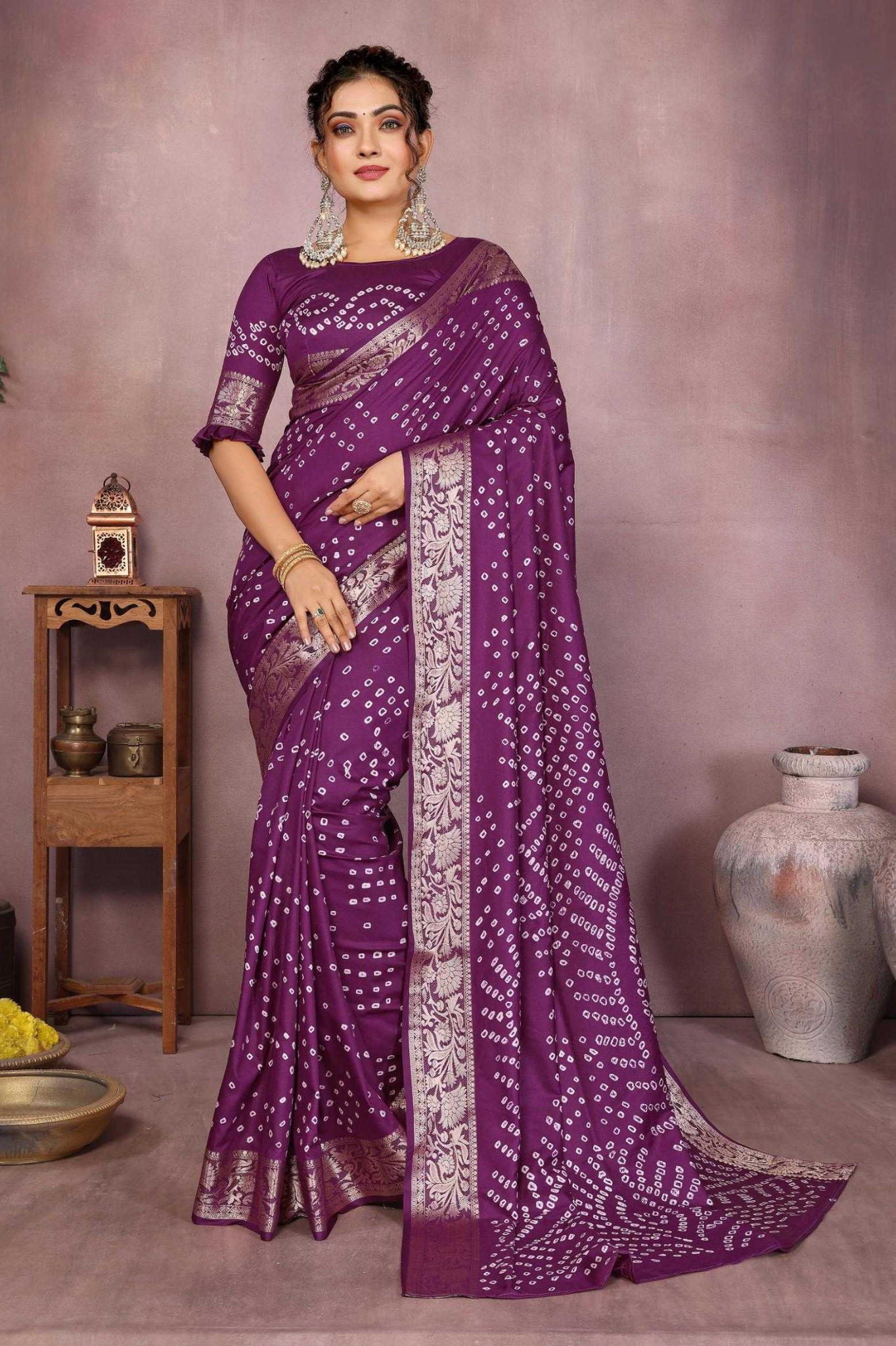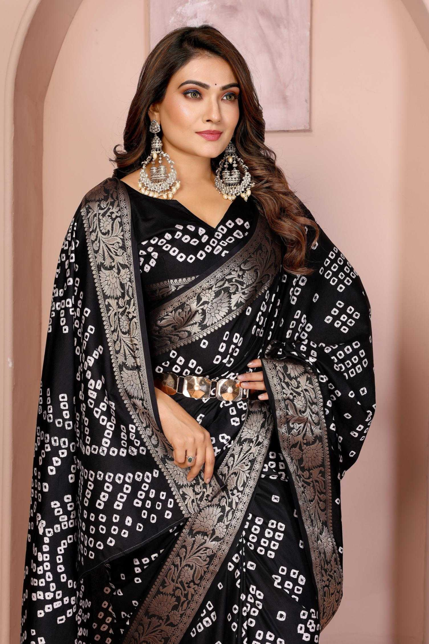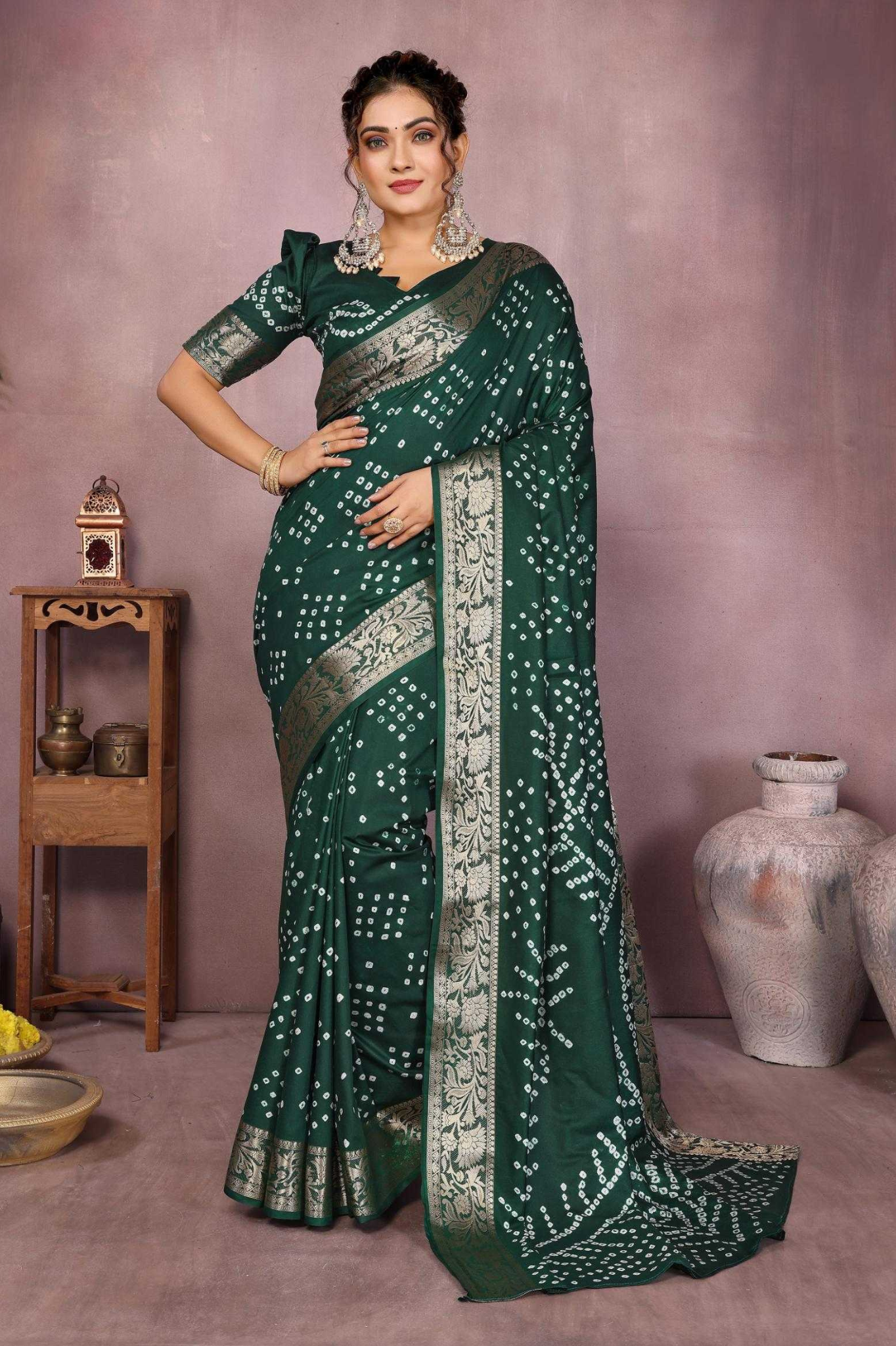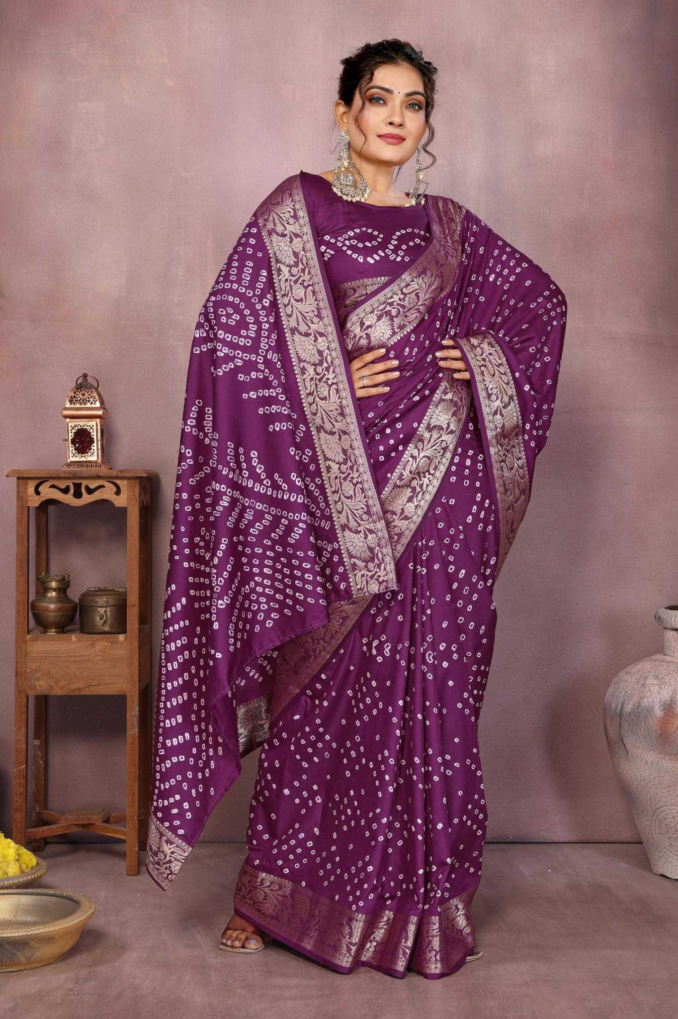 Handcrafted with fine artistry, this saree reflects the timeless beauty of traditional Bandhej while ensuring a soft, smooth drape and royal sheen.