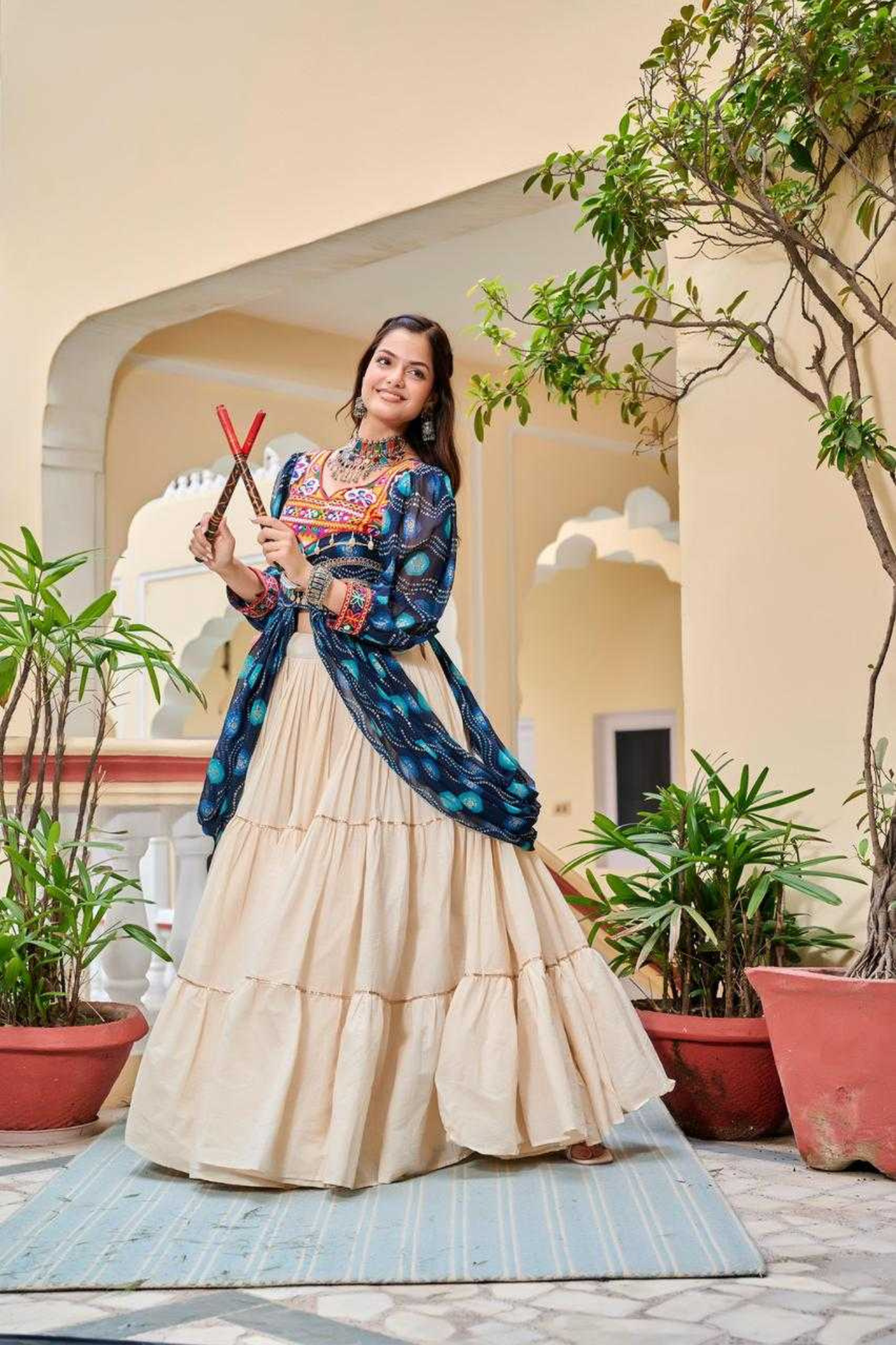 Celebrate tradition in style with this exquisite pure cotton lehenga set, crafted with a grand 9-meter flair and delicate ribbon lace detailing. It comes with a beautifully designed shrug featuring heavy Gamthi work, ribbon lace, kodi lace, and mirror lace, adding vibrant ethnic charm. The lehenga is lined with soft micro cotton for comfort, while the shrug is fully stitched with size options from M to L (with margin) and XL to 2XL (with margin). Weighing 2kg, this set is perfect for Navratri, festive events, and cultural celebrations, blending elegance with comfort effortlessly.