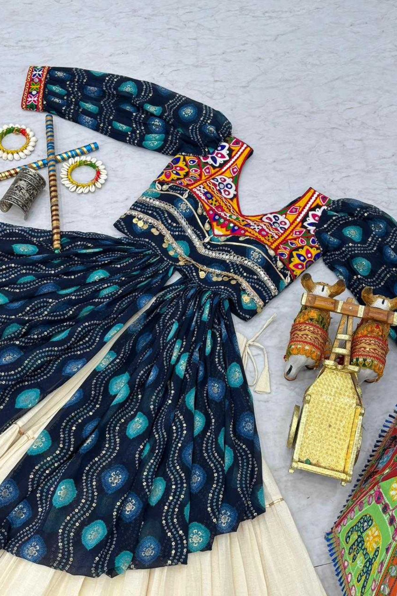 Pure Cotton Gamthi Work Navratri Lehenga with Shrug - Blue