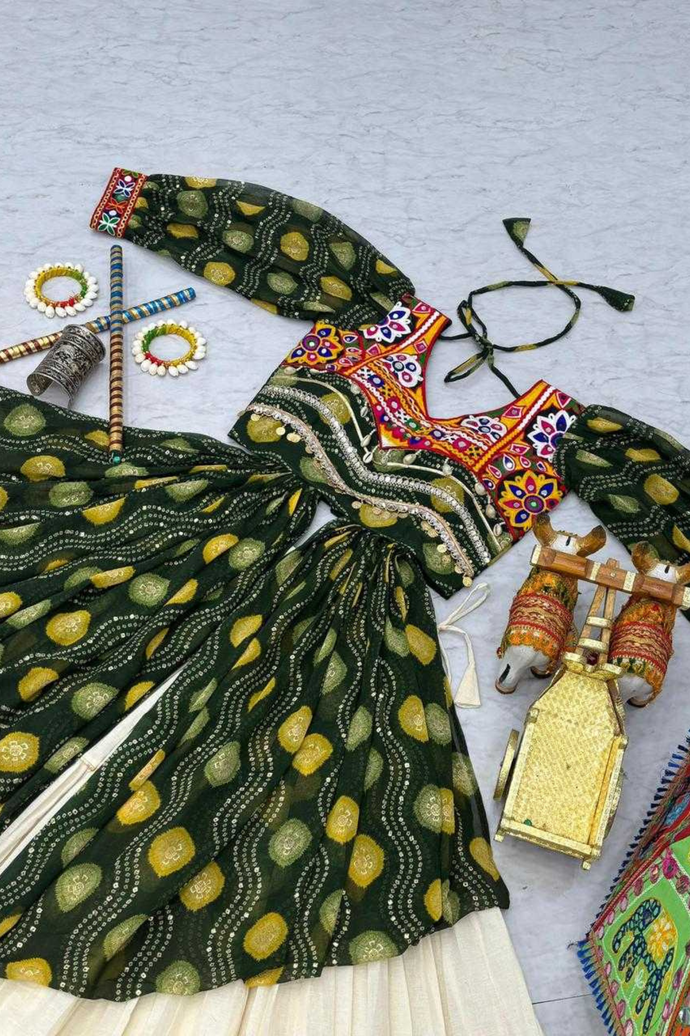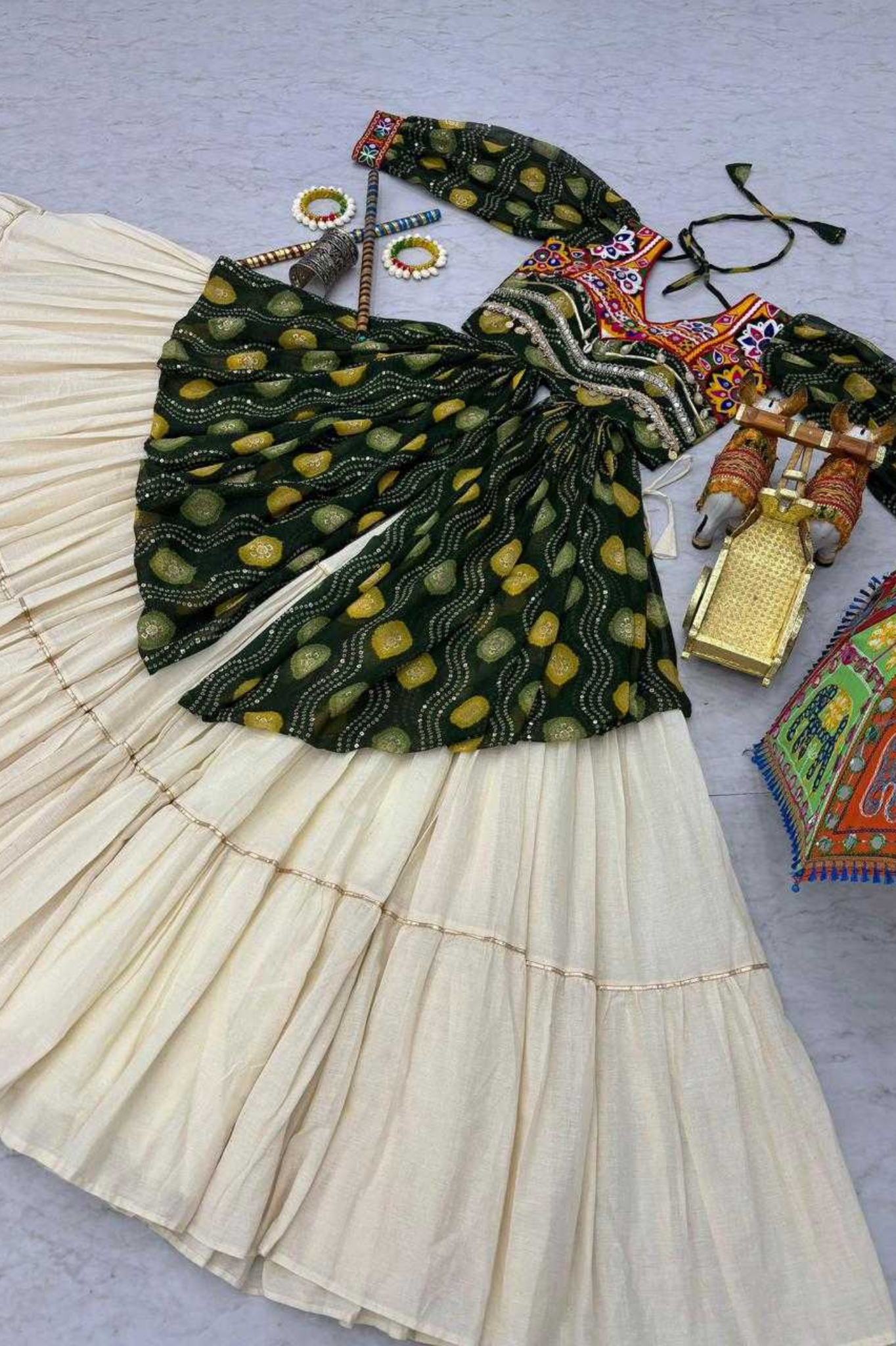 Pure Cotton Gamthi Work Navratri Lehenga with Shrug - Green