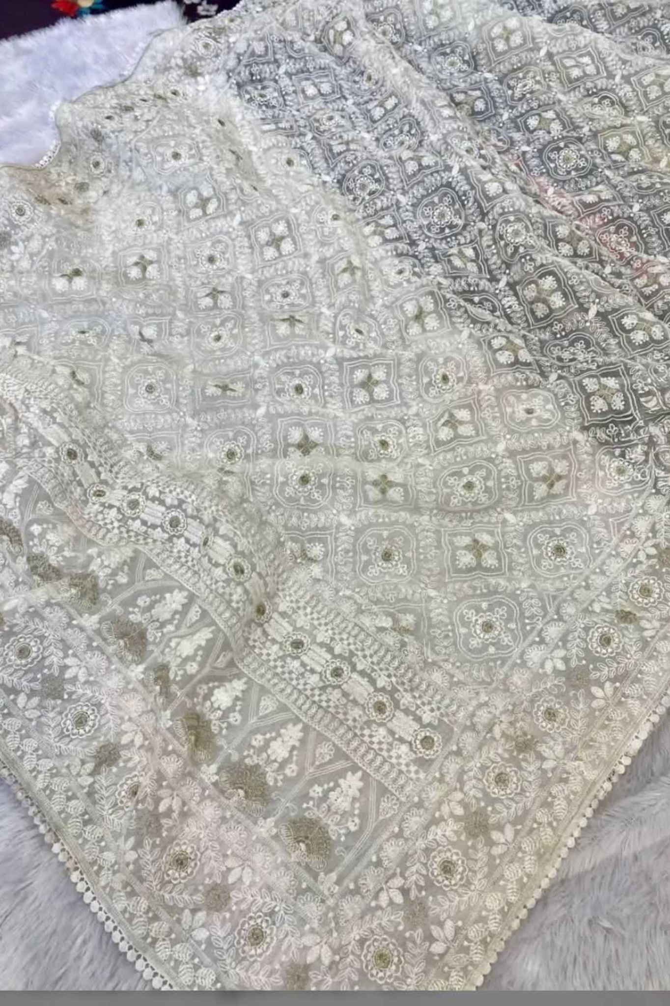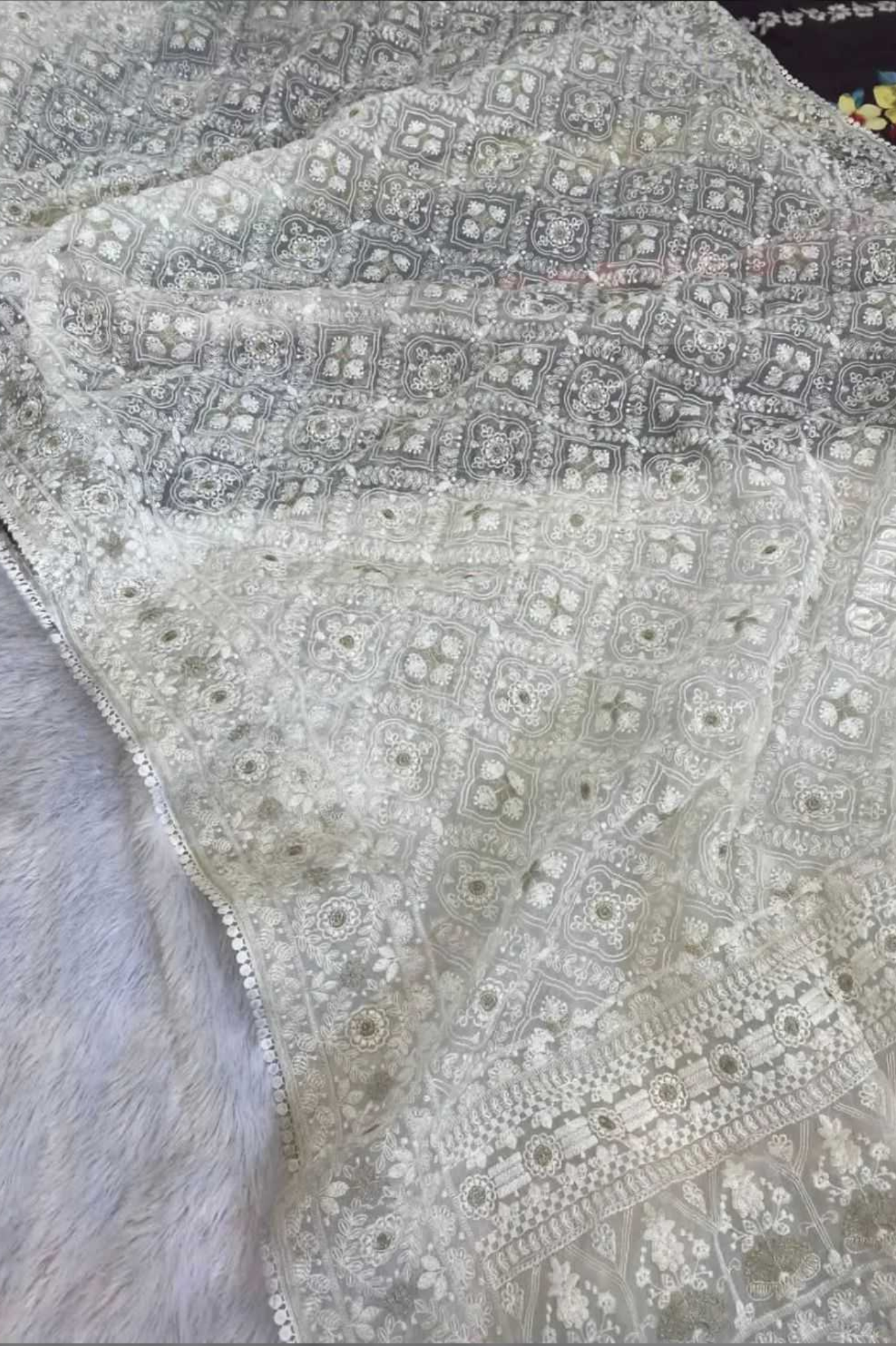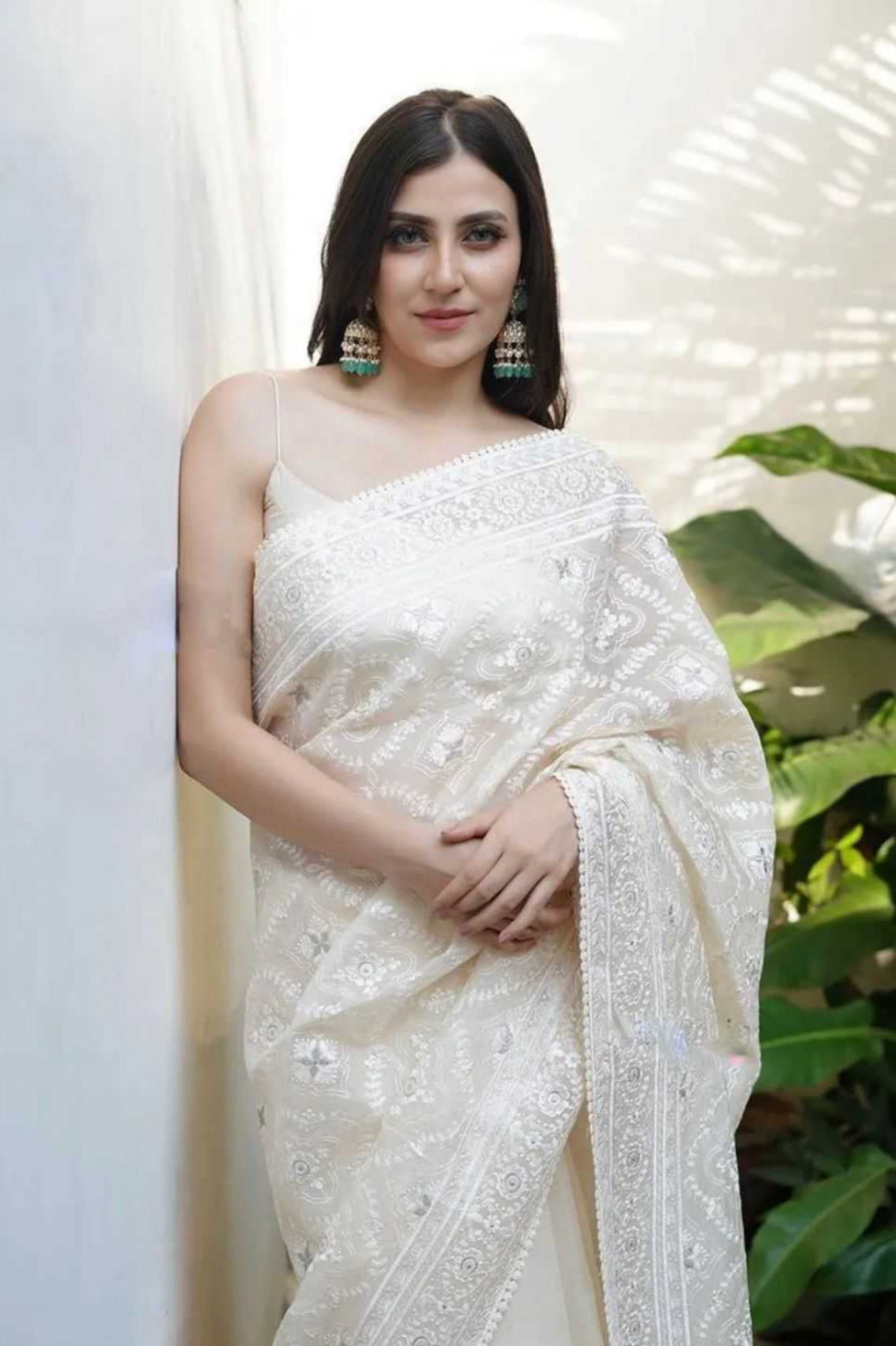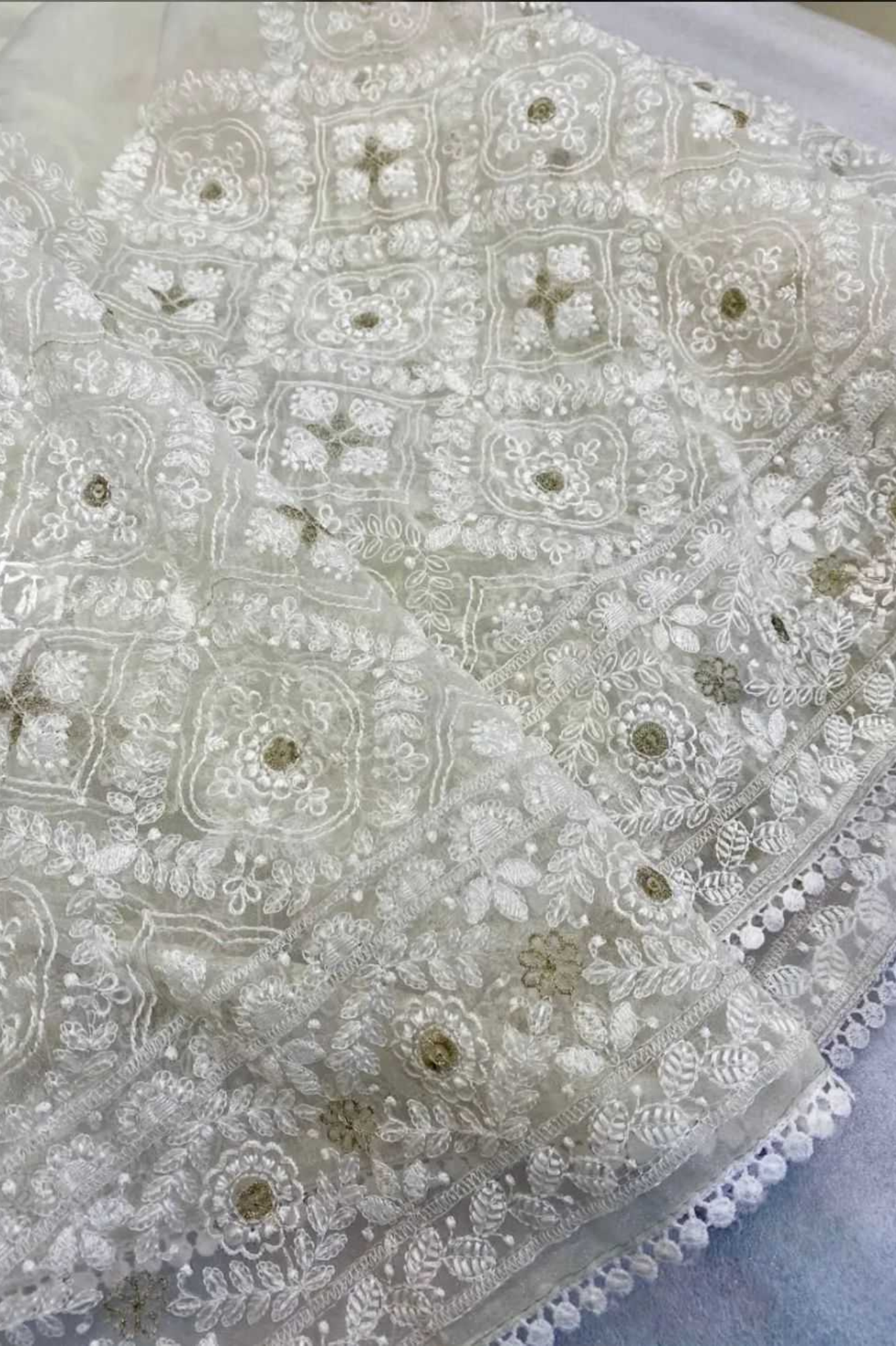 Grace meets tradition in this Pure Soft Off-White Silk Organza Saree, exquisitely adorned with Lucknowi-style embroidery and highlighted with a...