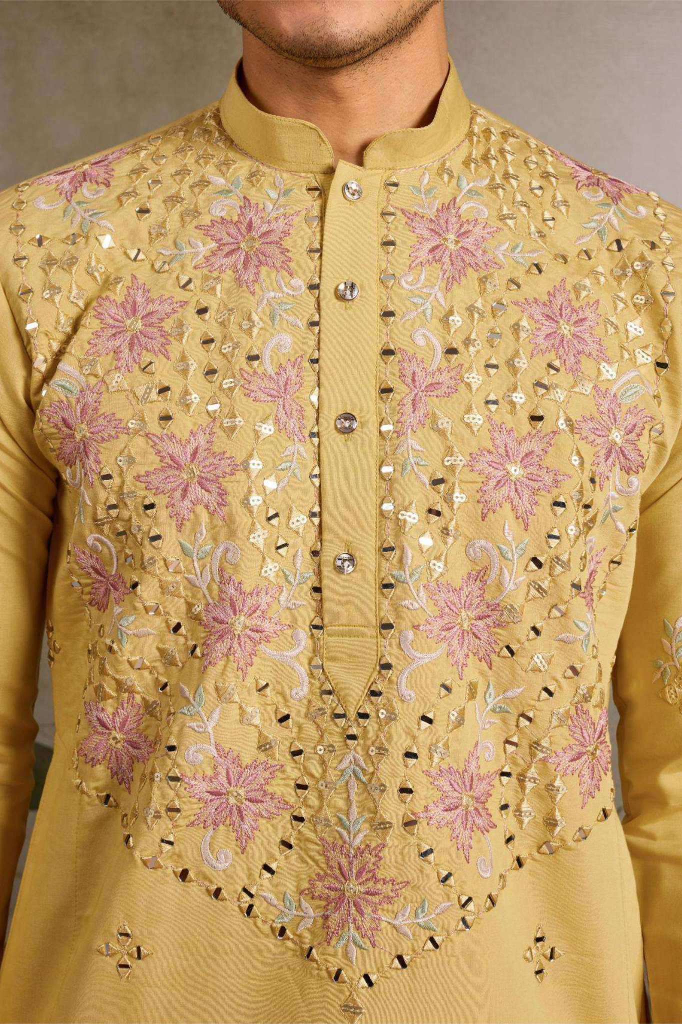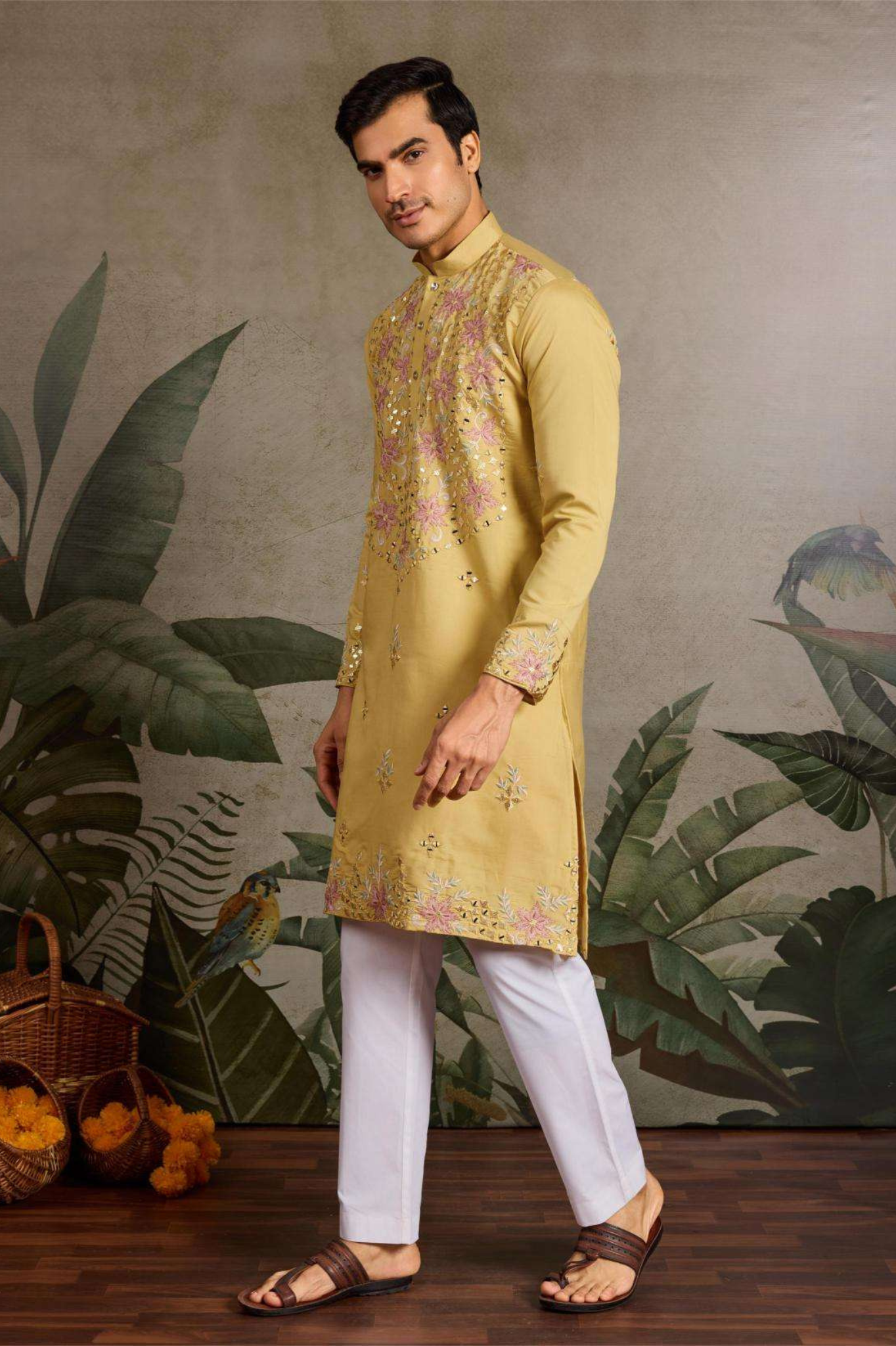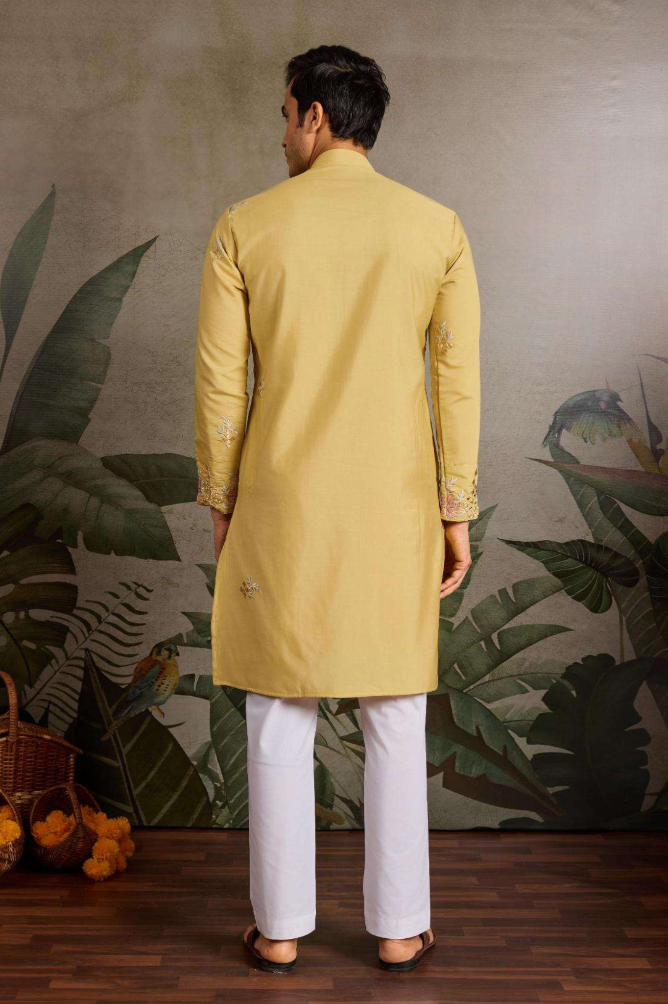 This Yellow Kurta Set is crafted for elegance and grandeur, featuring exquisite embroidery in floral patterns on the front side and sleeves with lace work (0.8 MTR) and detailed embroidery on the back side with sleeves (1.1 MTR). Paired with a crisp white pant, this outfit brings a perfect balance of regal style and modern sophistication.