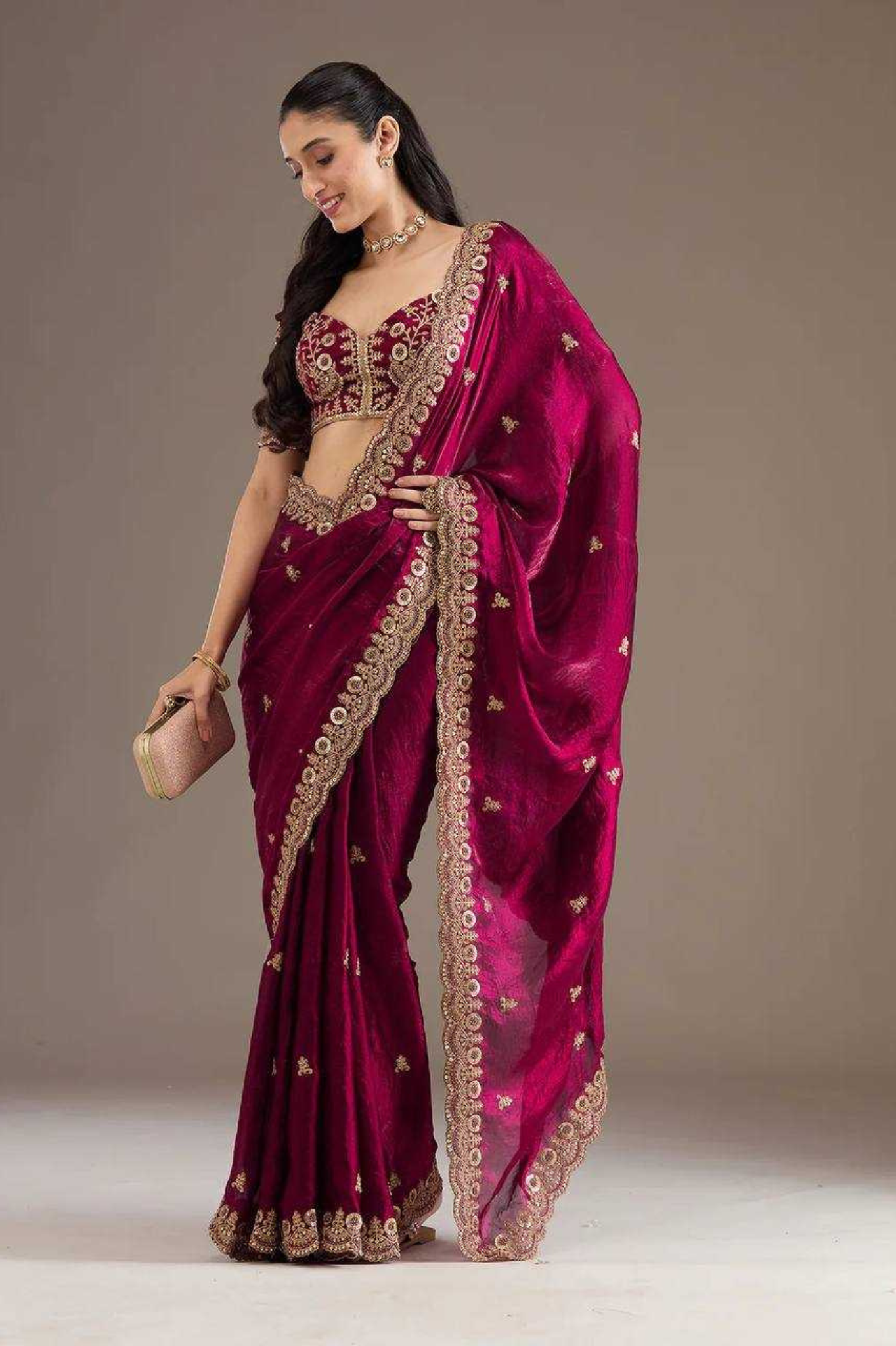 An elegant drape crafted from premium crunchy chiffon, this saree features a graceful scallop design with fine thread embroidery work, making it a timeless addition to your festive and wedding wardrobe. The satin digital print blouse complements the saree beautifully, adding a modern touch...