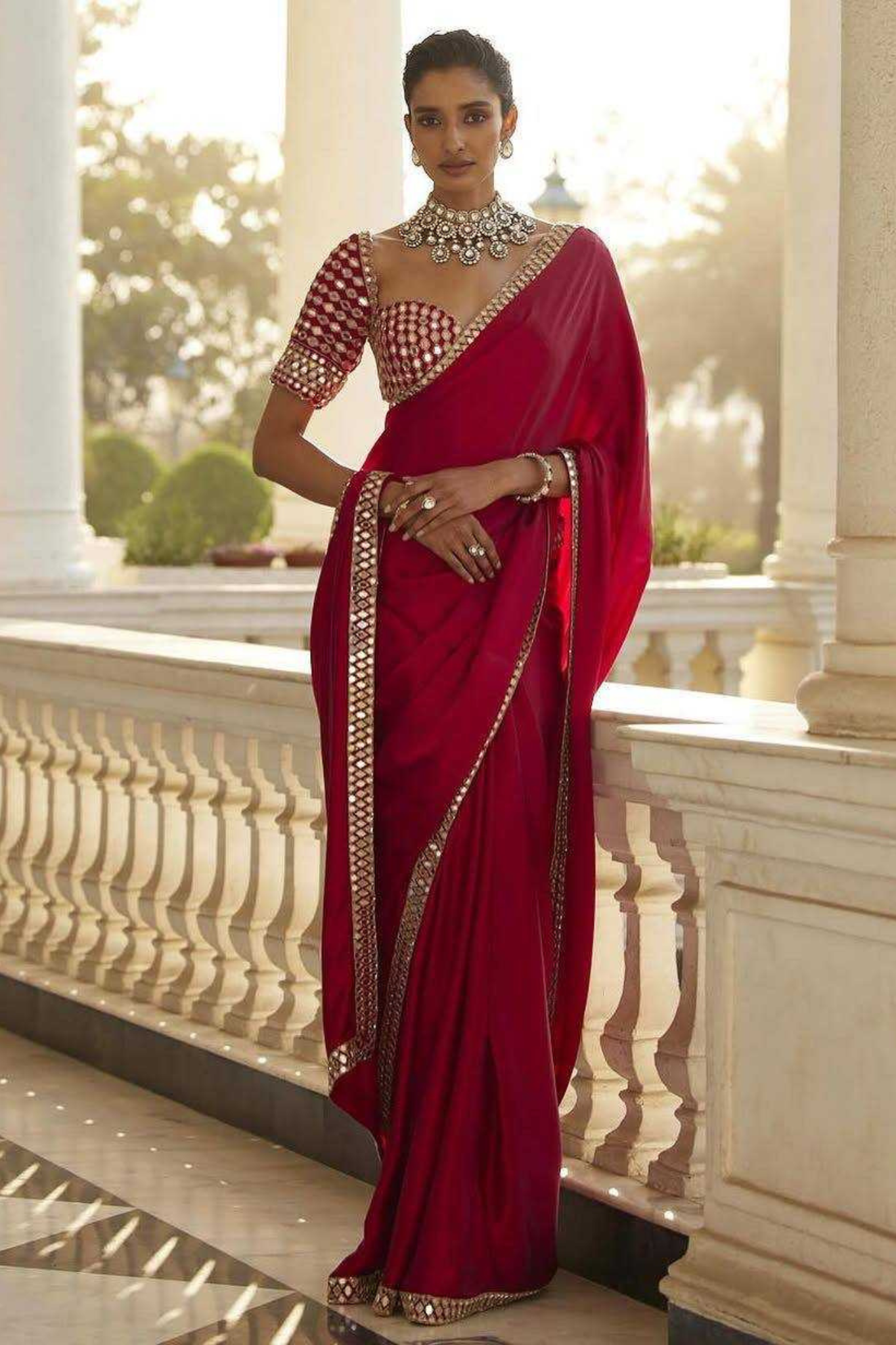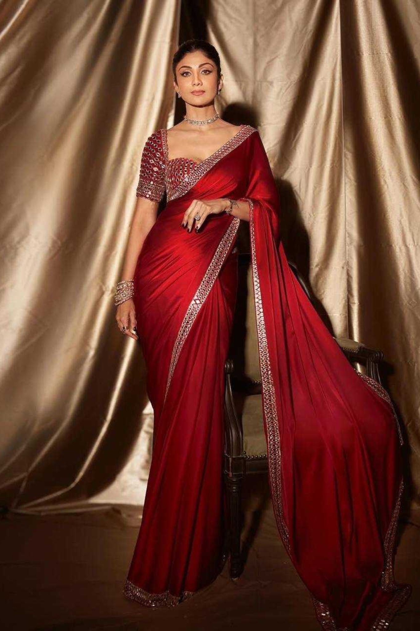 Shilpa Shetty Inspired Royal Red Satin Silk Saree with Original Mirror and Embroidery Work