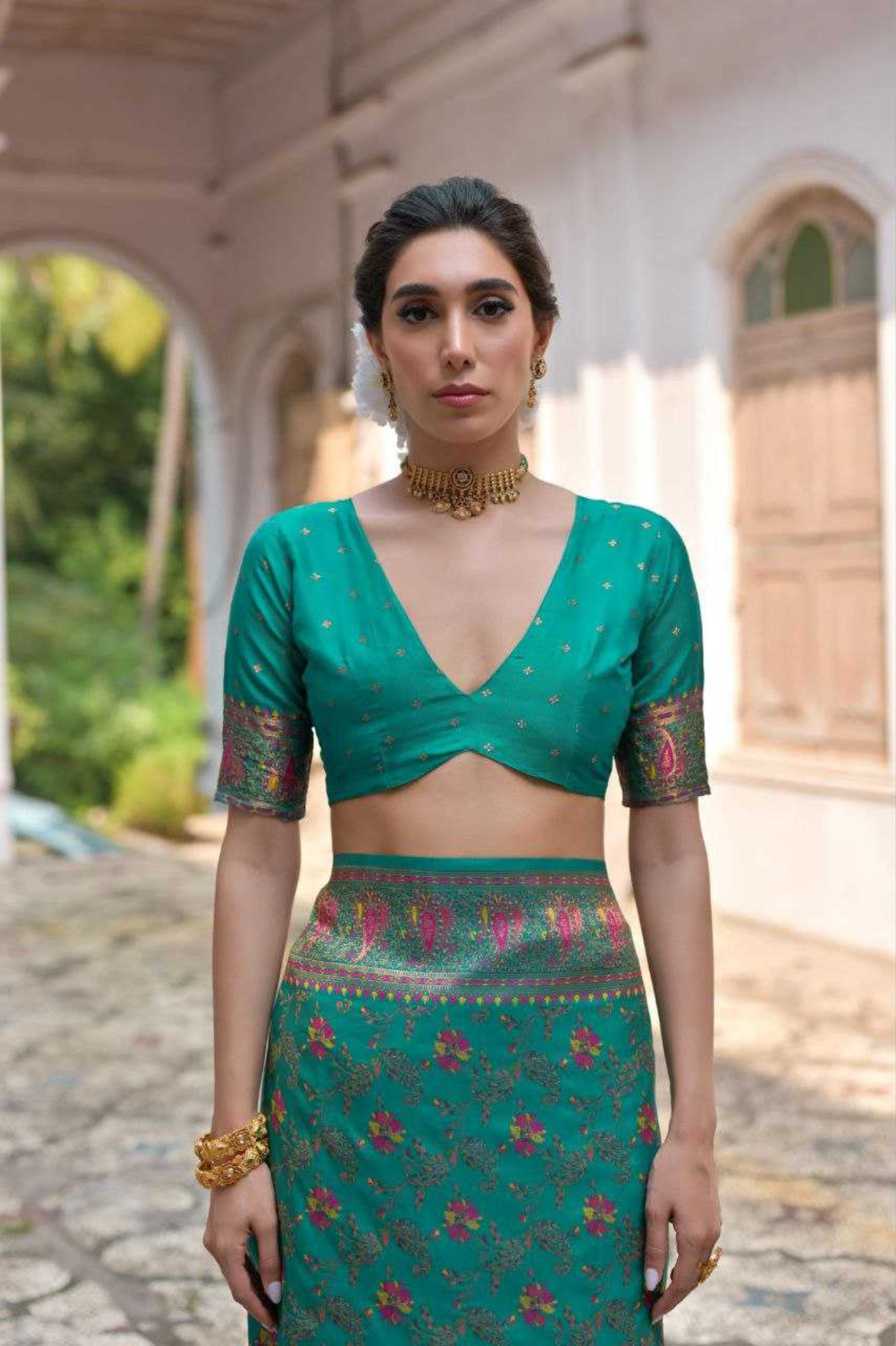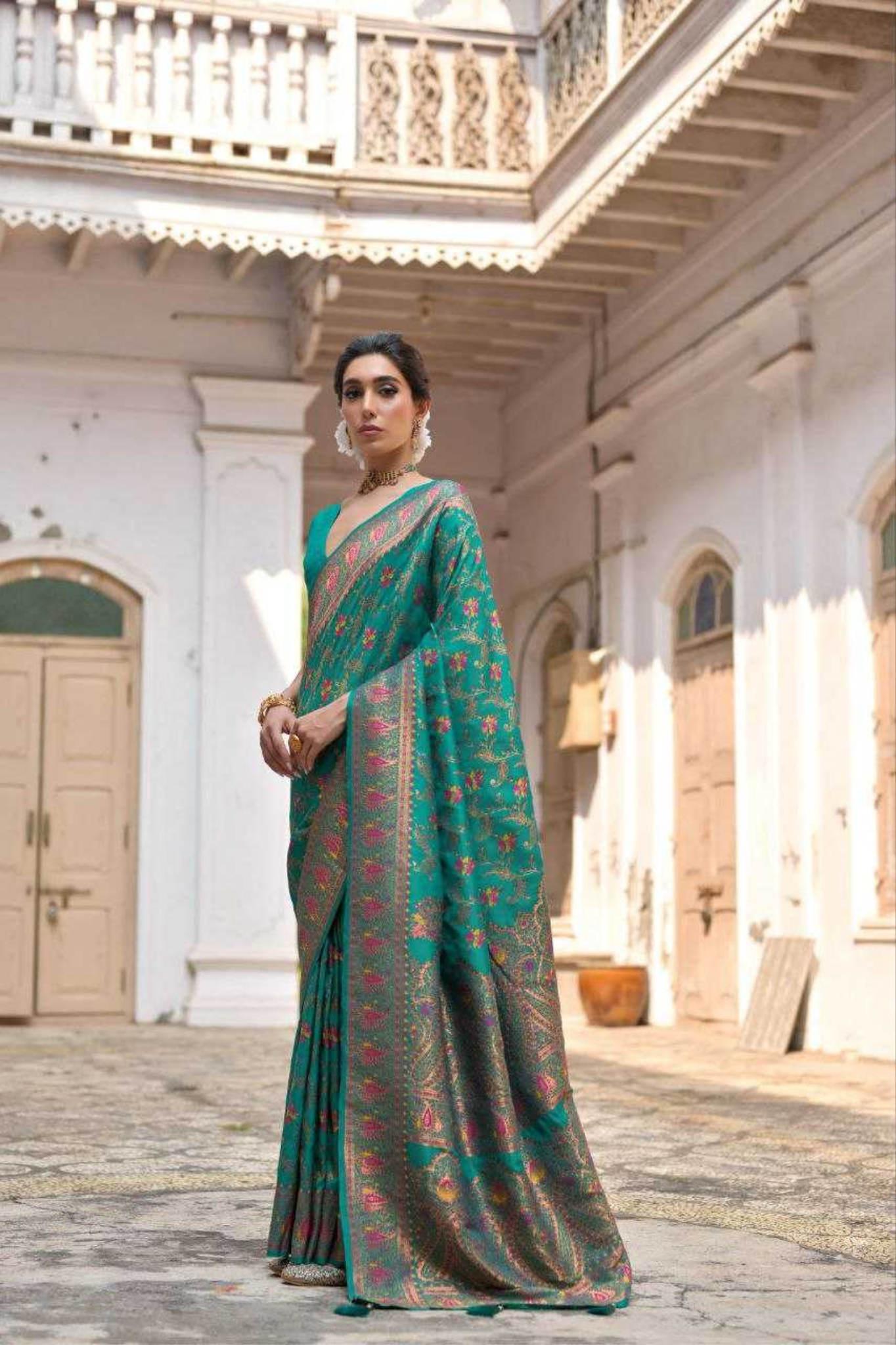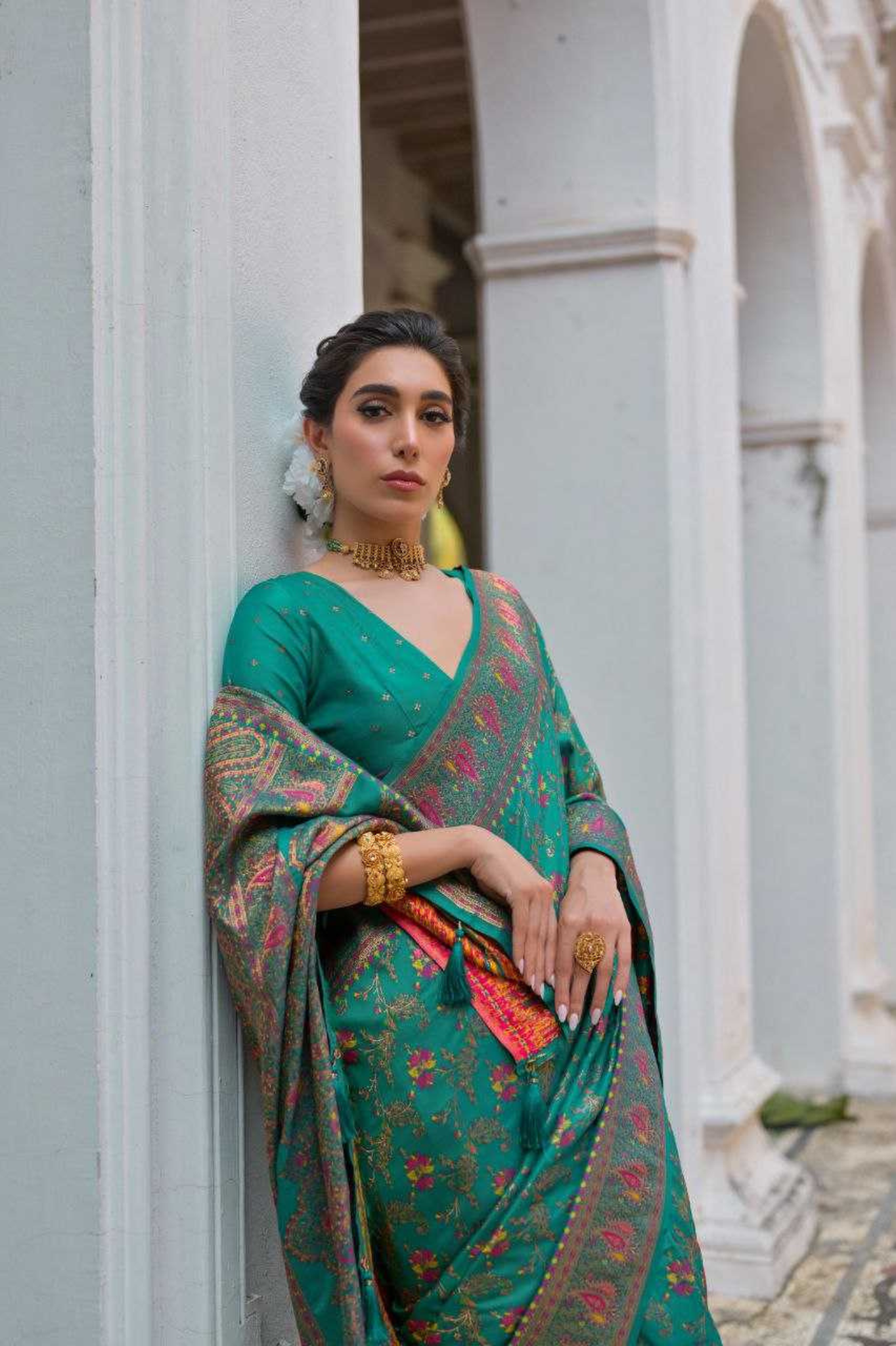 Rama Green Extra Soft Pashmina Silk Saree with Kashmiri Jal Weaving & Zari-Meena Work