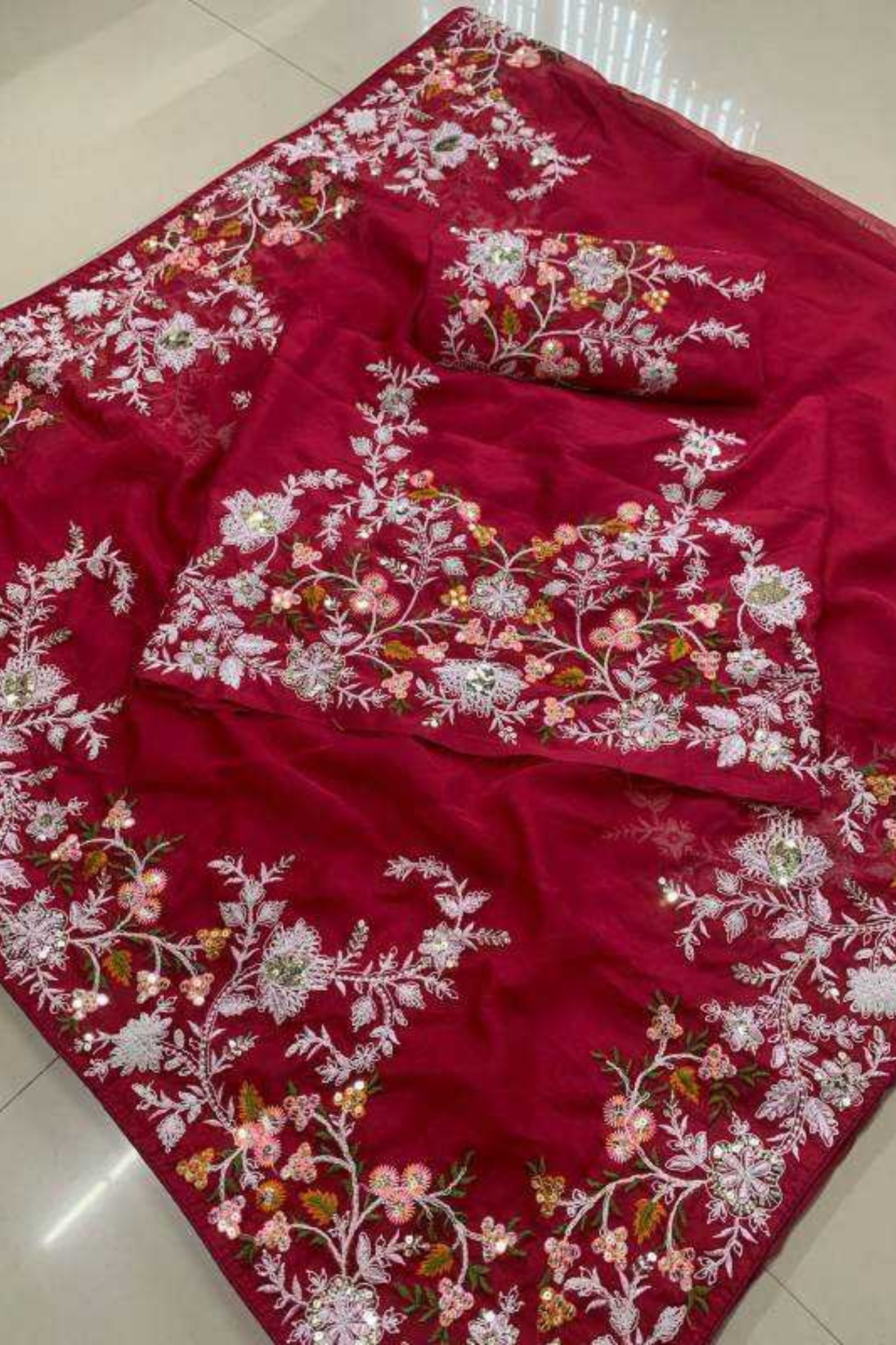 Premium Taby Organza Saree with White Codding & Multicolor Embroidery Work