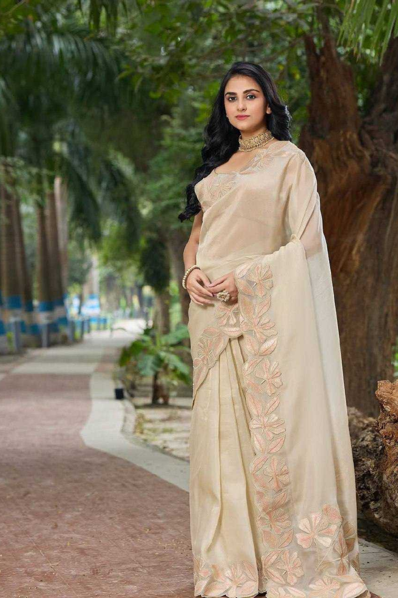 Pure Organza Silk Saree with Designer Arco Cut Border & Sequins Embroidery Work