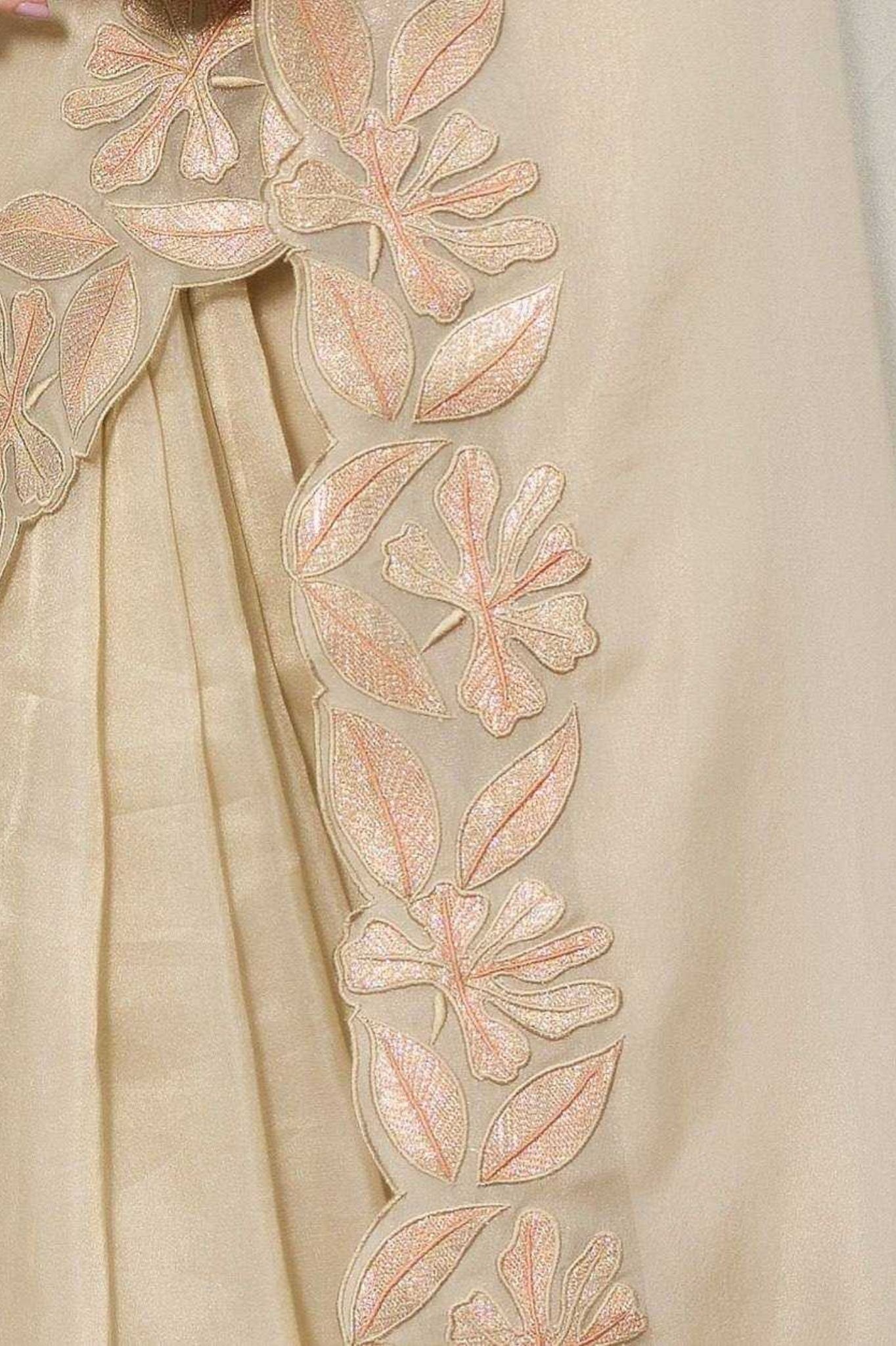 Shine with elegance in this golden saree crafted from heavy smooth gold crush fabric. The drape is beautifully adorned with designer moti and zigzag striped sequin embroidery work all over, giving it a rich and festive appeal. Paired with a heavy mono Banglori plain...