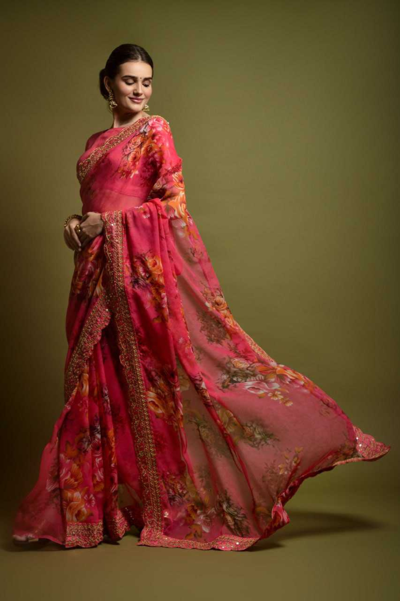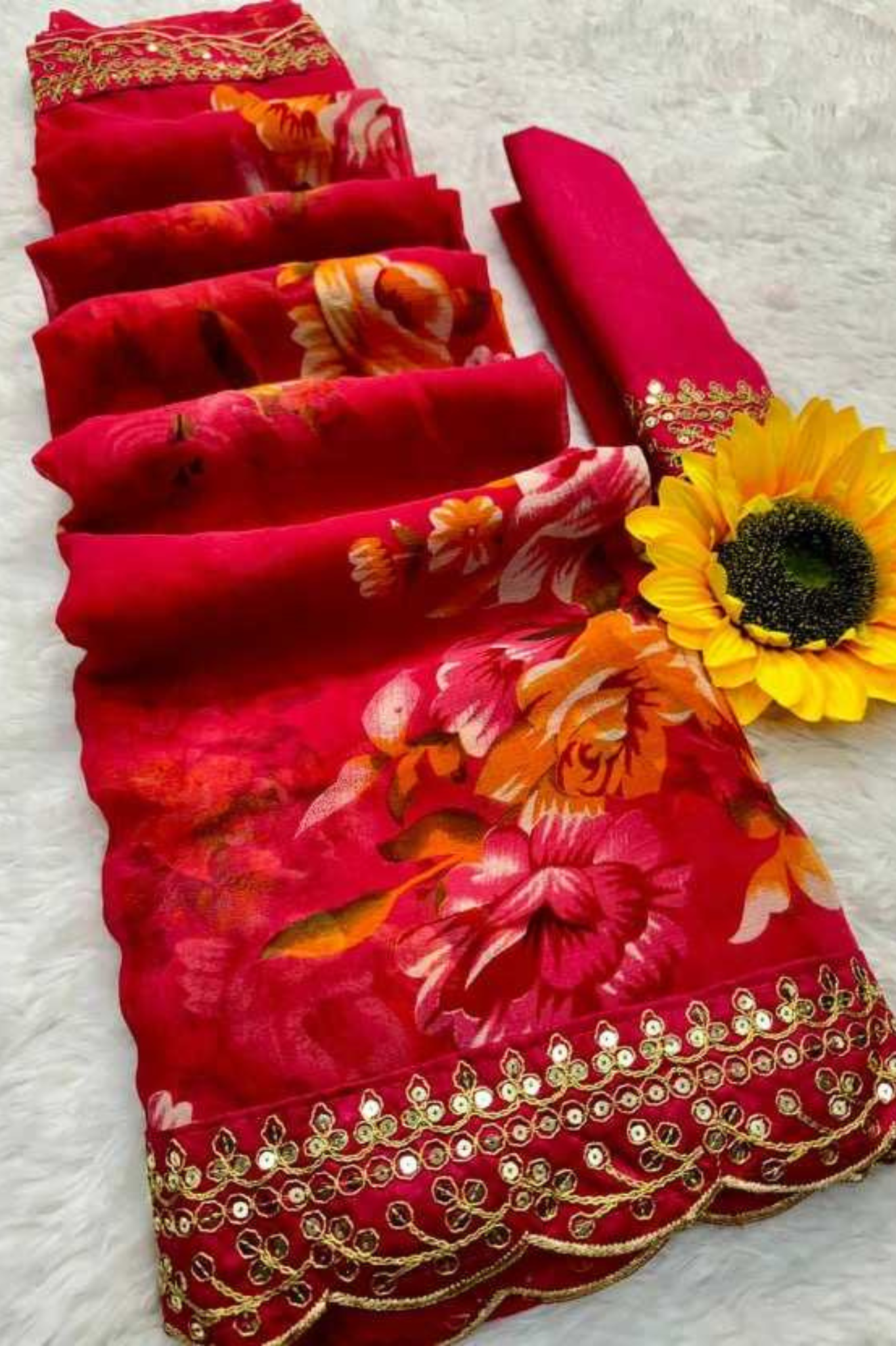 Embrace timeless elegance with this Rani georgette saree, featuring a bold floral print and a stunning golden embroidered lace border. The lightweight georgette fabric drapes beautifully, while the vibrant blooms add a touch of contemporary charm. Paired with a heavy Bengalori satin blouse finished with intricate lace, this saree is perfect for cocktail nights, festive celebrations, and special occasions.