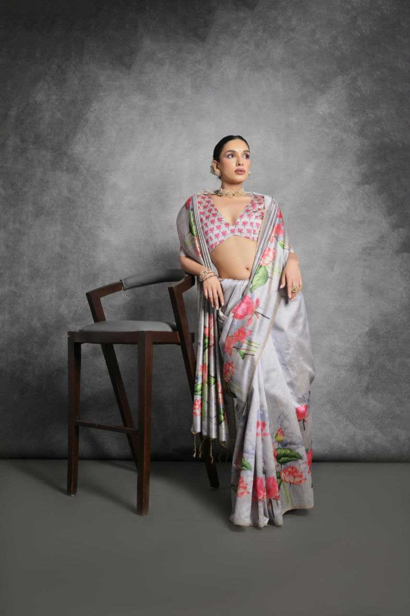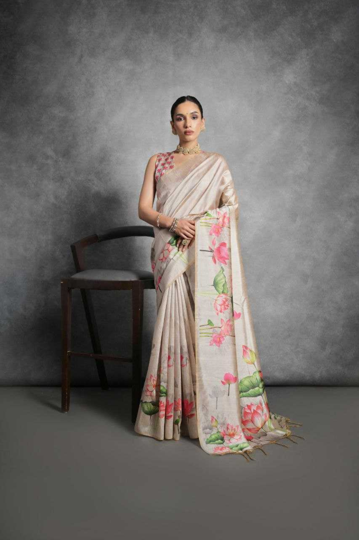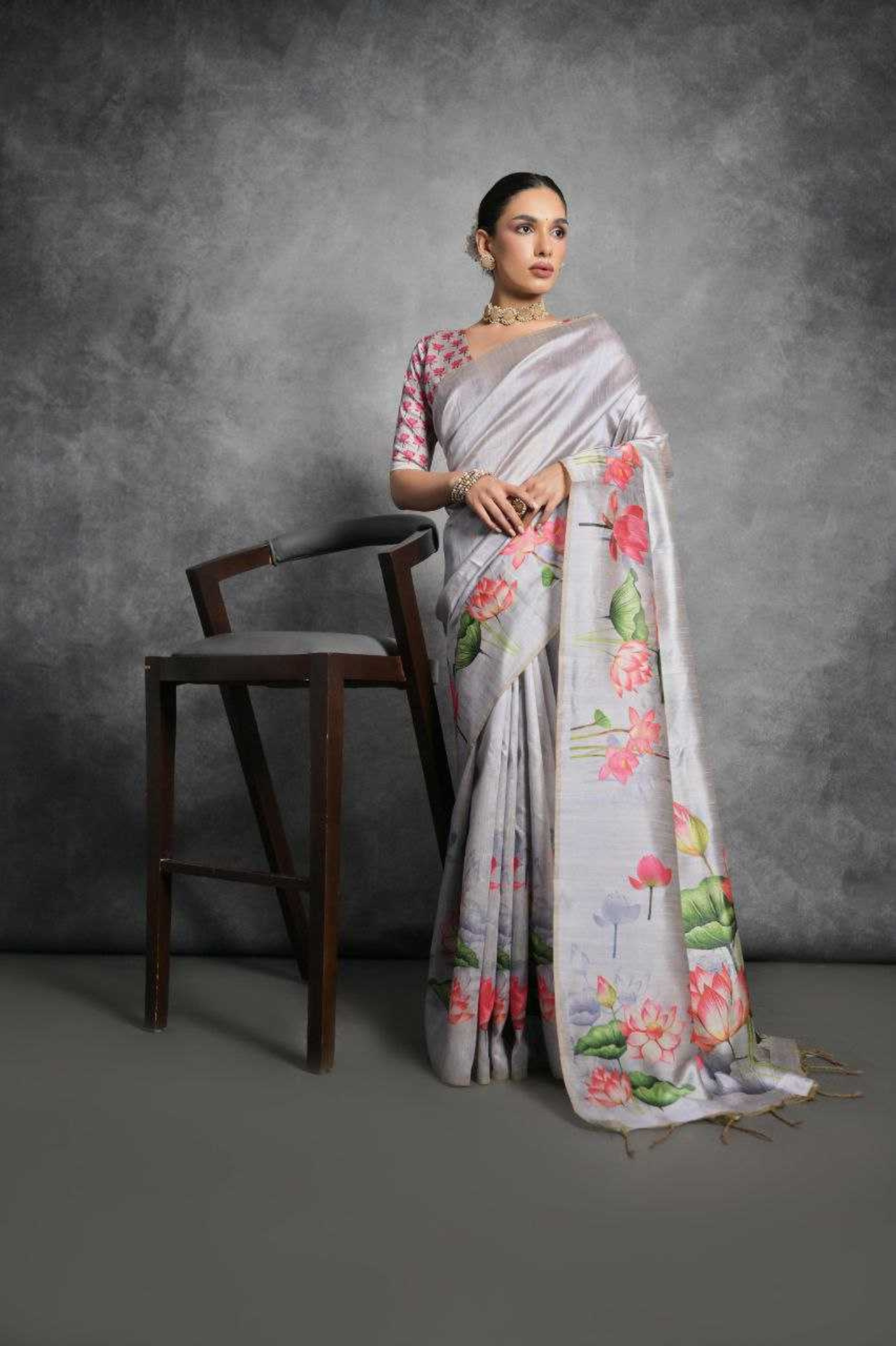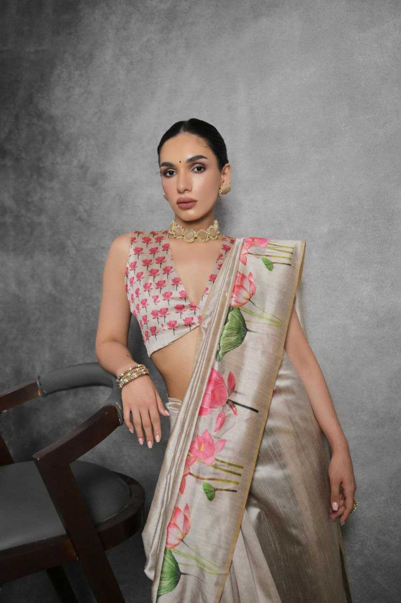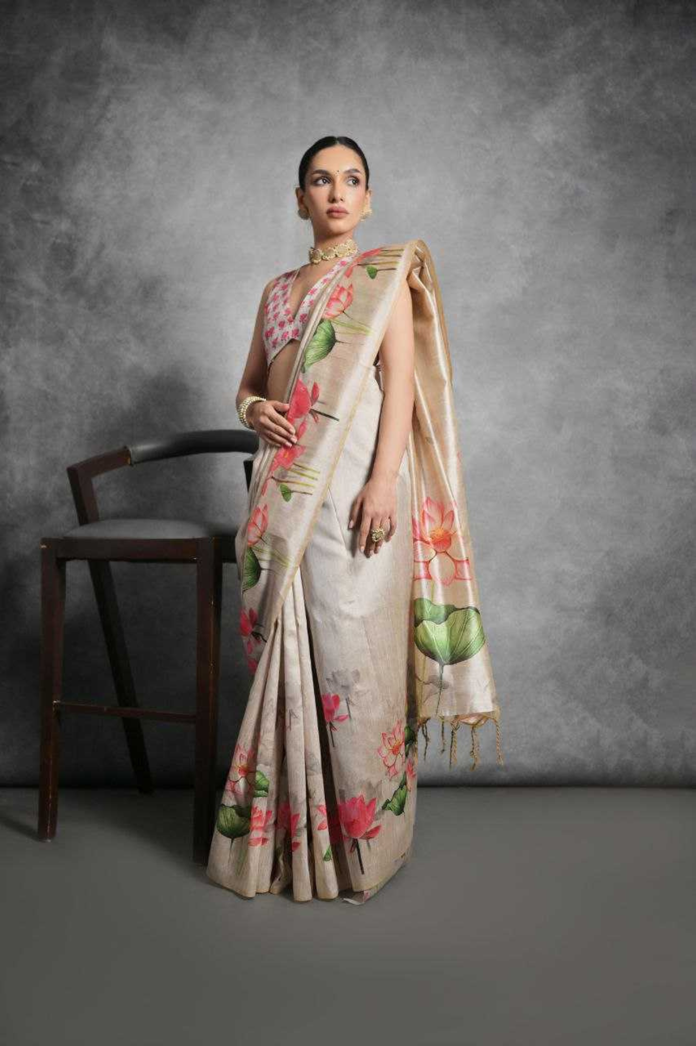 Soft Tussar Silk Saree with Elegant Lotus Print & Floral Design All Over
