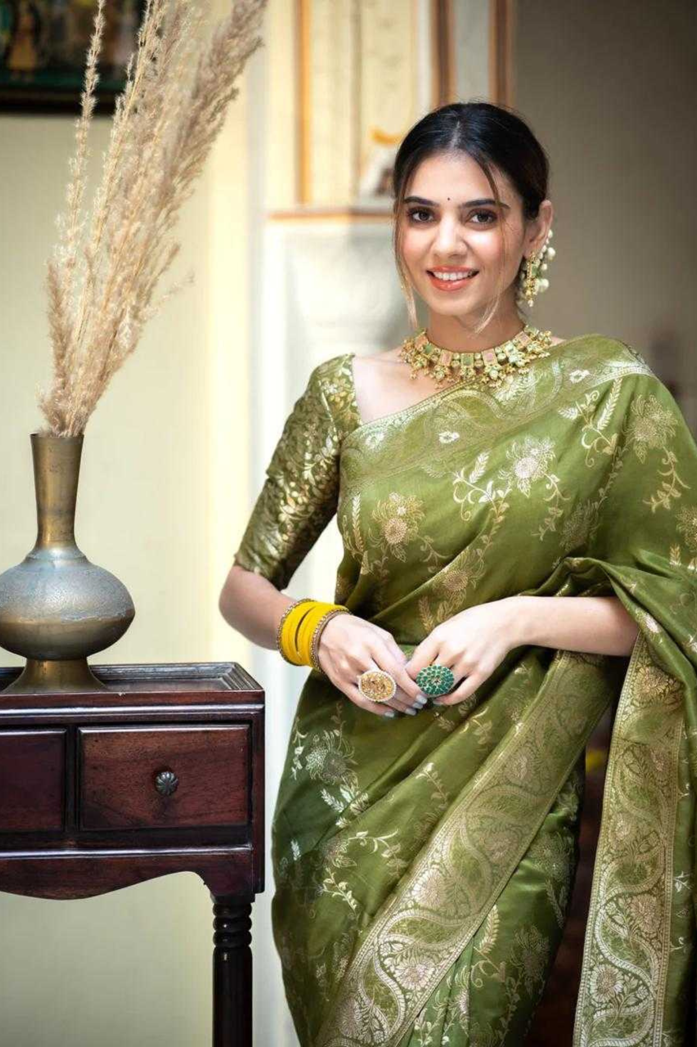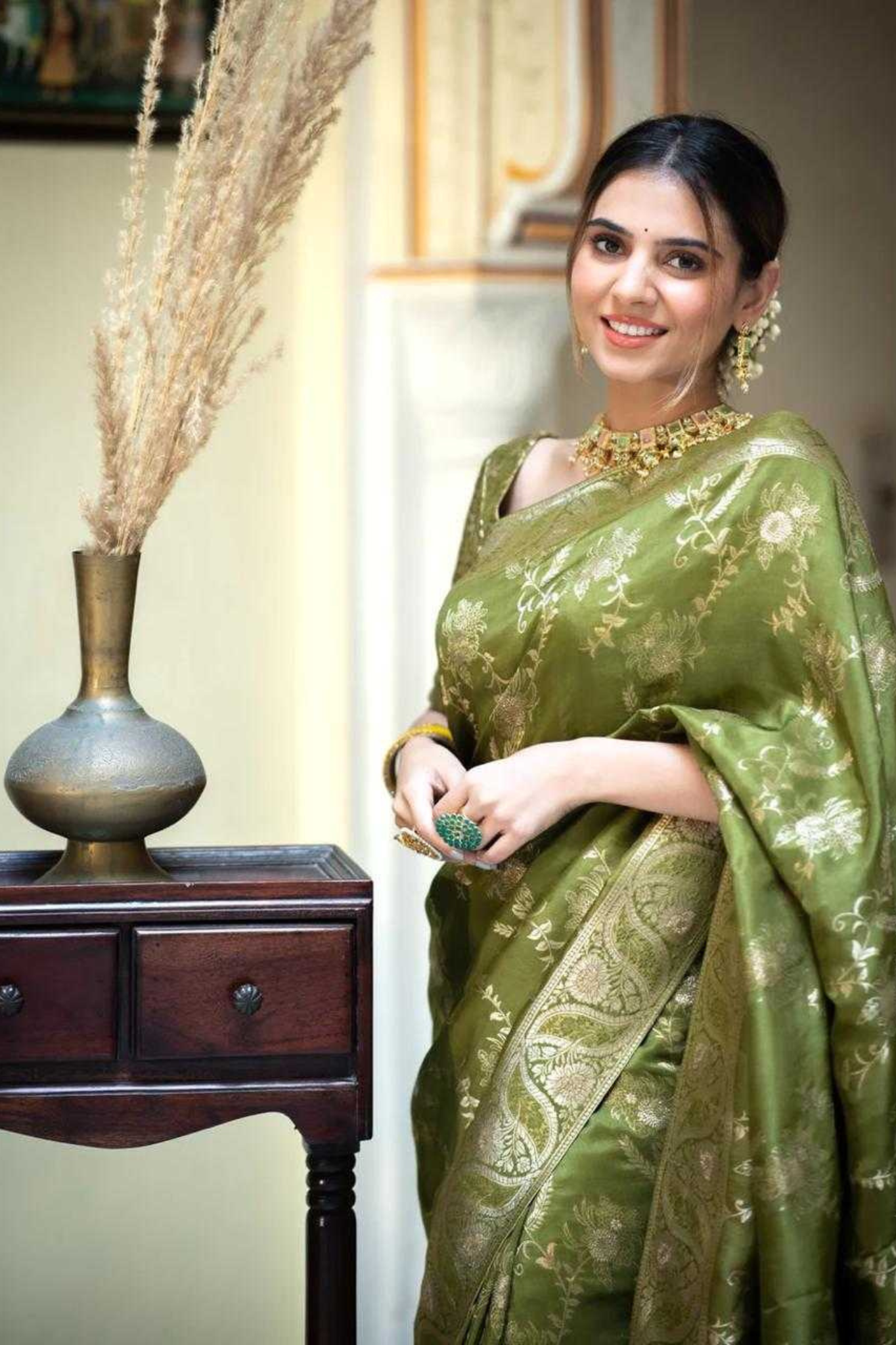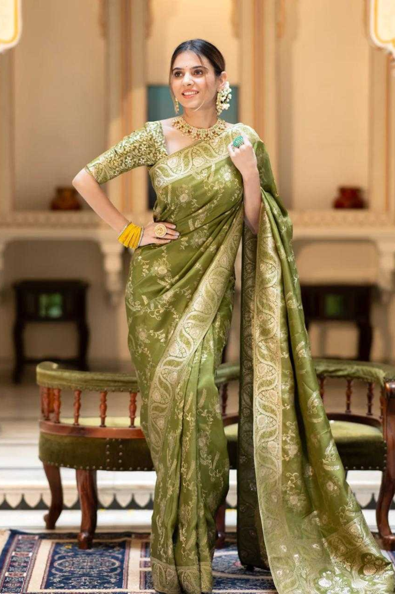 Mehendi Kanjivaram Banarasi Silk Saree with Rich Zari Weaving & Jacquard Blouse