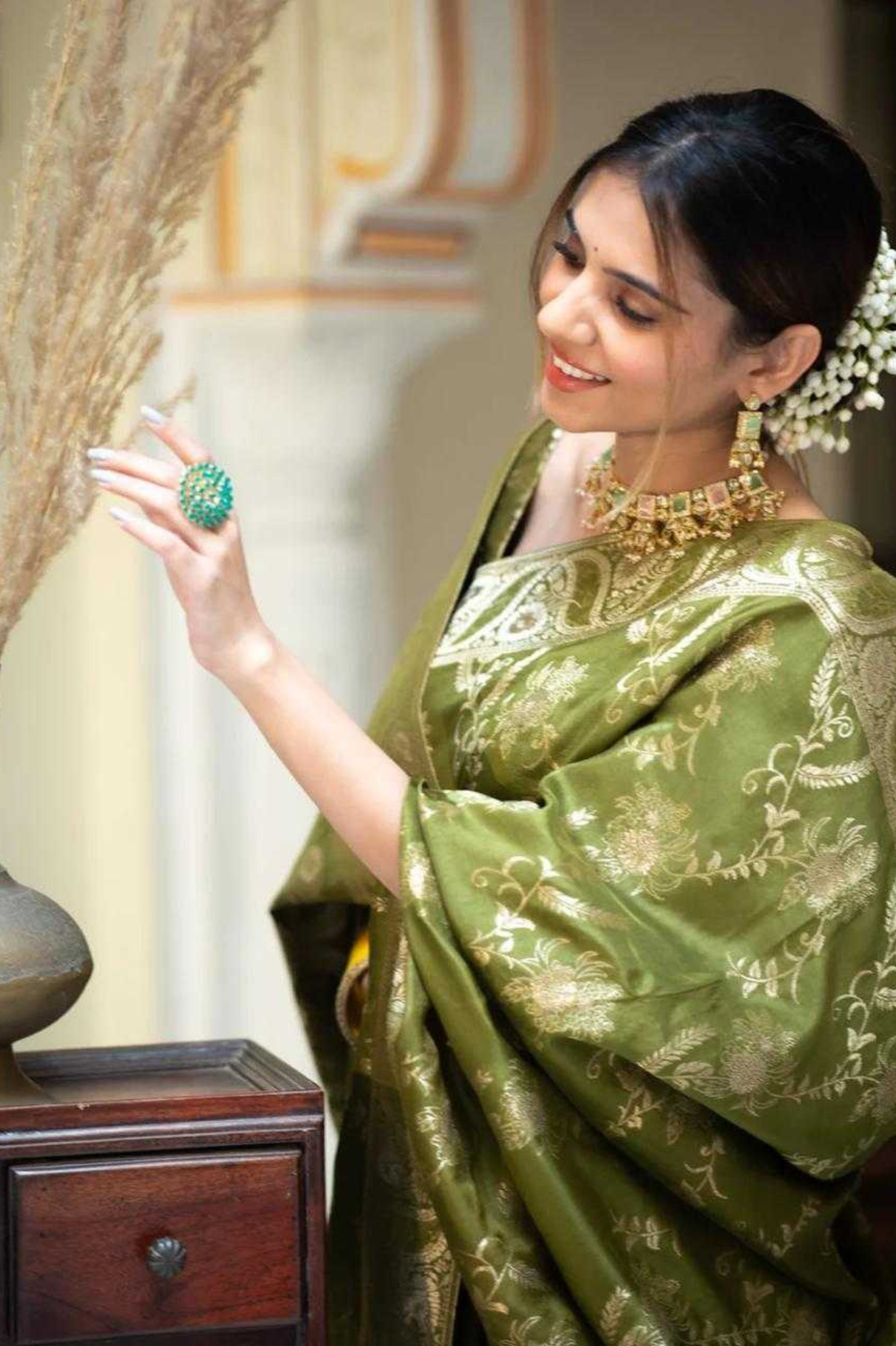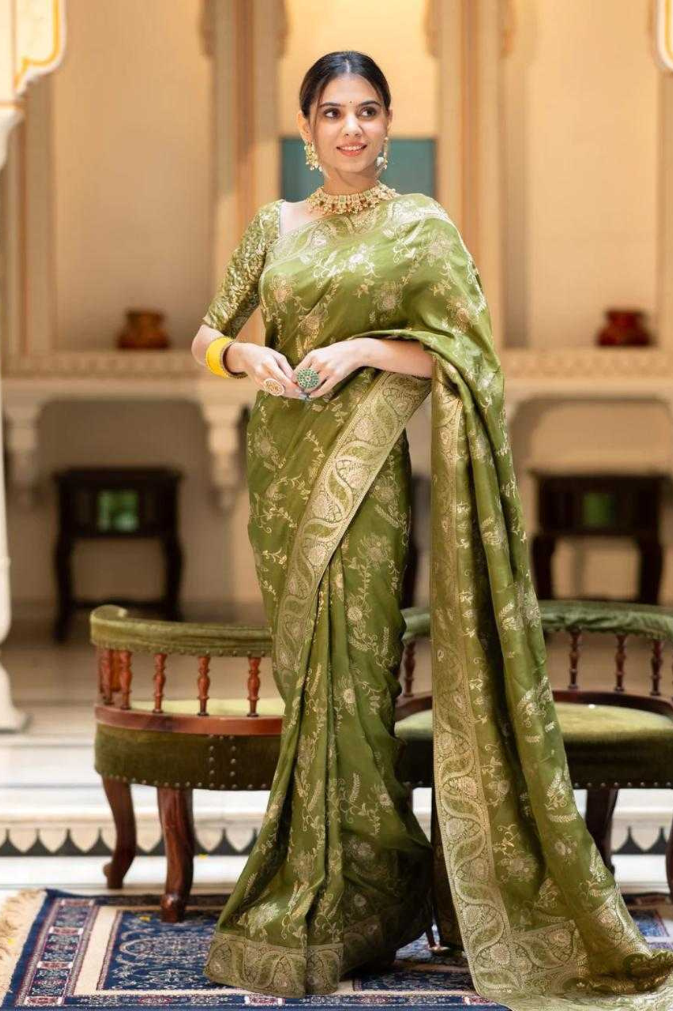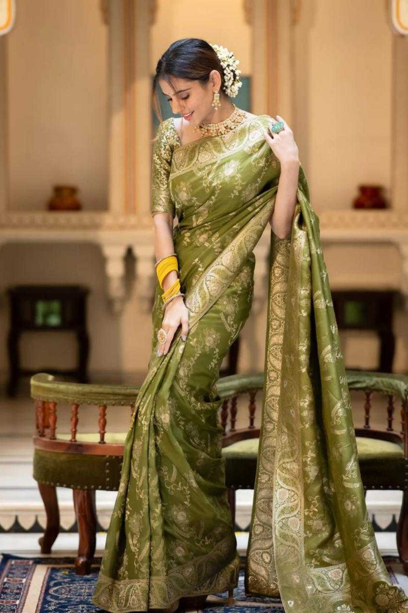 Mehendi Kanjivaram Banarasi Silk Saree with Rich Zari Weaving & Jacquard Blouse