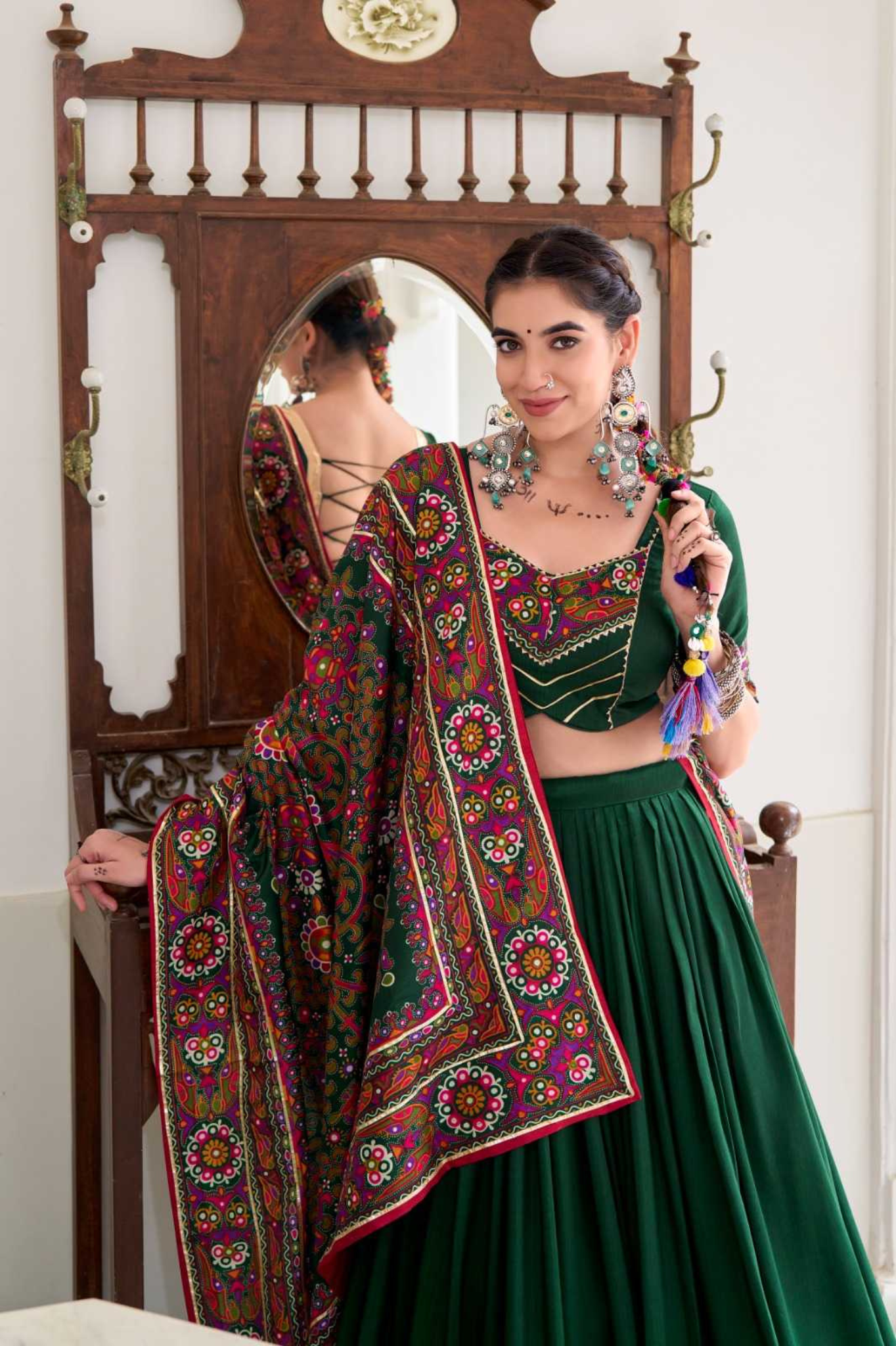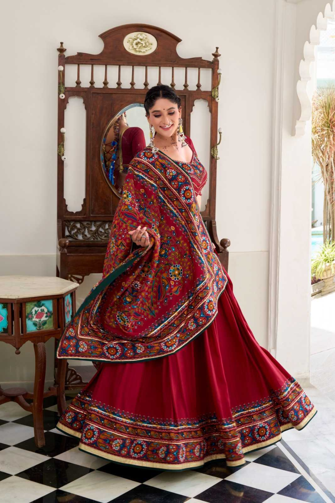 Celebrate tradition with this stunning Gamthi Print Lehenga Set in rich Tassar Silk, highlighted with embossed designs and delicate Gotta Patti lace work. Its vibrant colors and intricate detailing bring alive the essence of Indian festivities, making it a perfect choice for Navratri, weddings, and cultural events.