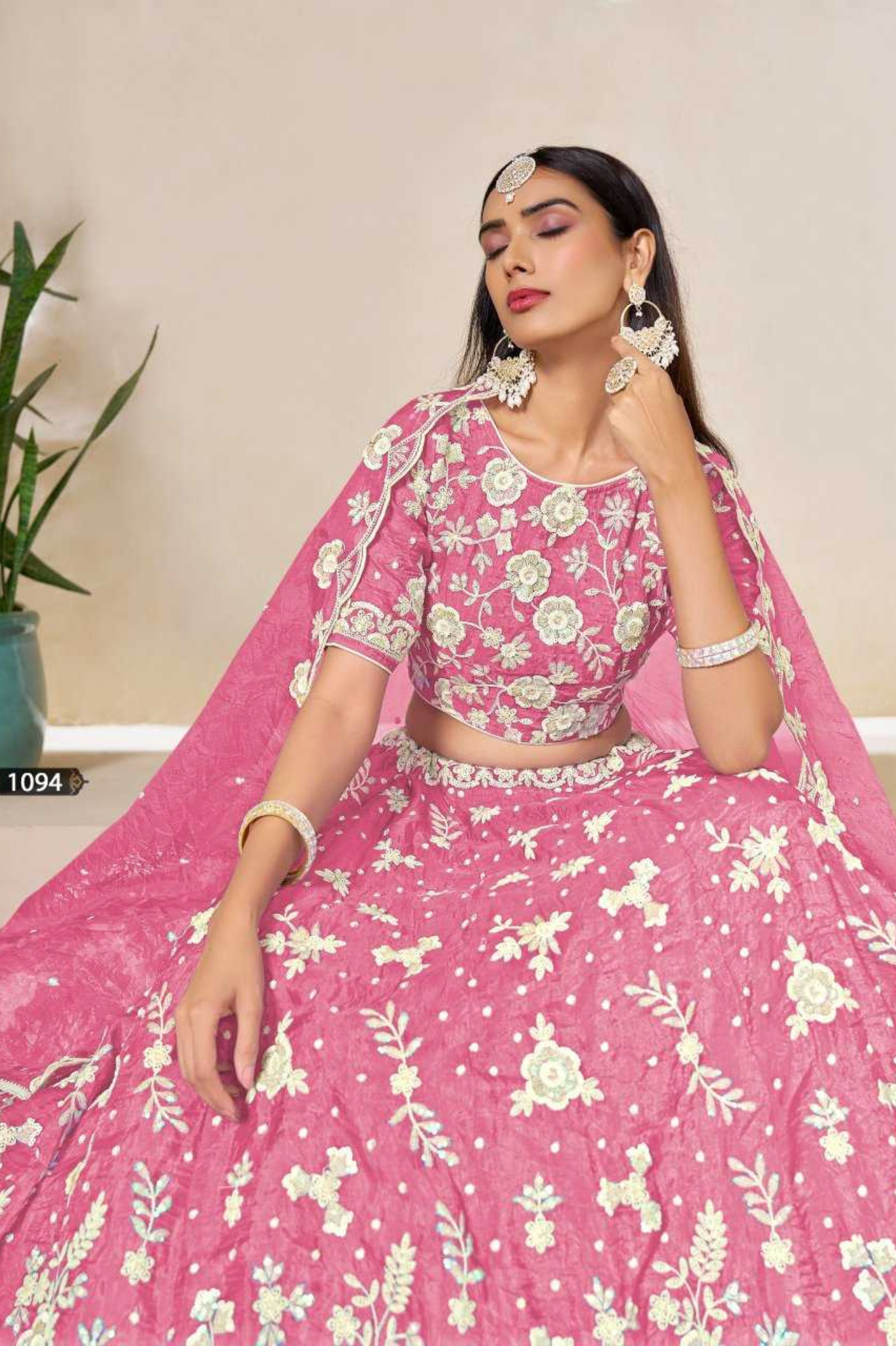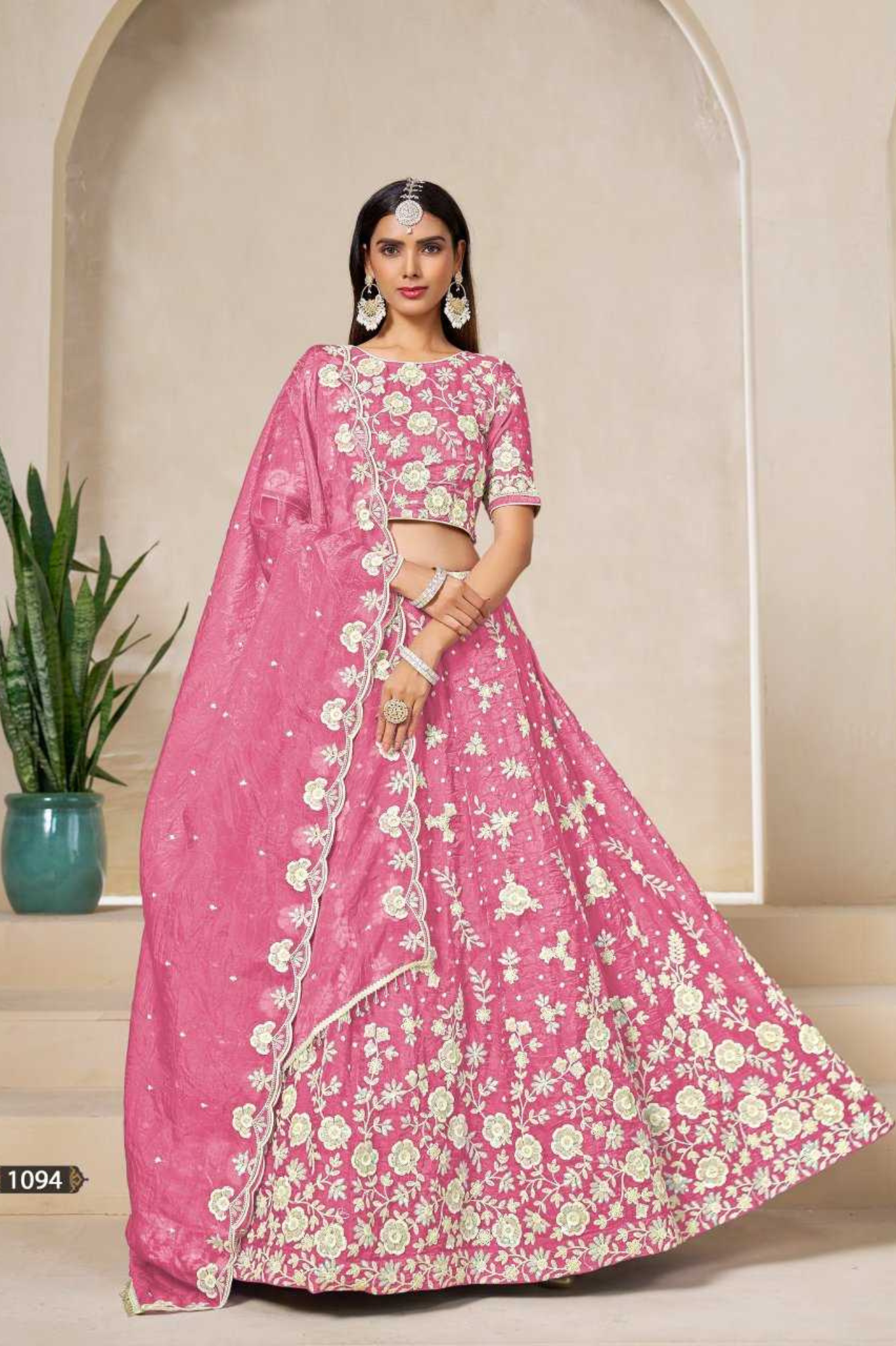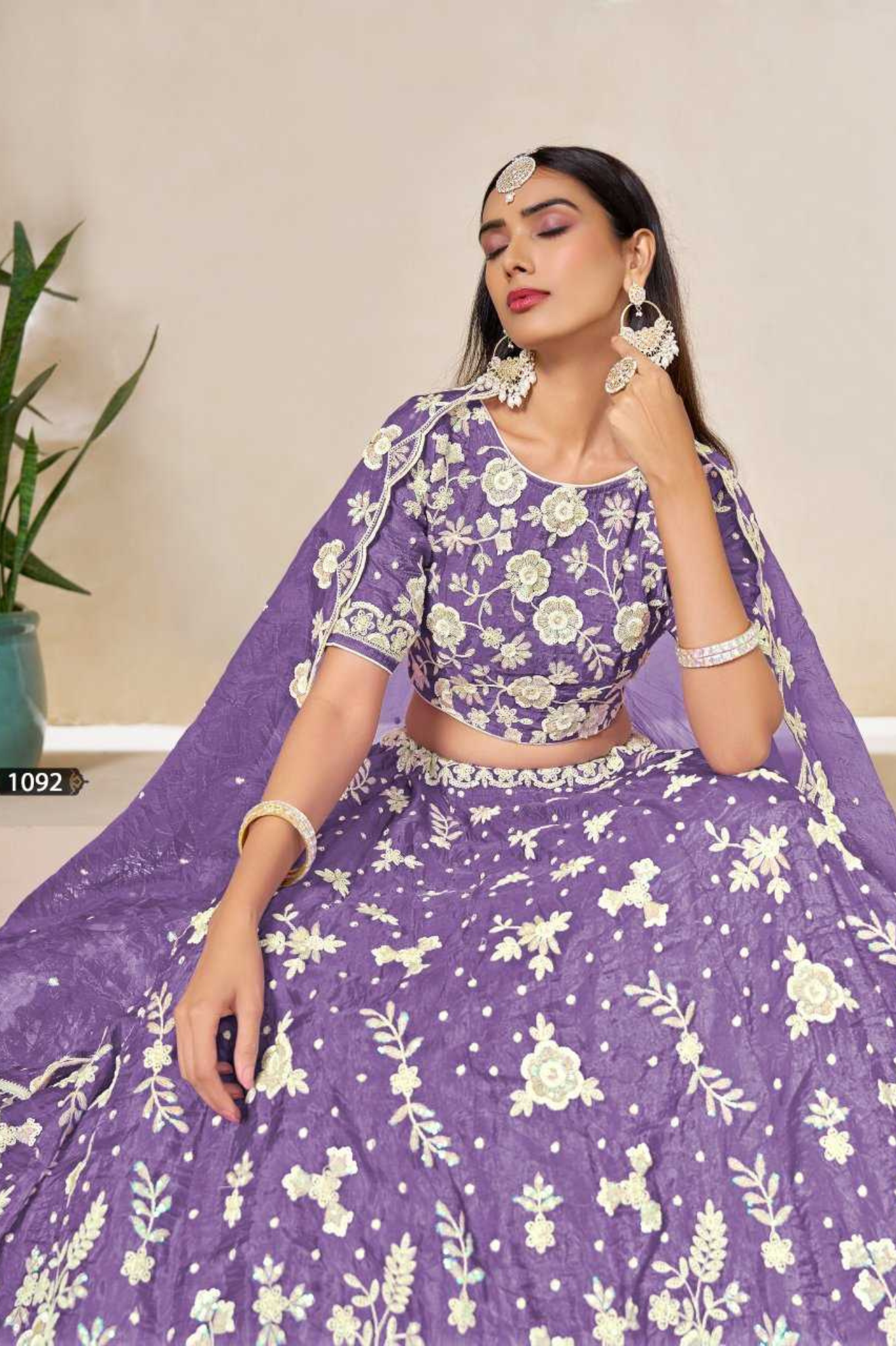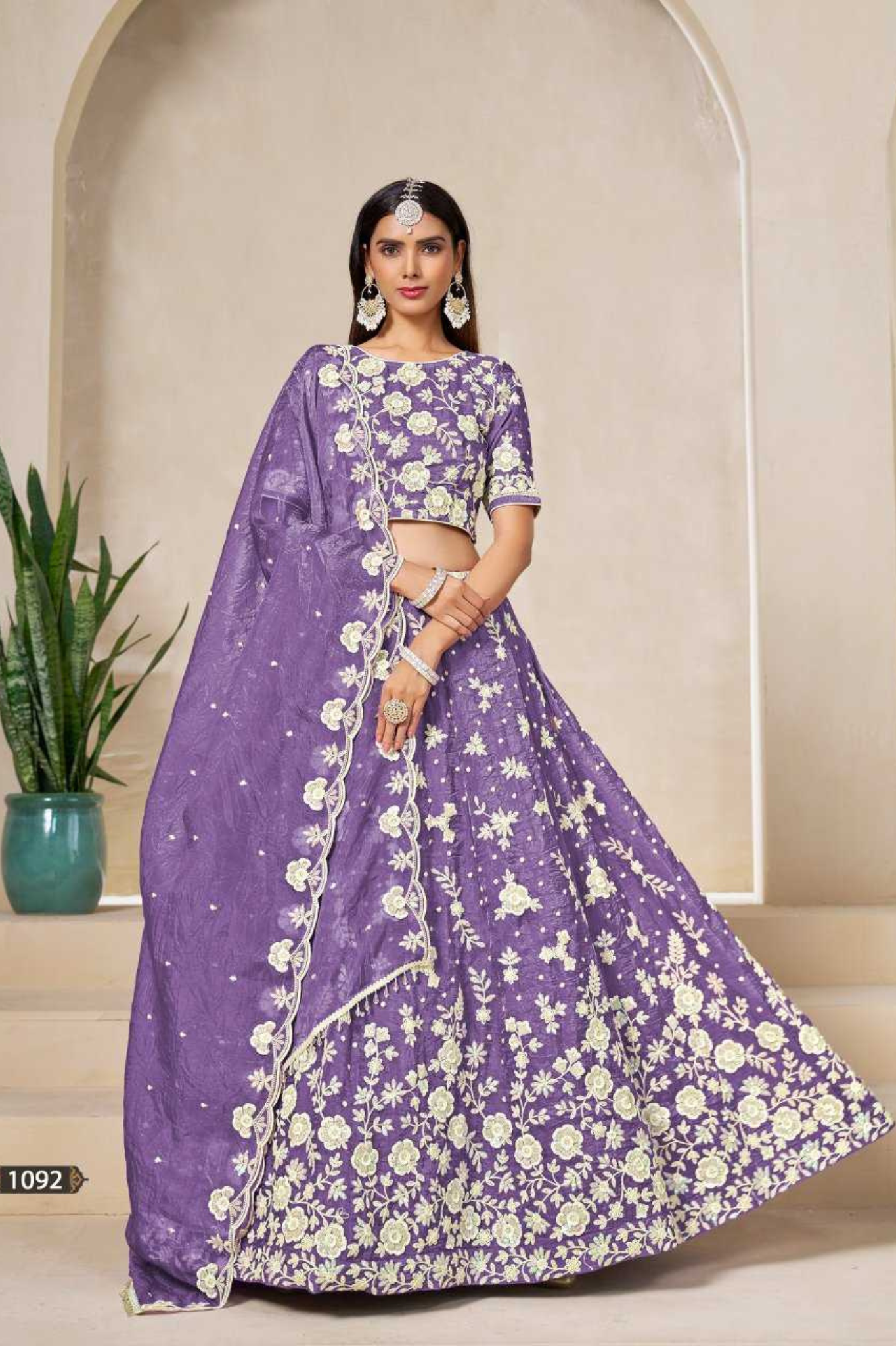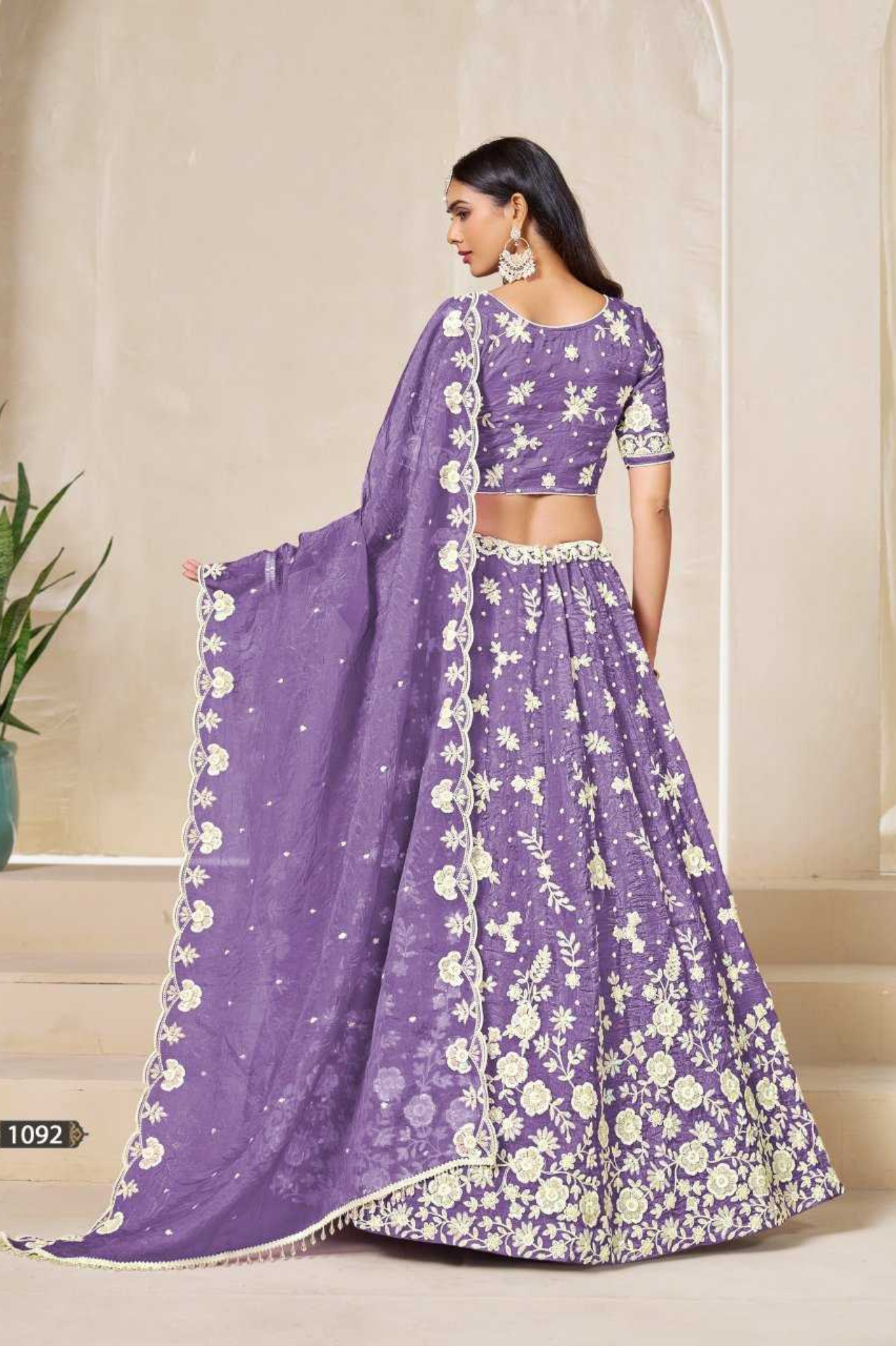 Step into timeless elegance with this Soft Crush Fil Organza Silk Lehenga, beautifully detailed with delicate embroidery work. The lightweight yet regal fabric flows effortlessly, making it a perfect choice for weddings, festive occasions, and grand celebrations.