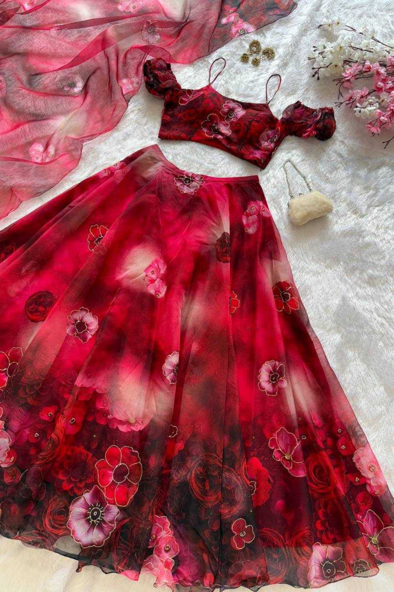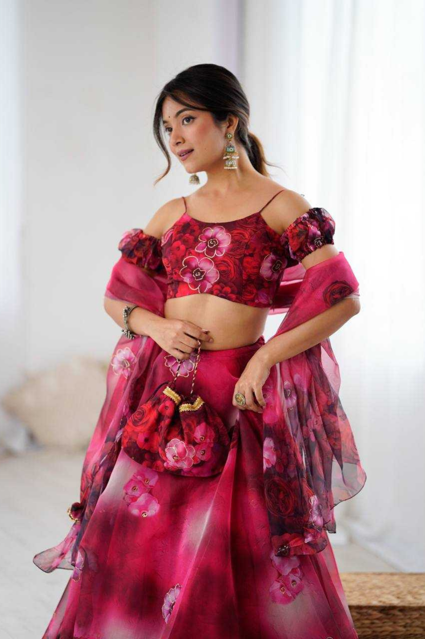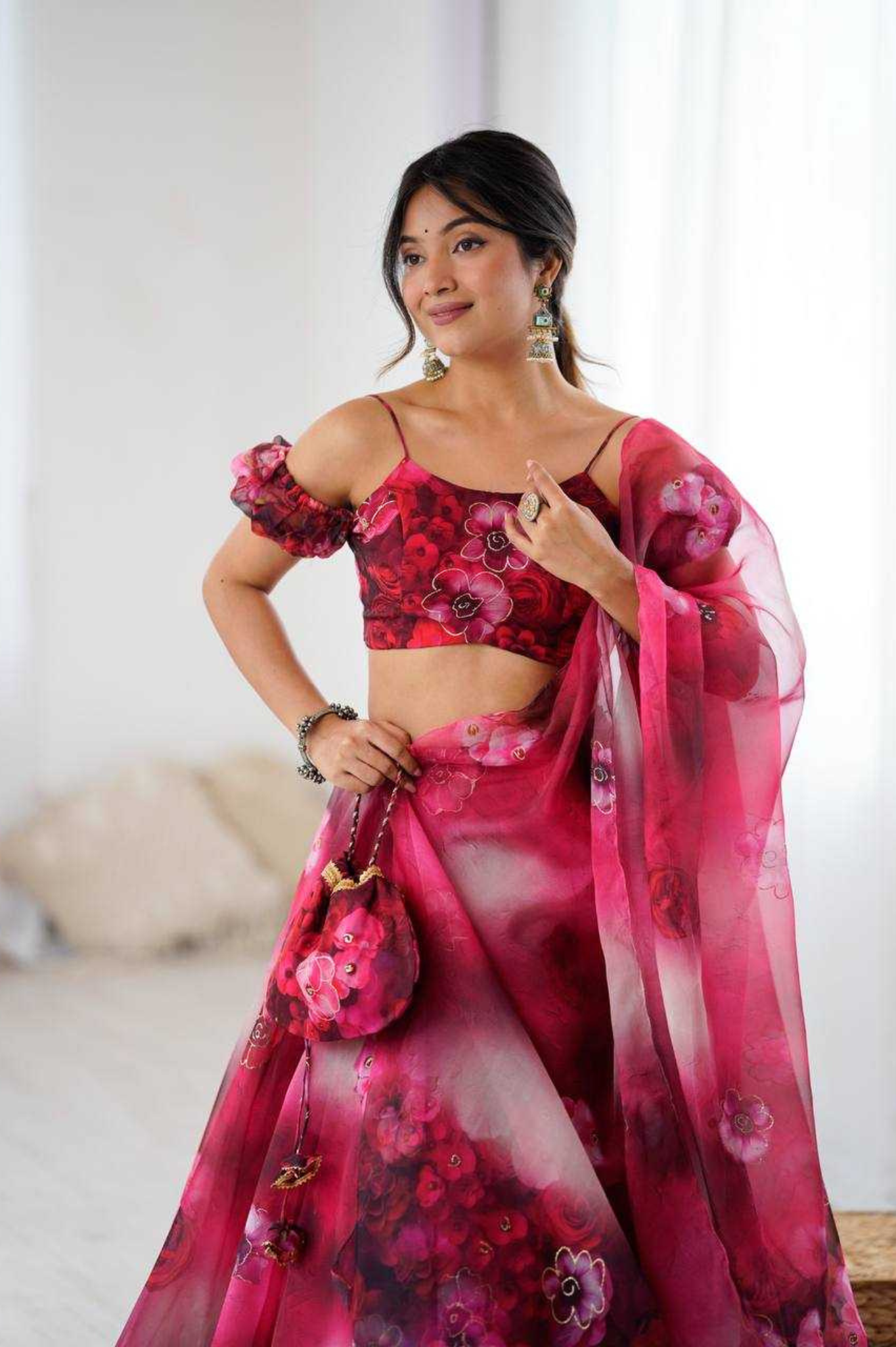 Turn heads with this exquisite pure organza digital print lehenga set, enhanced with elegant zari work. The vibrant hues, paired with luxurious detailing, make it a perfect pick for festive celebrations, weddings, and sangeet nights.