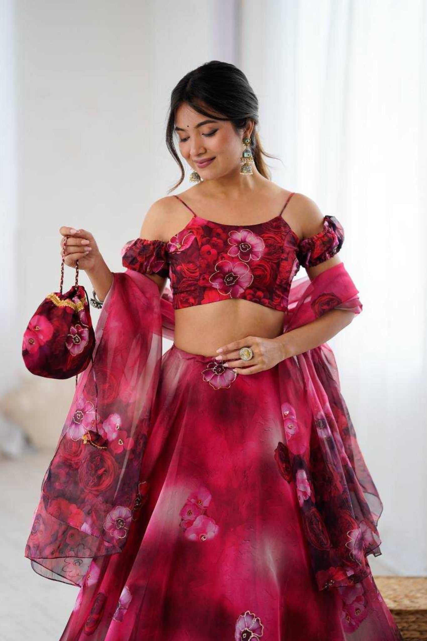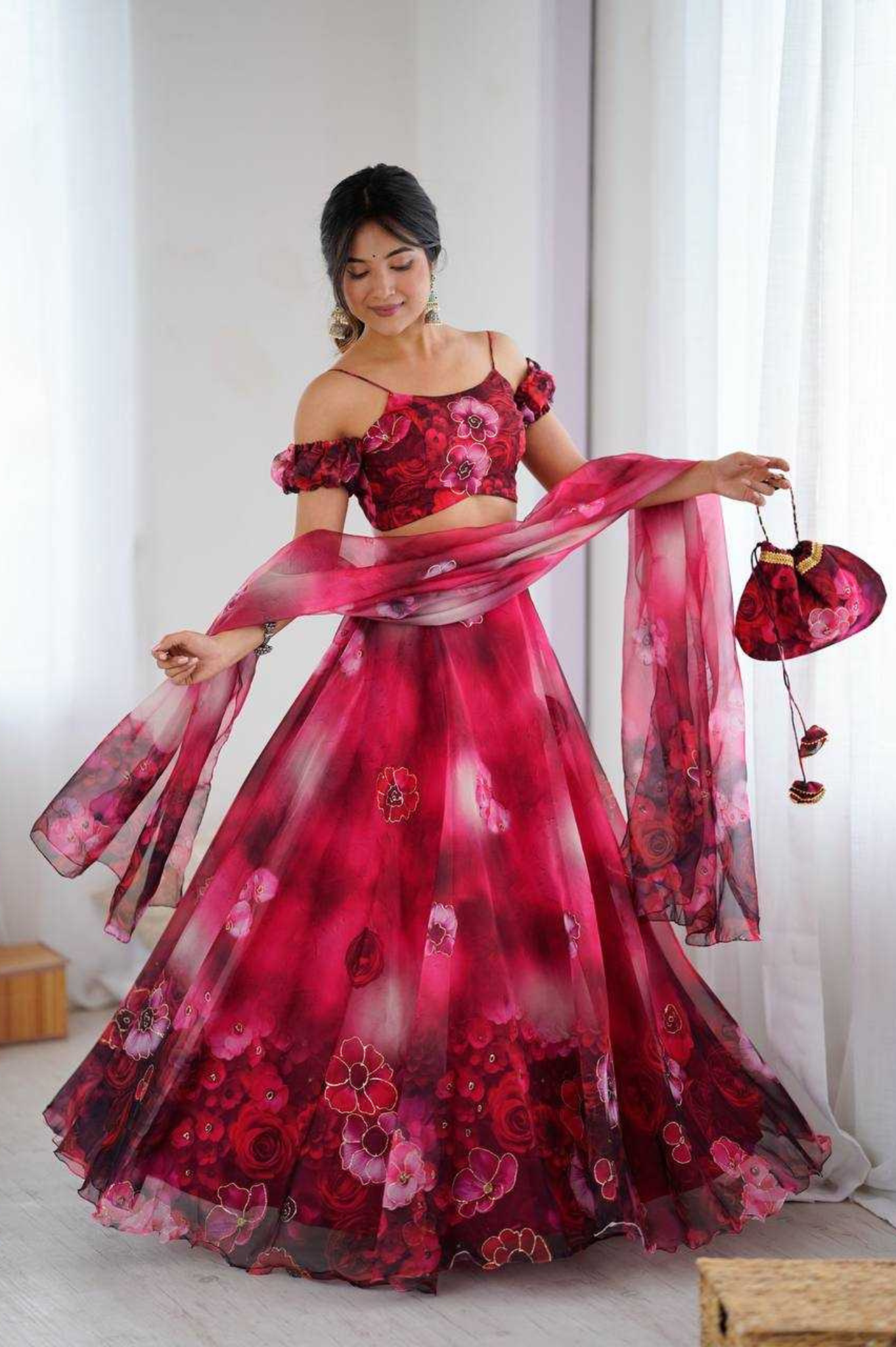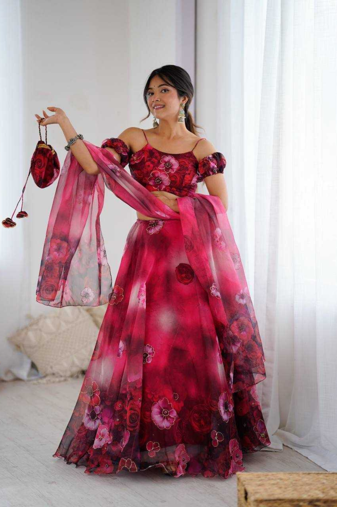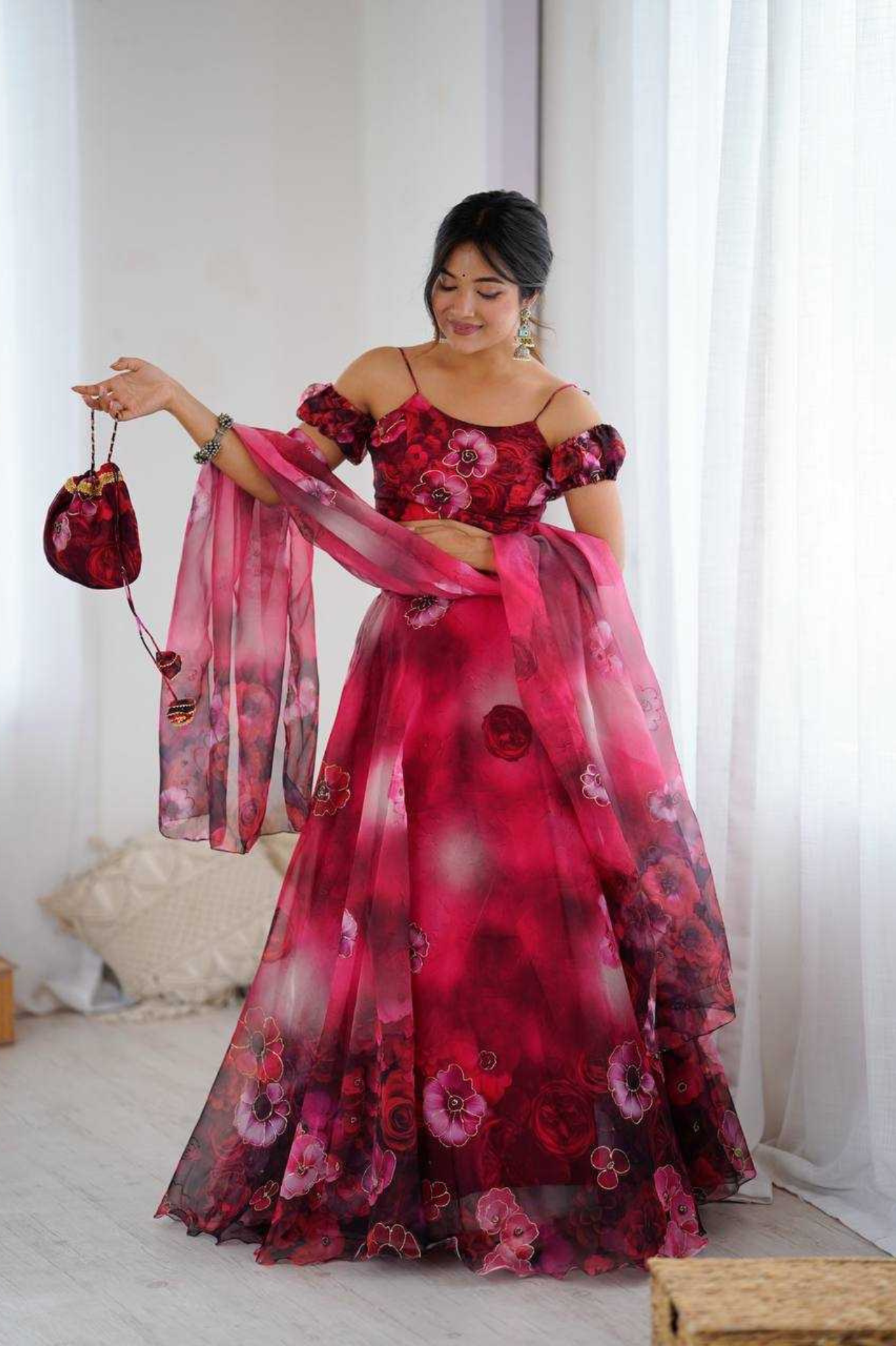 Turn heads with this exquisite pure organza digital print lehenga set, enhanced with elegant zari work. The vibrant hues, paired with luxurious detailing, make it a perfect pick for festive celebrations, weddings, and sangeet nights.