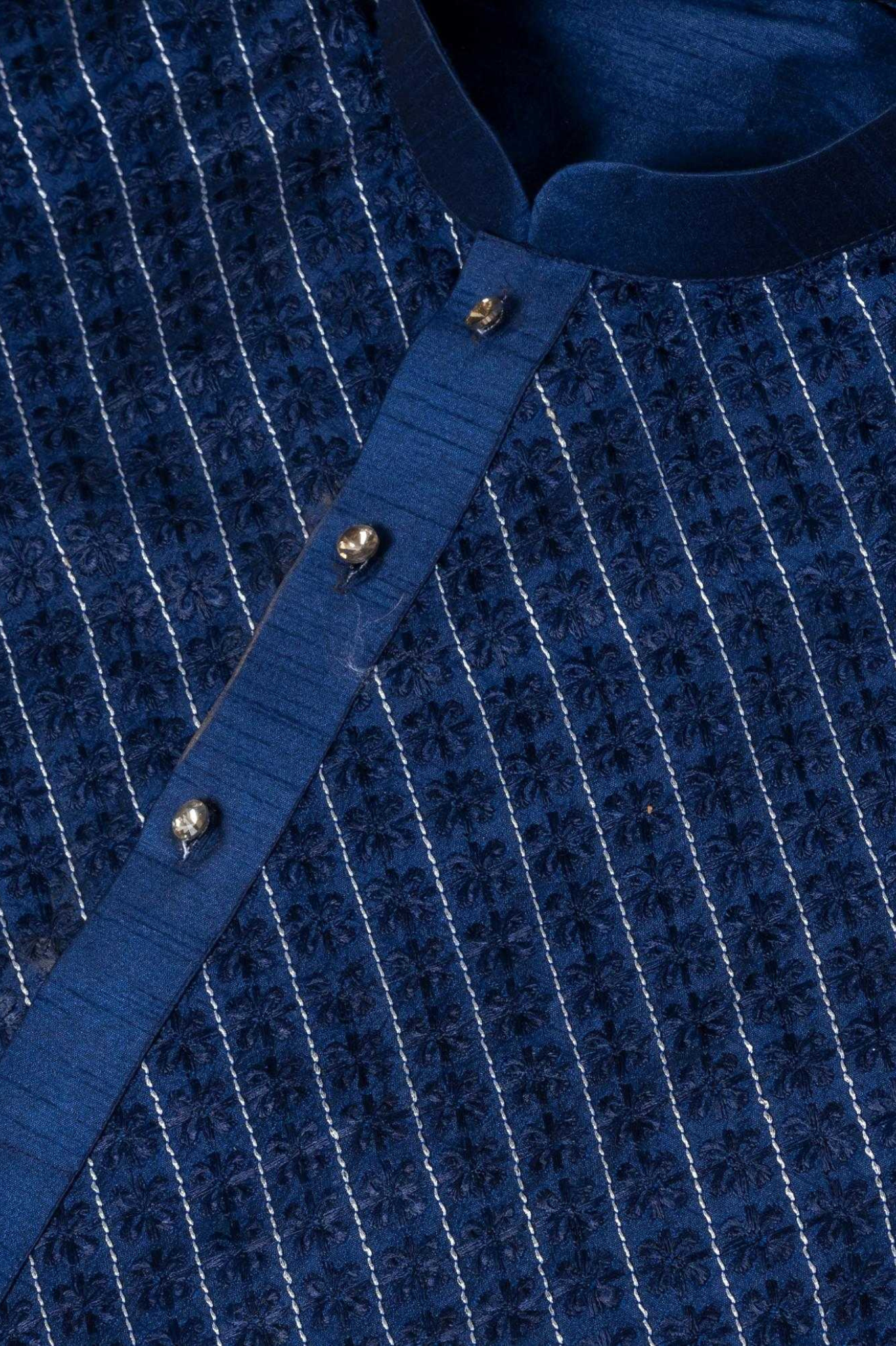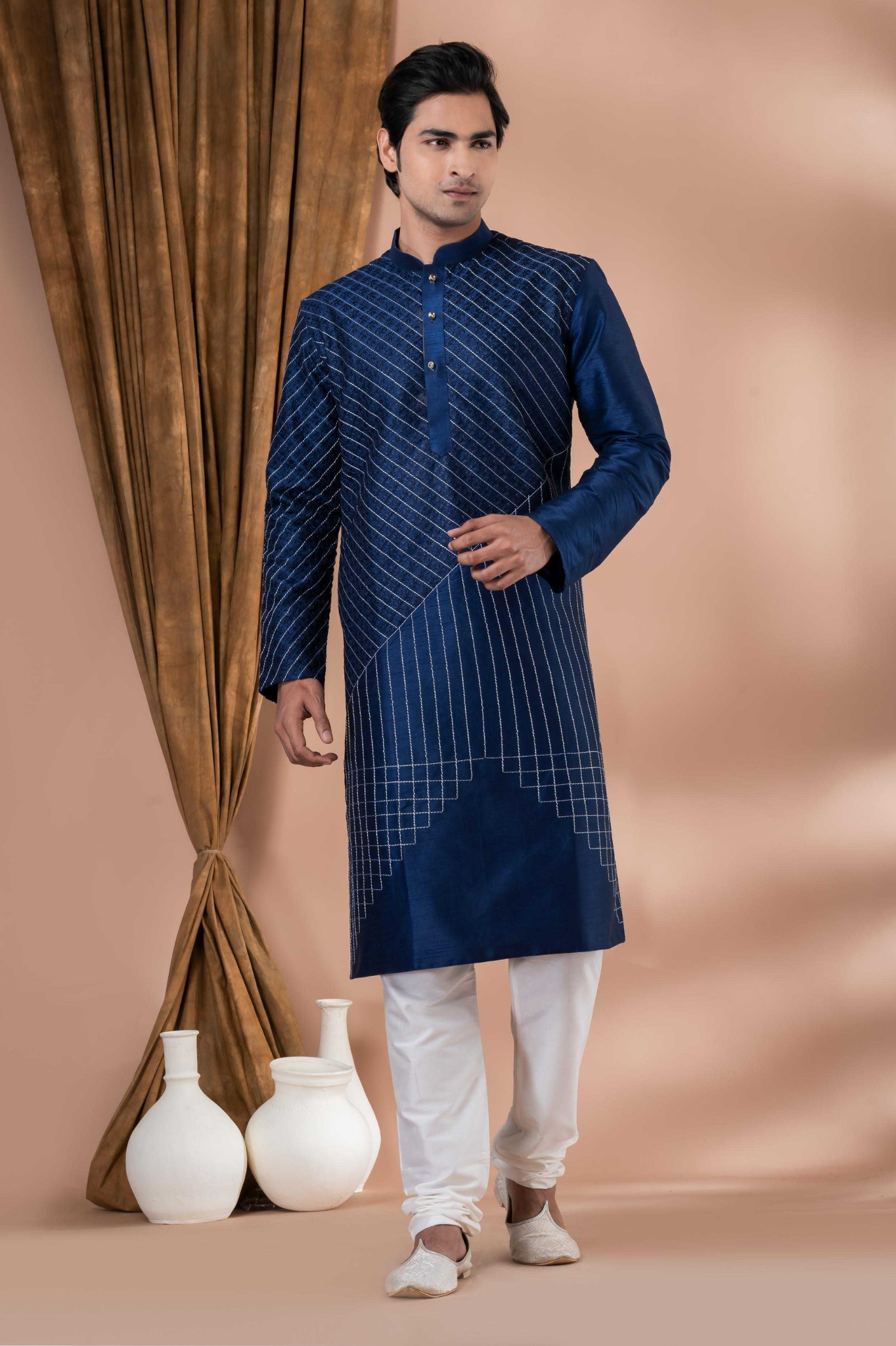 Experience timeless charm with this men’s kurta pajama set crafted entirely in luxurious Banarasi Jacquard fabric. Designed in a deep navy blue with elegant geometric thread patterns, this kurta exudes sophistication and cultural elegance. Paired with a contrasting white pajama, it’s an ideal choice for weddings, festive occasions, or traditional gatherings.