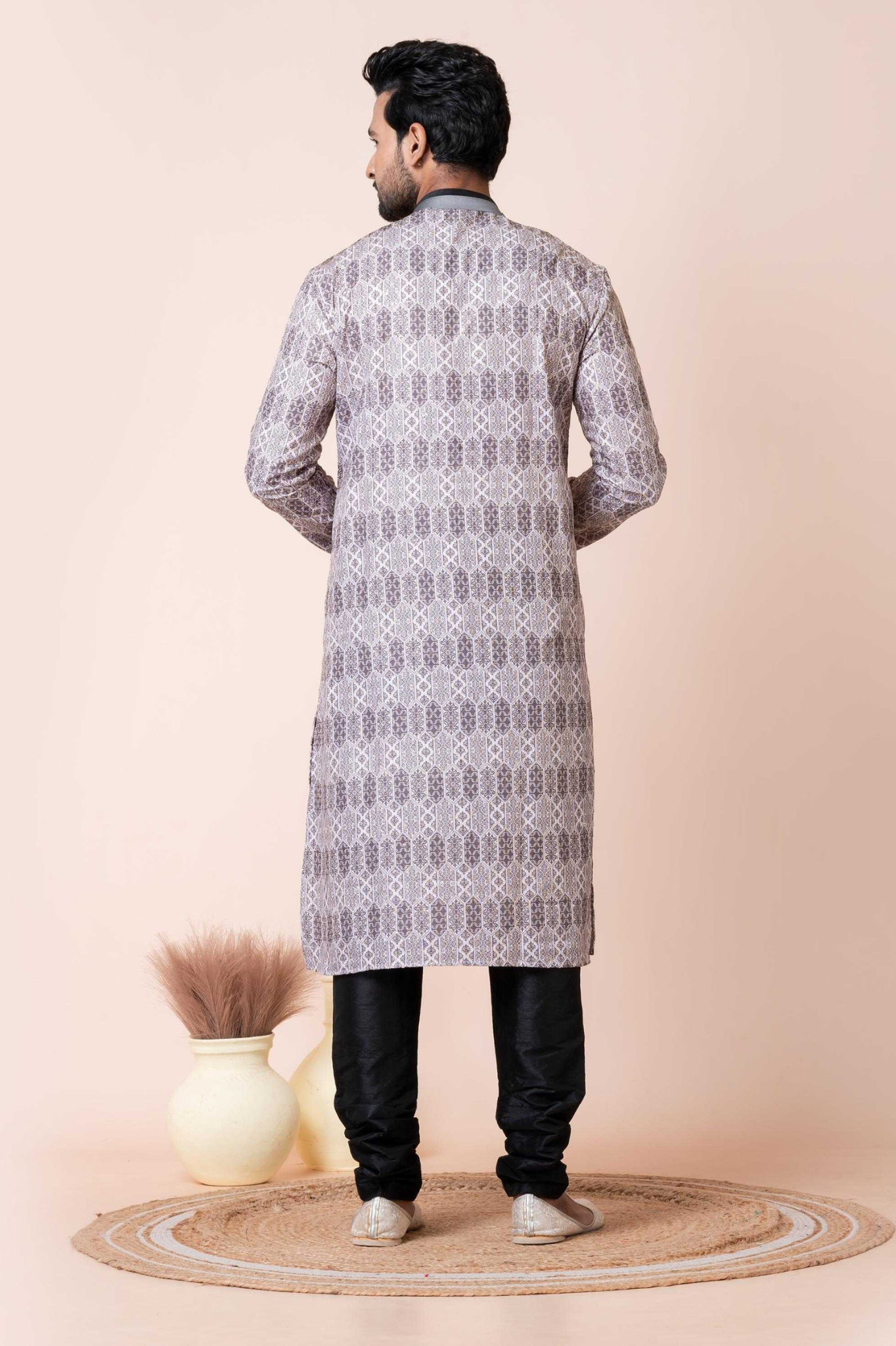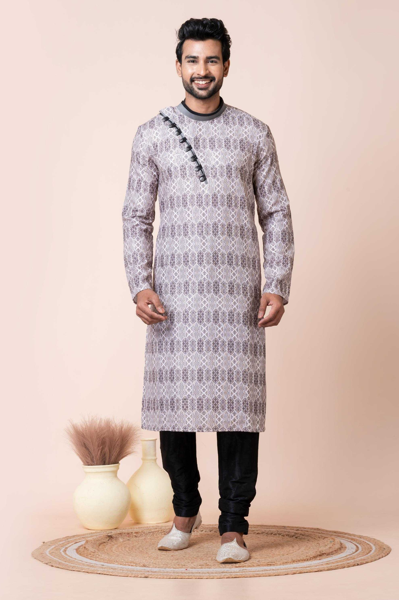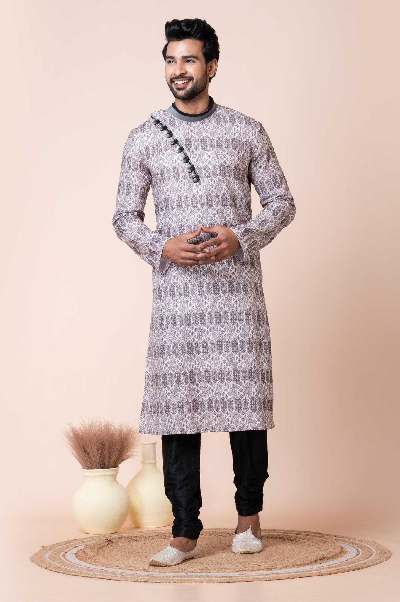 Achieve a smart ethnic look with this men’s kurta pajama set crafted from a premium mono cotton-polyester blend. Designed with a unique patterned weave, this kurta combines traditional charm with modern elegance. The asymmetrical button design adds a touch of sophistication, while the soft yet durable fabric ensures comfort and ease of wear. Paired with contrasting bottoms, this set is ideal for festive occasions, weddings, and cultural celebrations.
