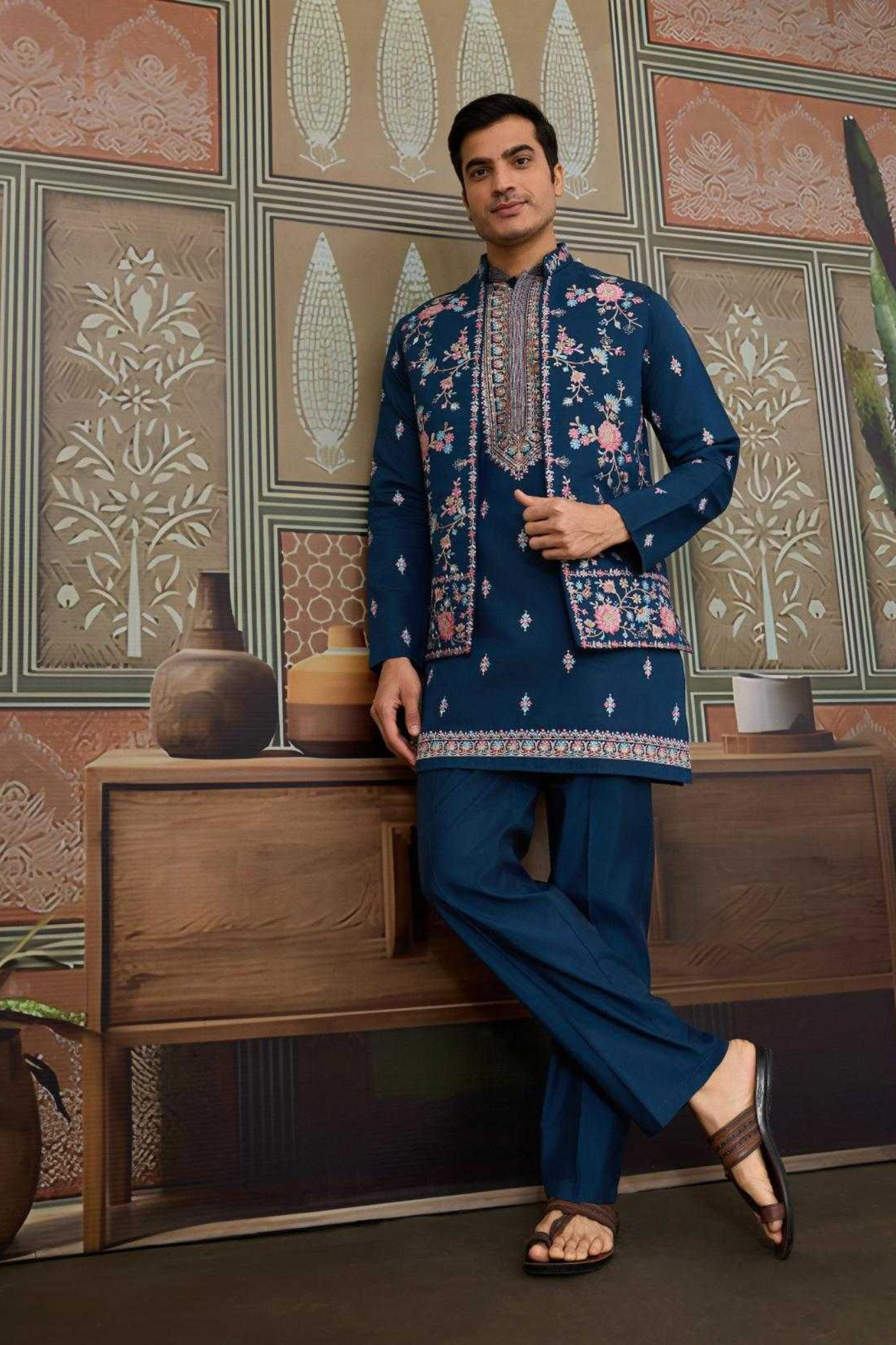 A regal 3-piece men’s ethnic set crafted for festive elegance. The kurta is designed in rich navy blue fabric, detailed...
