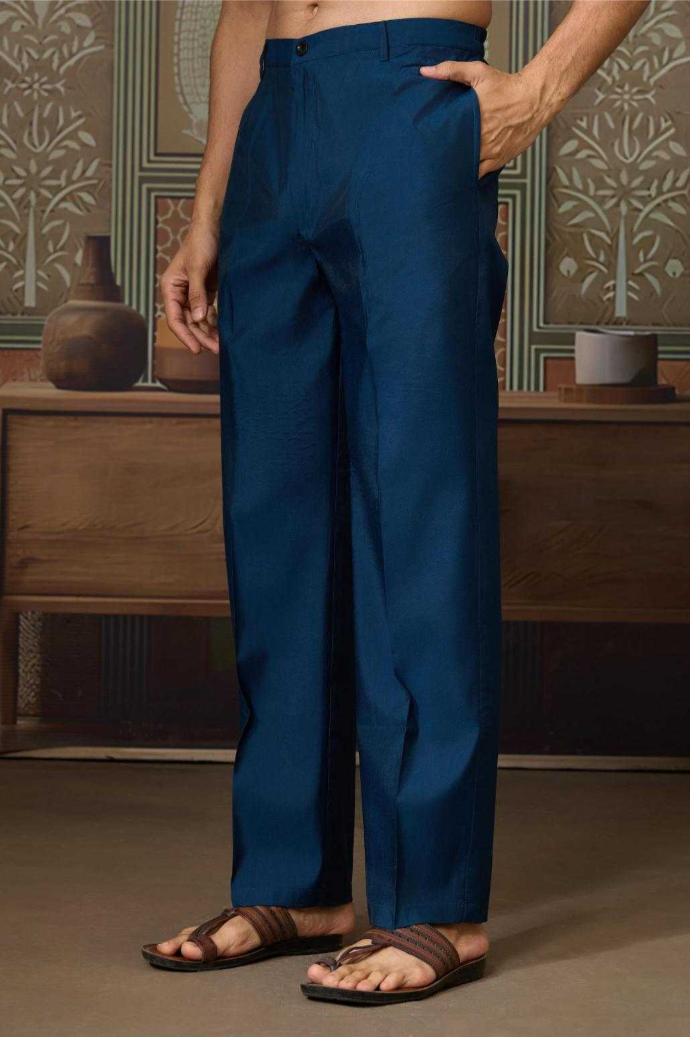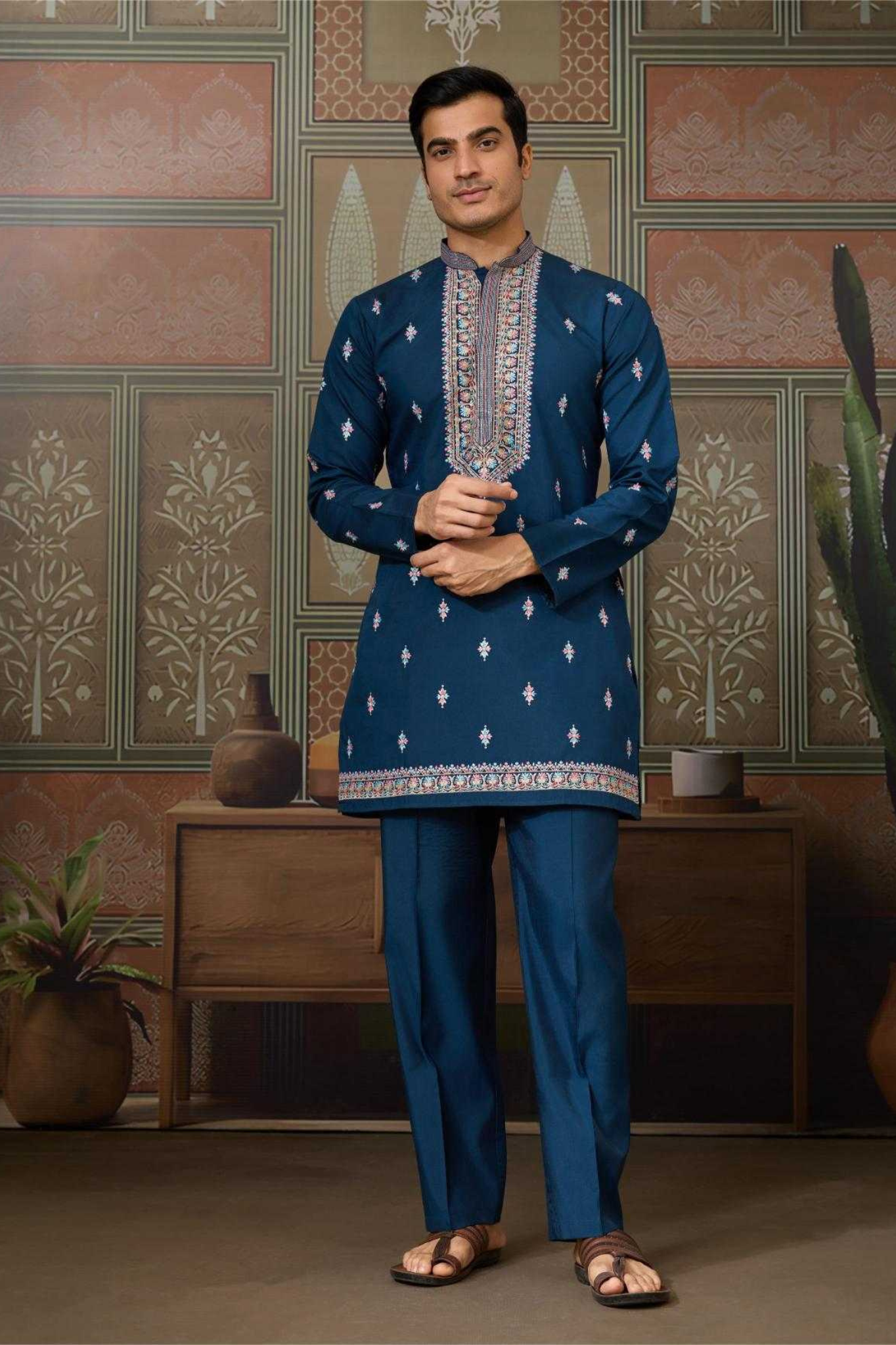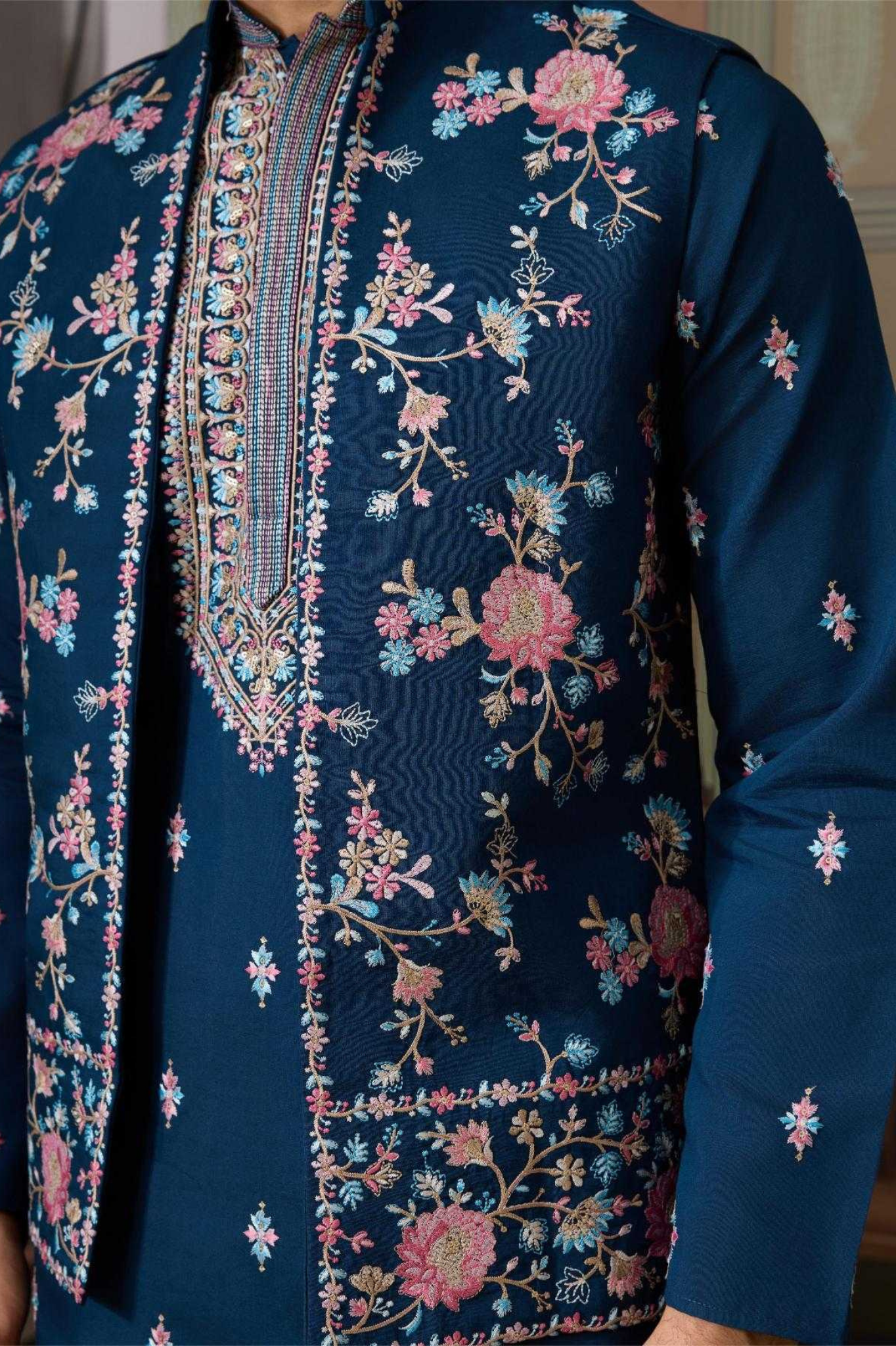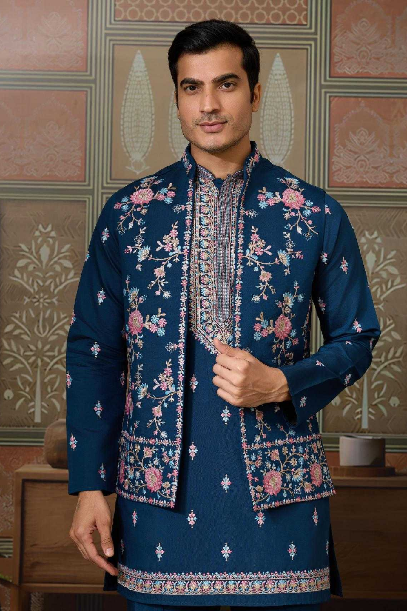 A regal 3-piece men’s ethnic set crafted for festive elegance. The kurta is designed in rich navy blue fabric, detailed with intricate embroidery on the front panel, neckline, and sleeves. Paired with a beautifully coordinated embroidered koti for a layered royal look, and straight-fit bottoms for comfort and sophistication.