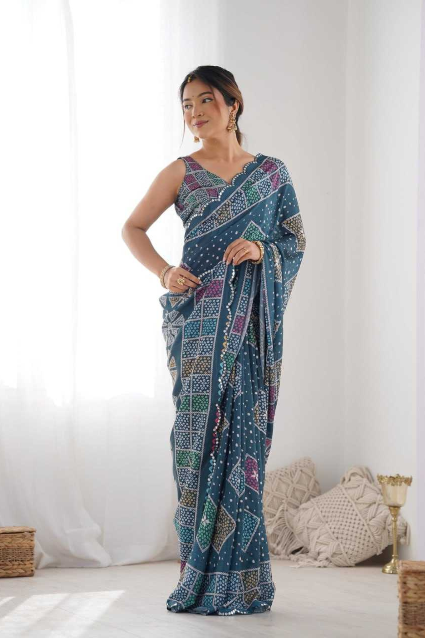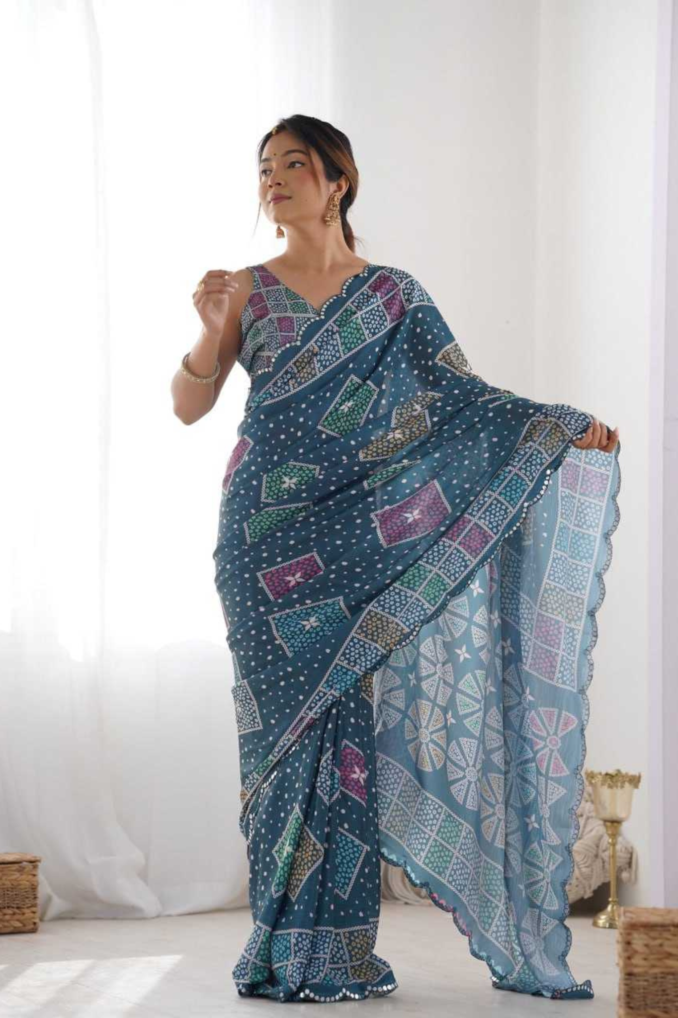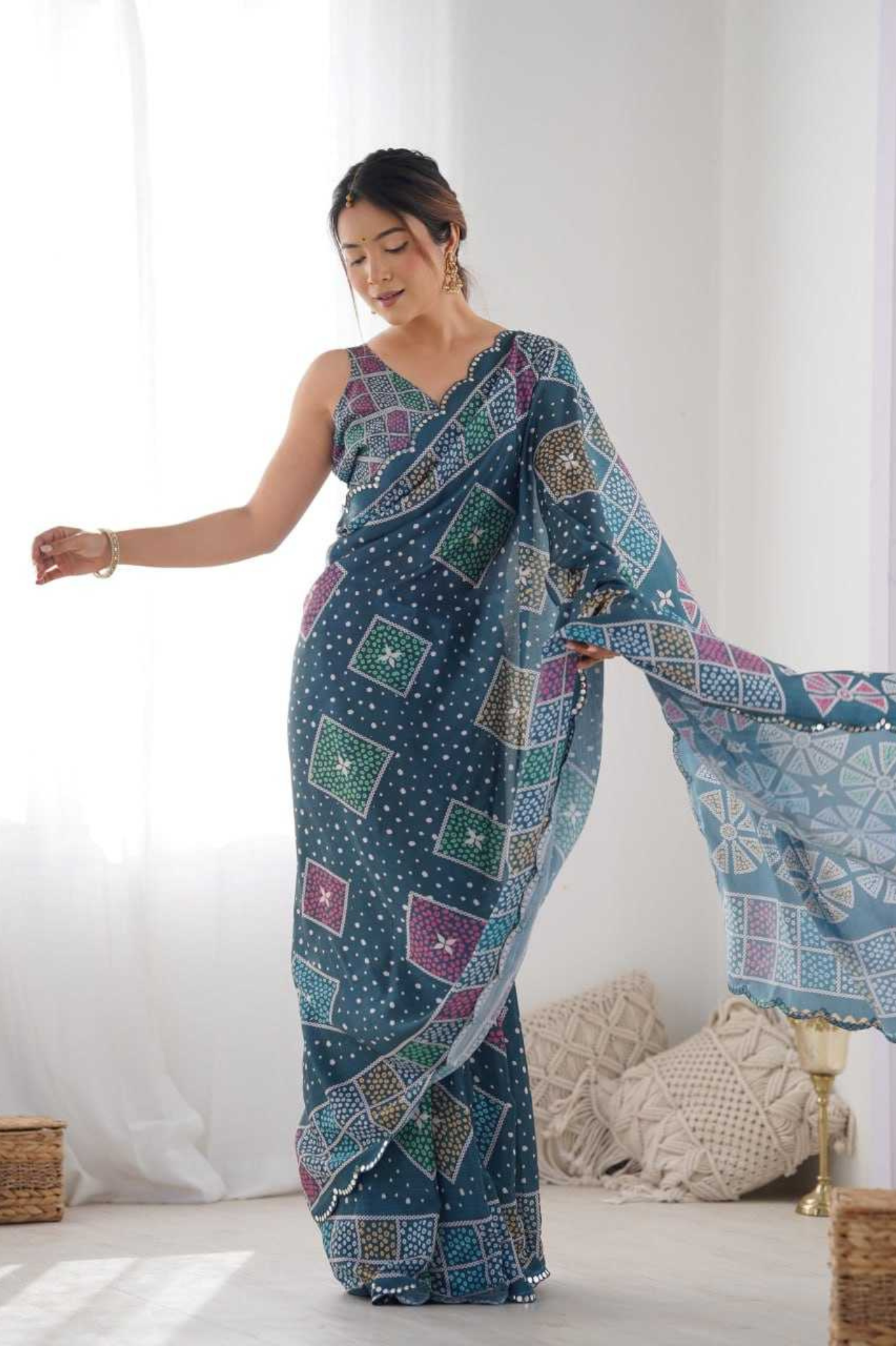 Add a royal charm to your ethnic wardrobe with this Heavy Chinnon Saree, featuring a stunning Kutchi-inspired geometric print in rich blue tones. The saree is beautifully highlighted with a mirror lace border, adding a glimmering touch of traditional craftsmanship.