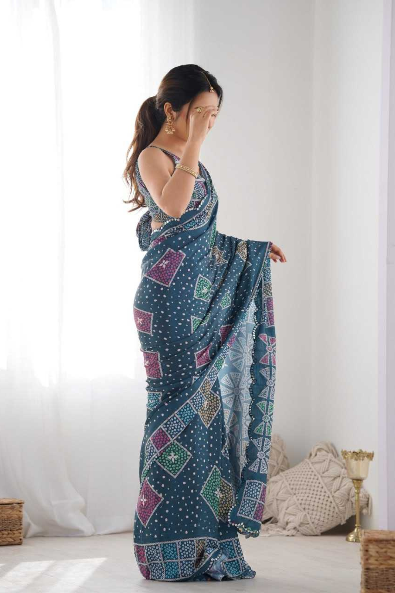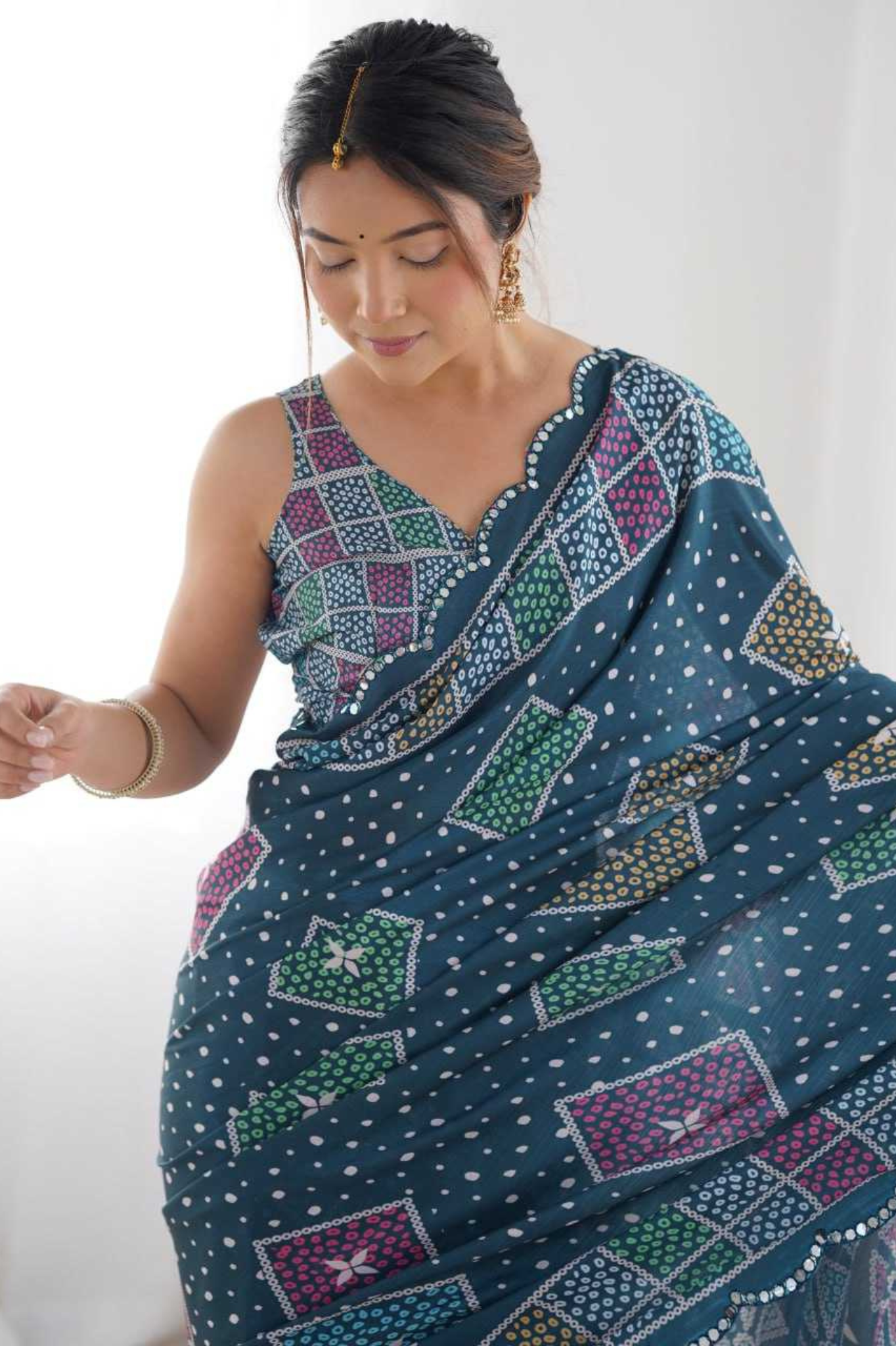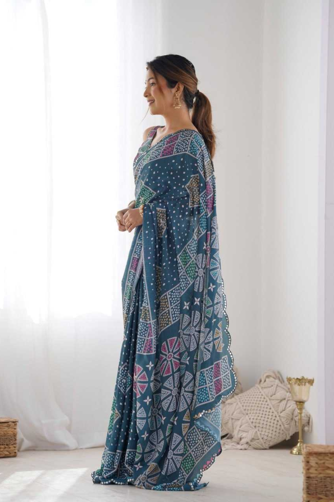 Add a royal charm to your ethnic wardrobe with this Heavy Chinnon Saree, featuring a stunning Kutchi-inspired geometric print in rich blue tones. The saree is beautifully highlighted with a mirror lace border, adding a glimmering touch of traditional craftsmanship.