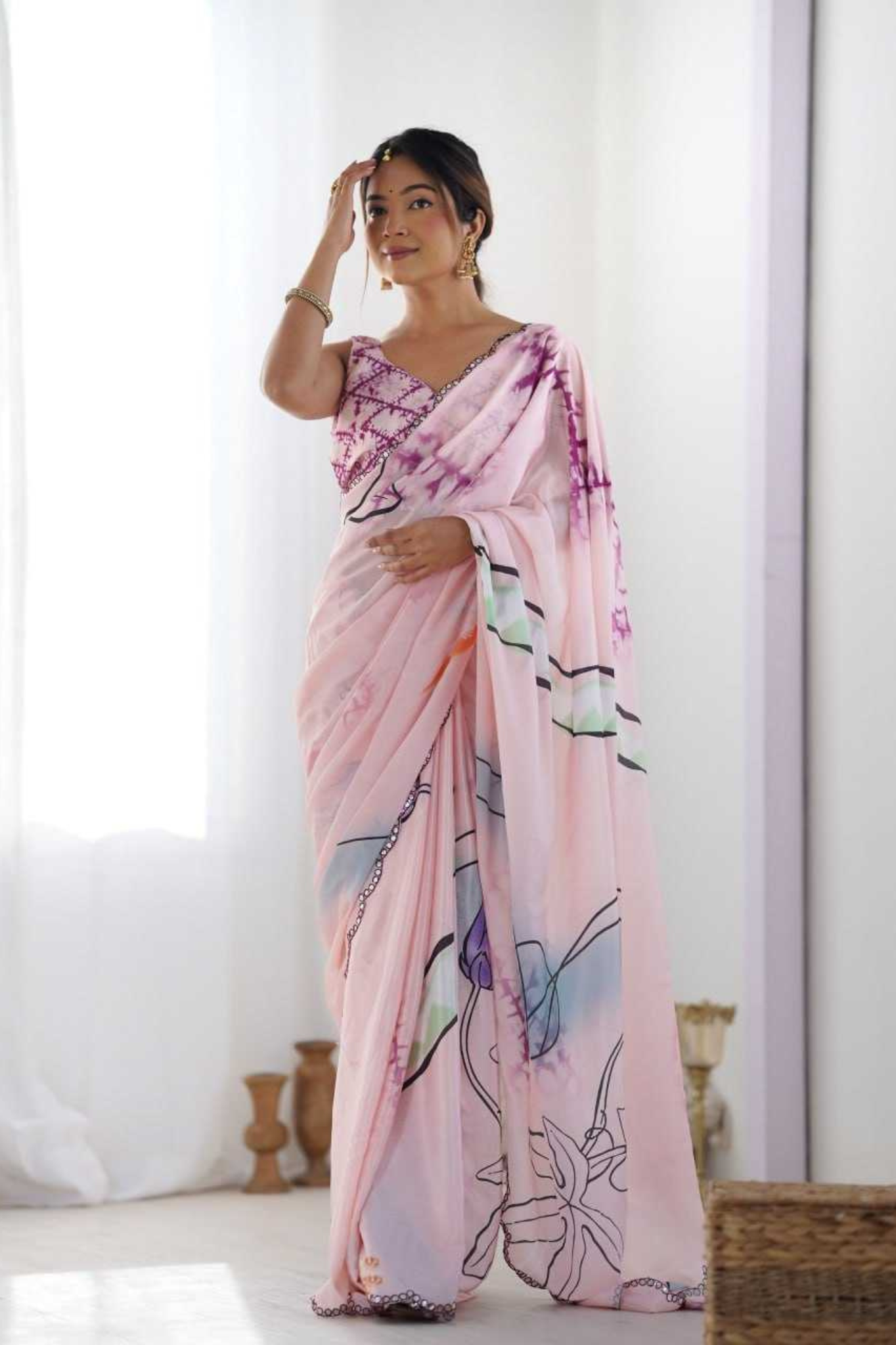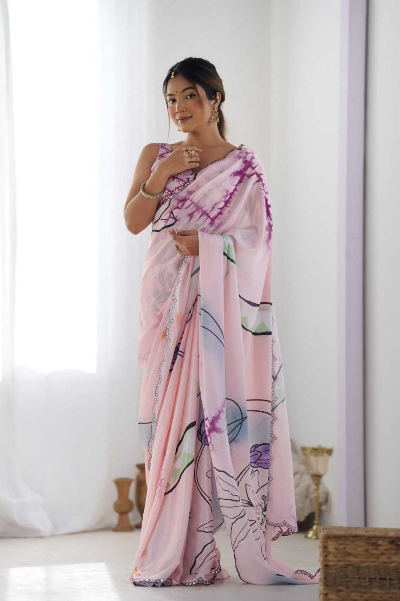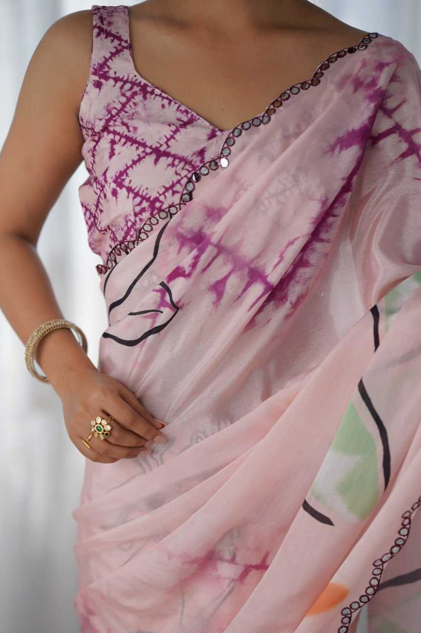 Grace meets modern minimalism in this Heavy Chinnon Saree, featuring soft pastel hues and a delicate artistic print. The saree’s charm is accentuated by a Kutchi-style mirror lace border, adding just the right hint of sparkle to its subtle elegance.