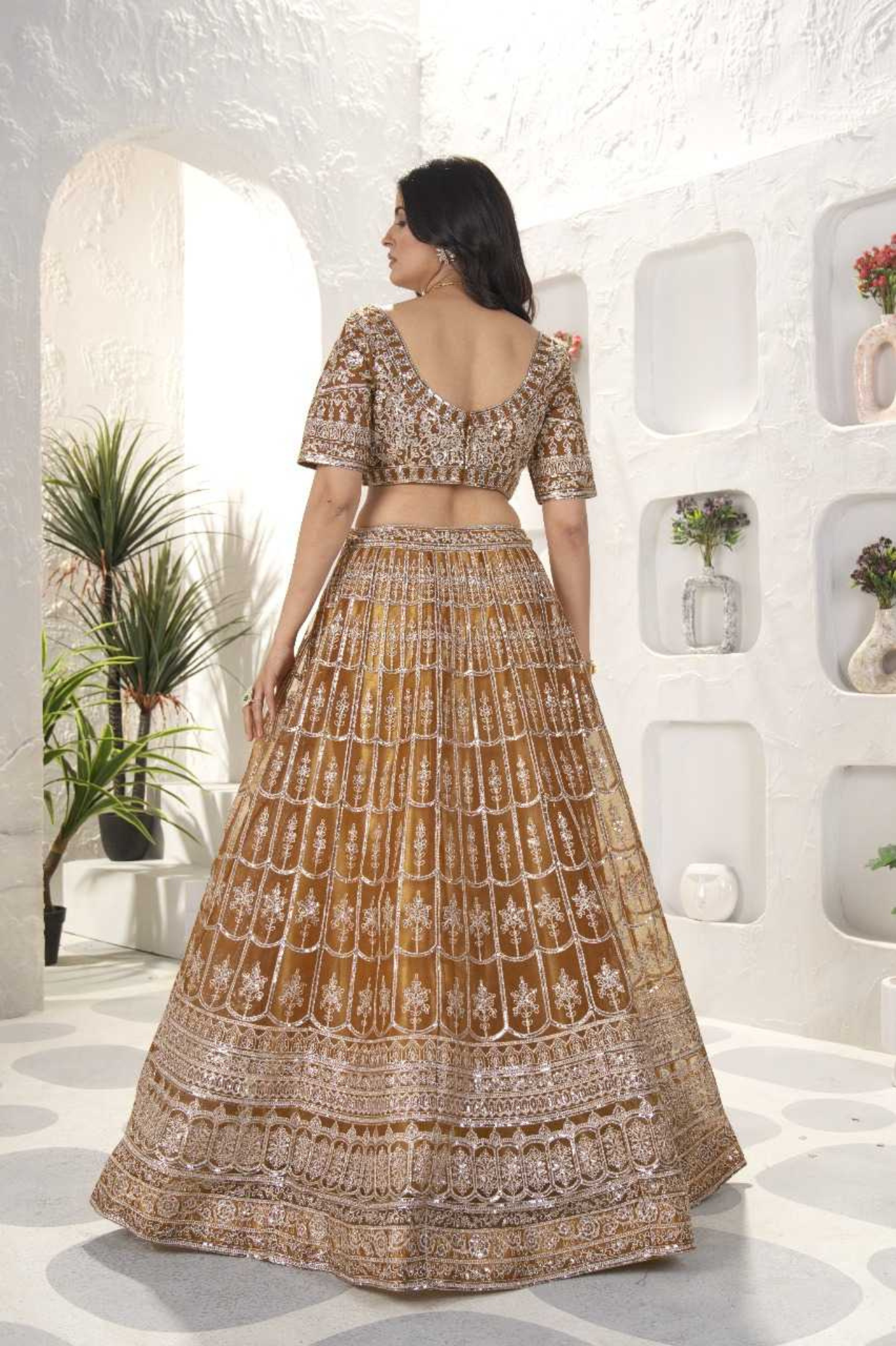 Dazzle in elegance with this luxurious golden lehenga set crafted entirely from premium net fabric. The lehenga features intricate embroidery with shimmering accents, paired with a beautifully designed net blouse. A matching net dupatta with delicate borders adds a regal finish, making this outfit perfect for weddings, sangeet nights, and grand festivities.