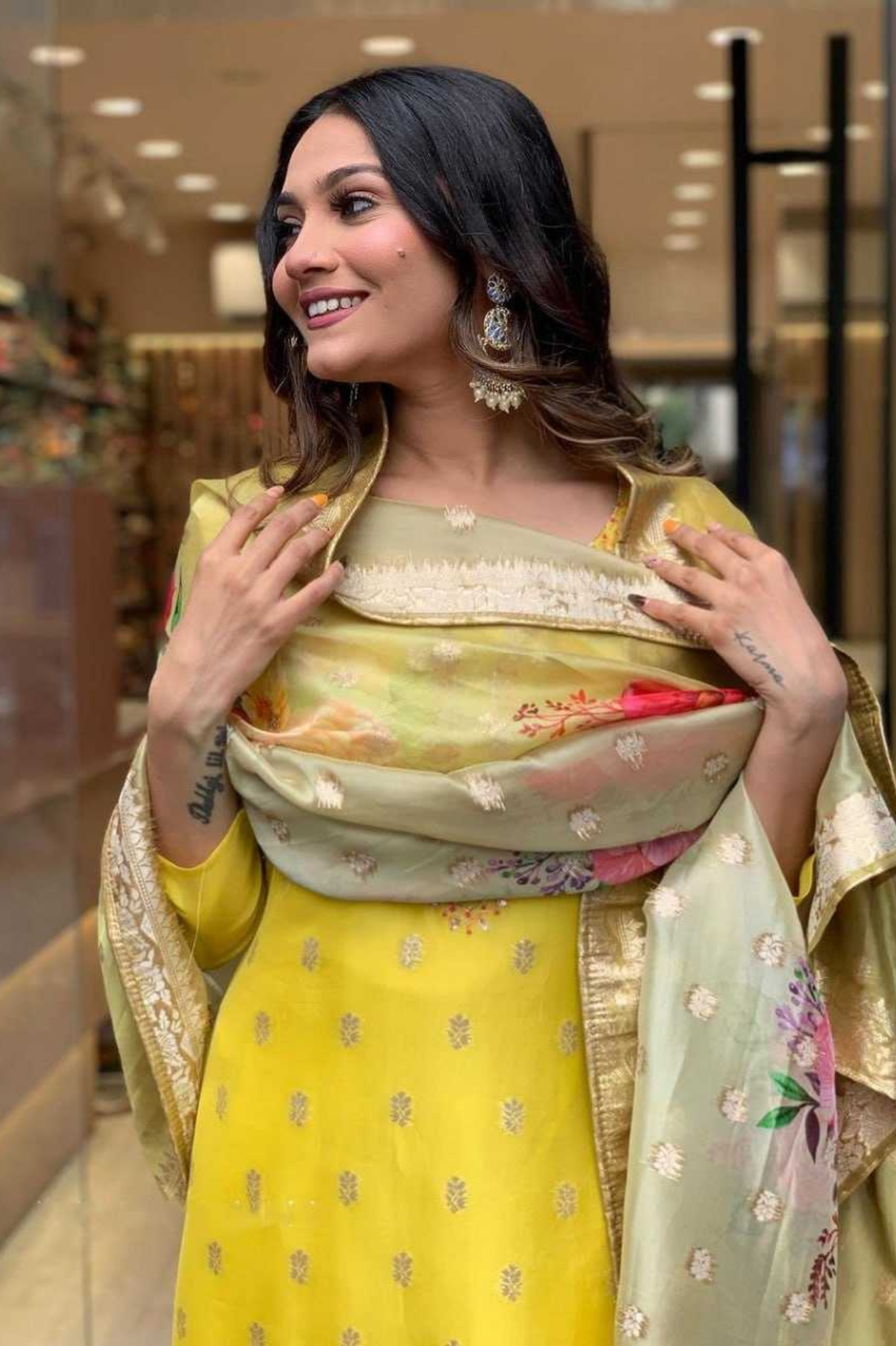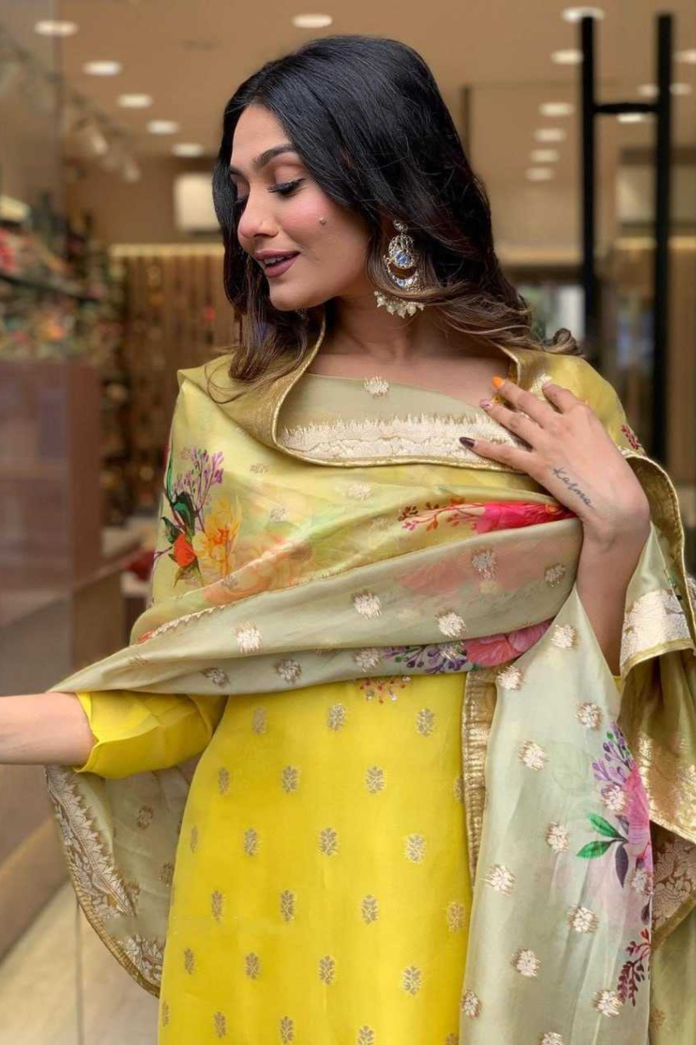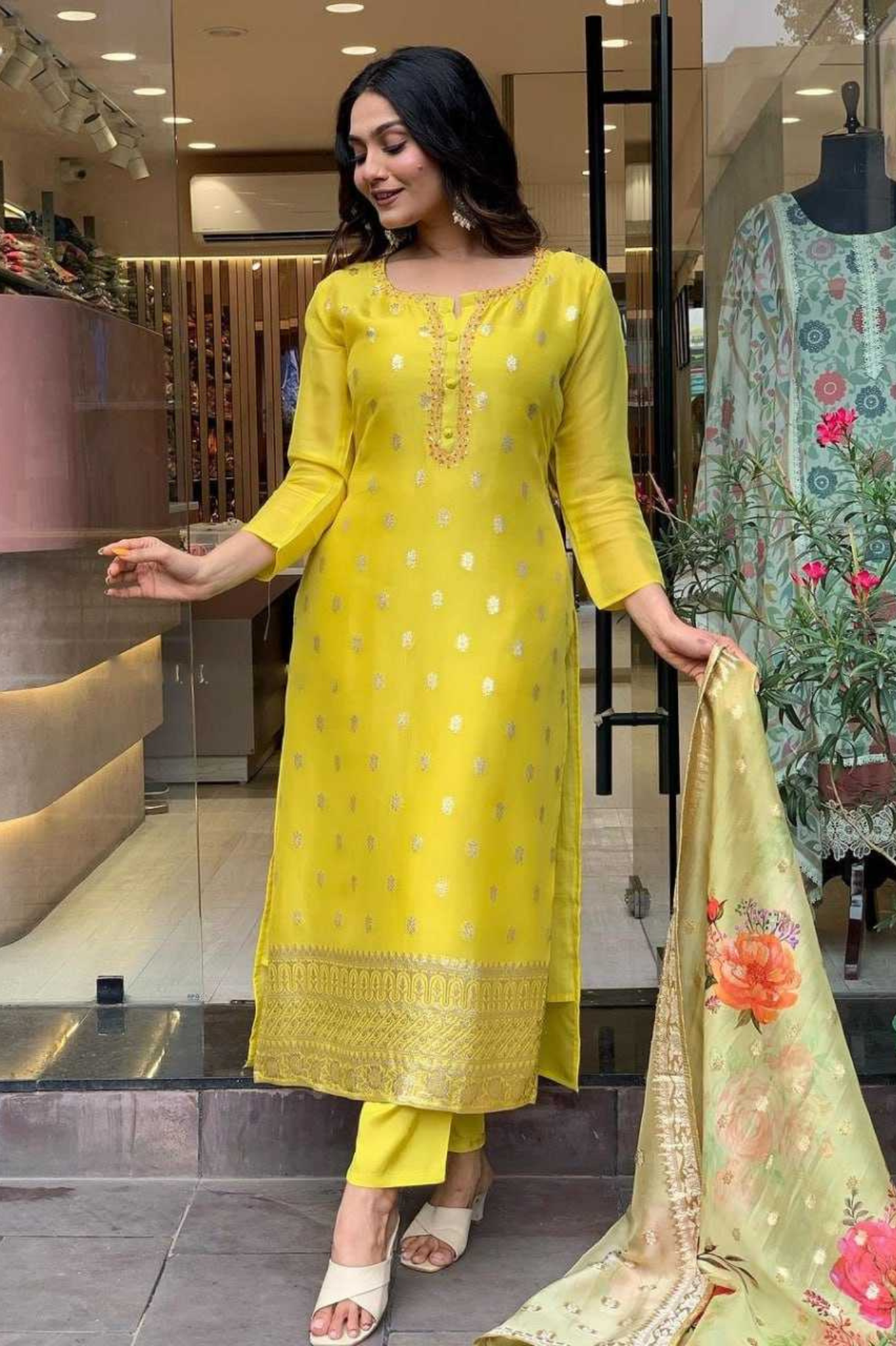 Radiate festive elegance with this stunning 3-piece Kurti set, crafted with rich fabrics and exquisite embroidery. The bright yellow tone paired with a floral Jacquard dupatta makes it perfect for celebrations and ethnic occasions.