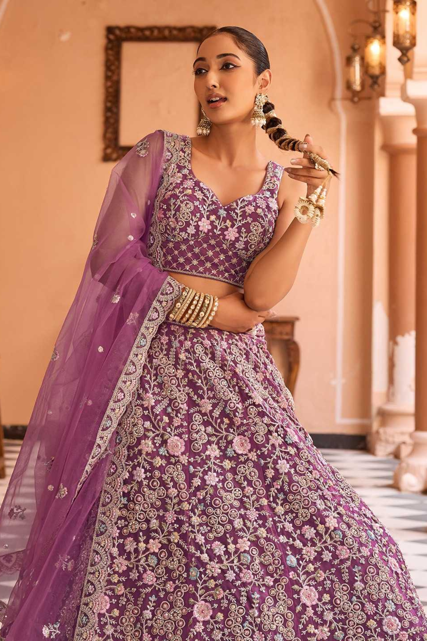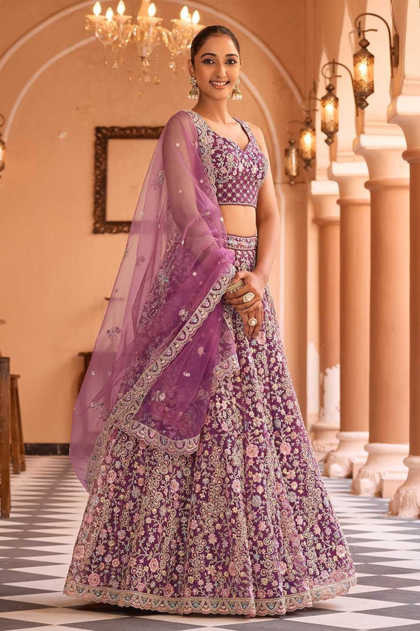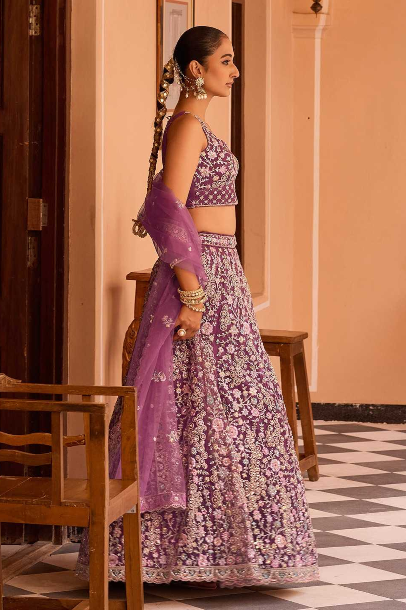 Draped in regal elegance, this premium burgundy lehenga is crafted in rich net fabric and adorned with heavy sequins, stone,...