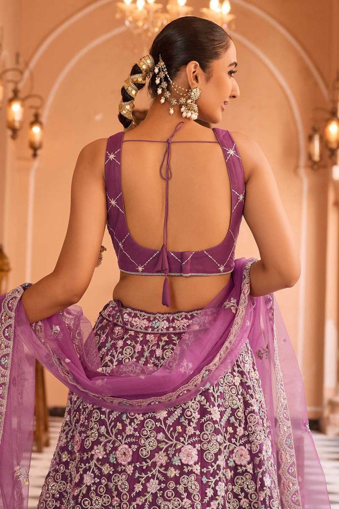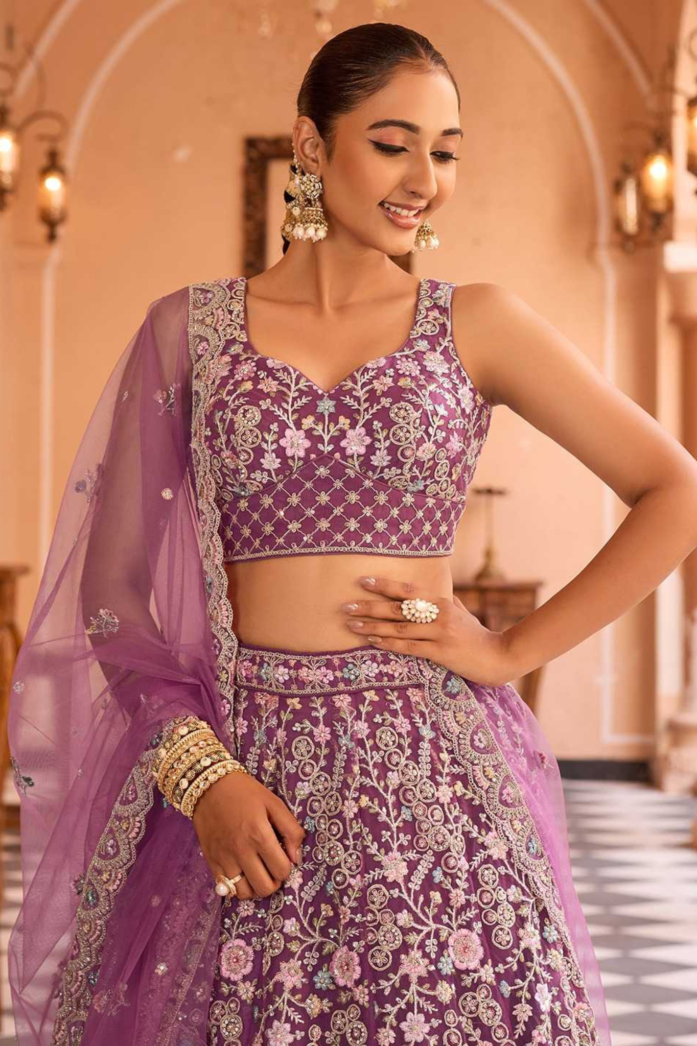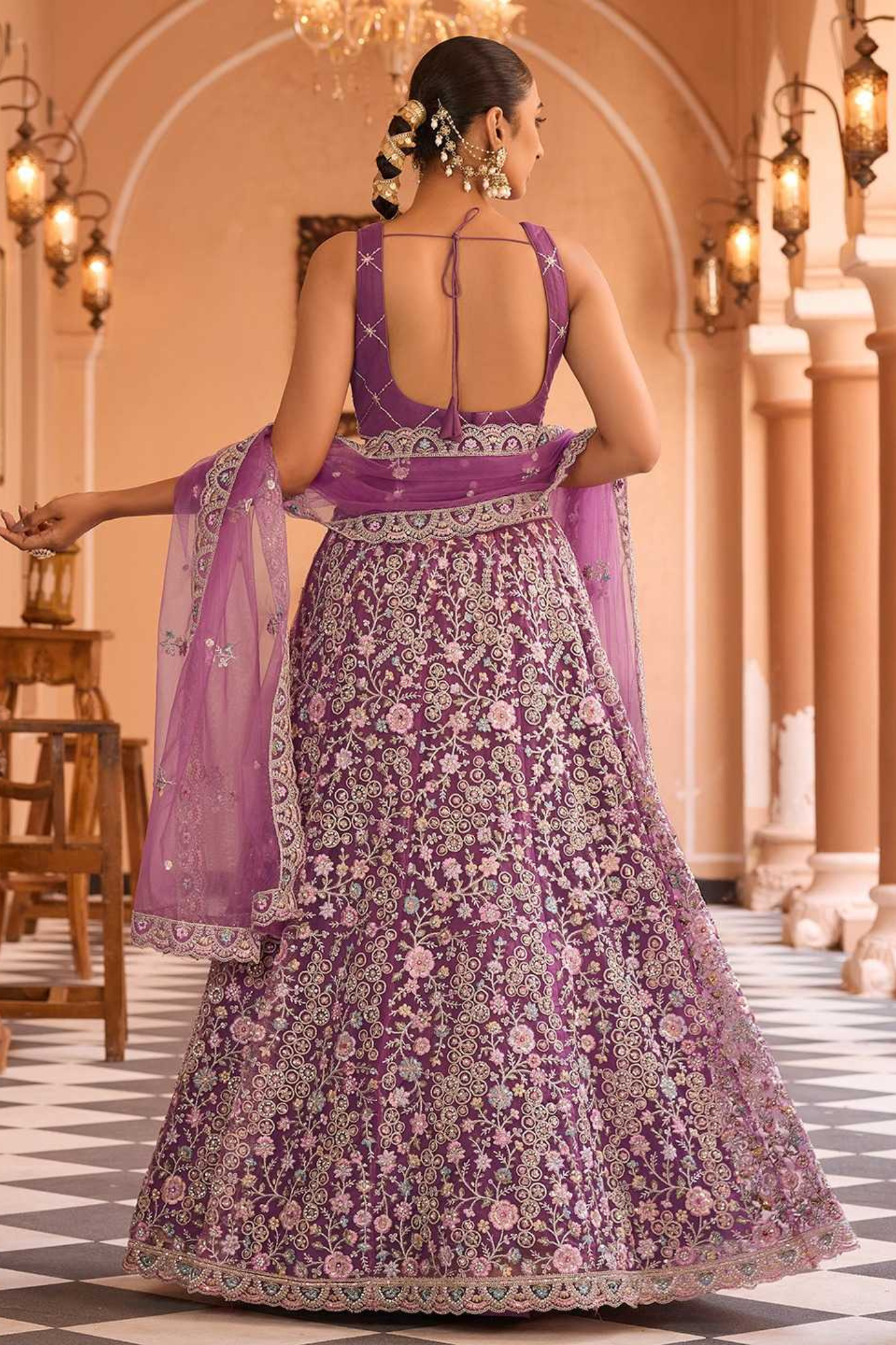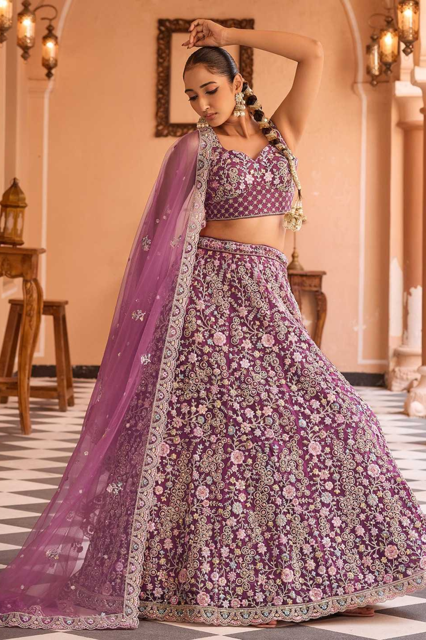 Draped in regal elegance, this premium burgundy lehenga is crafted in rich net fabric and adorned with heavy sequins, stone,...
