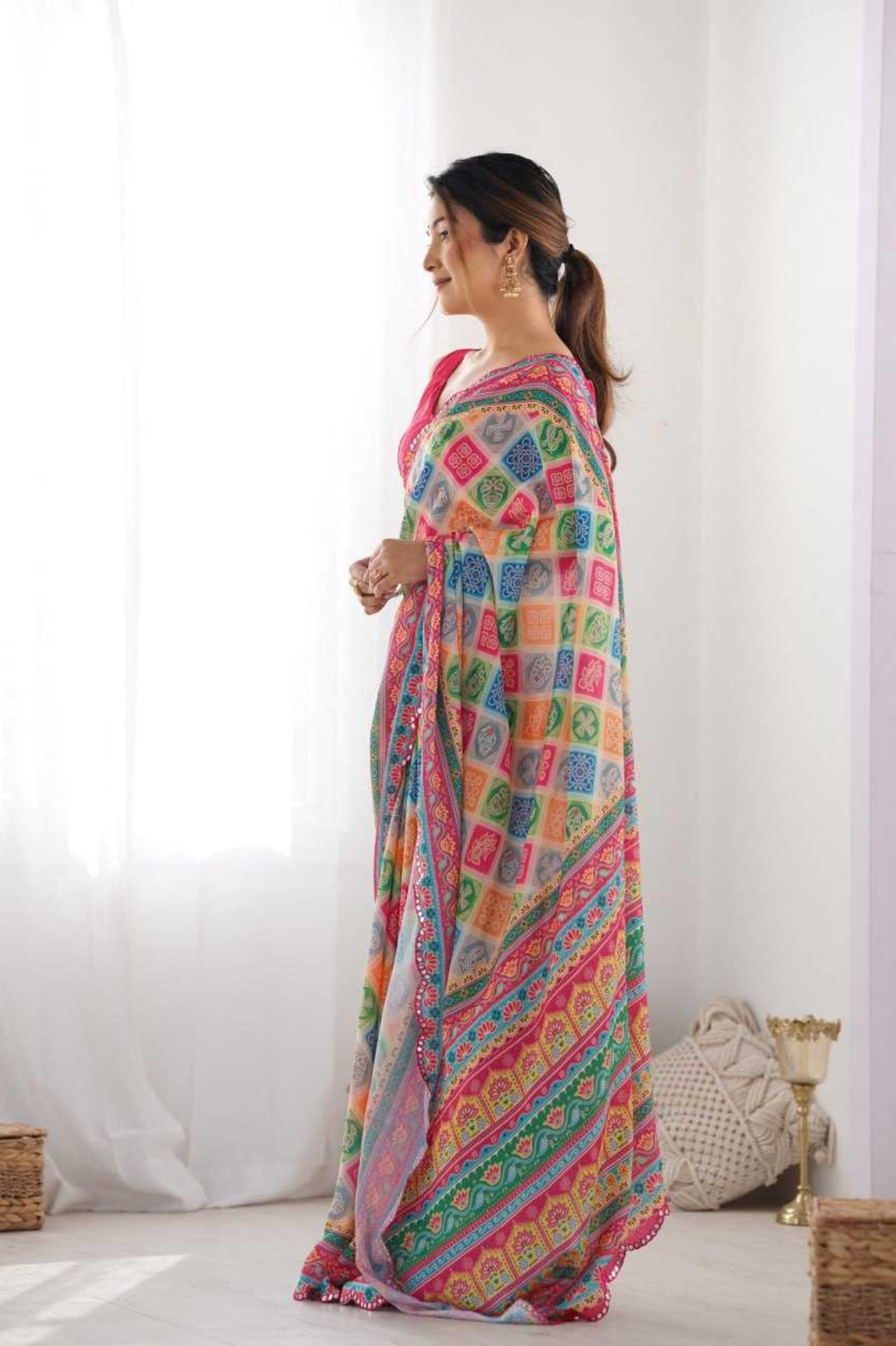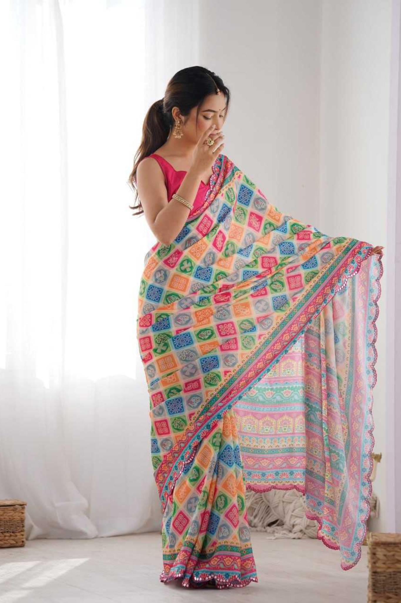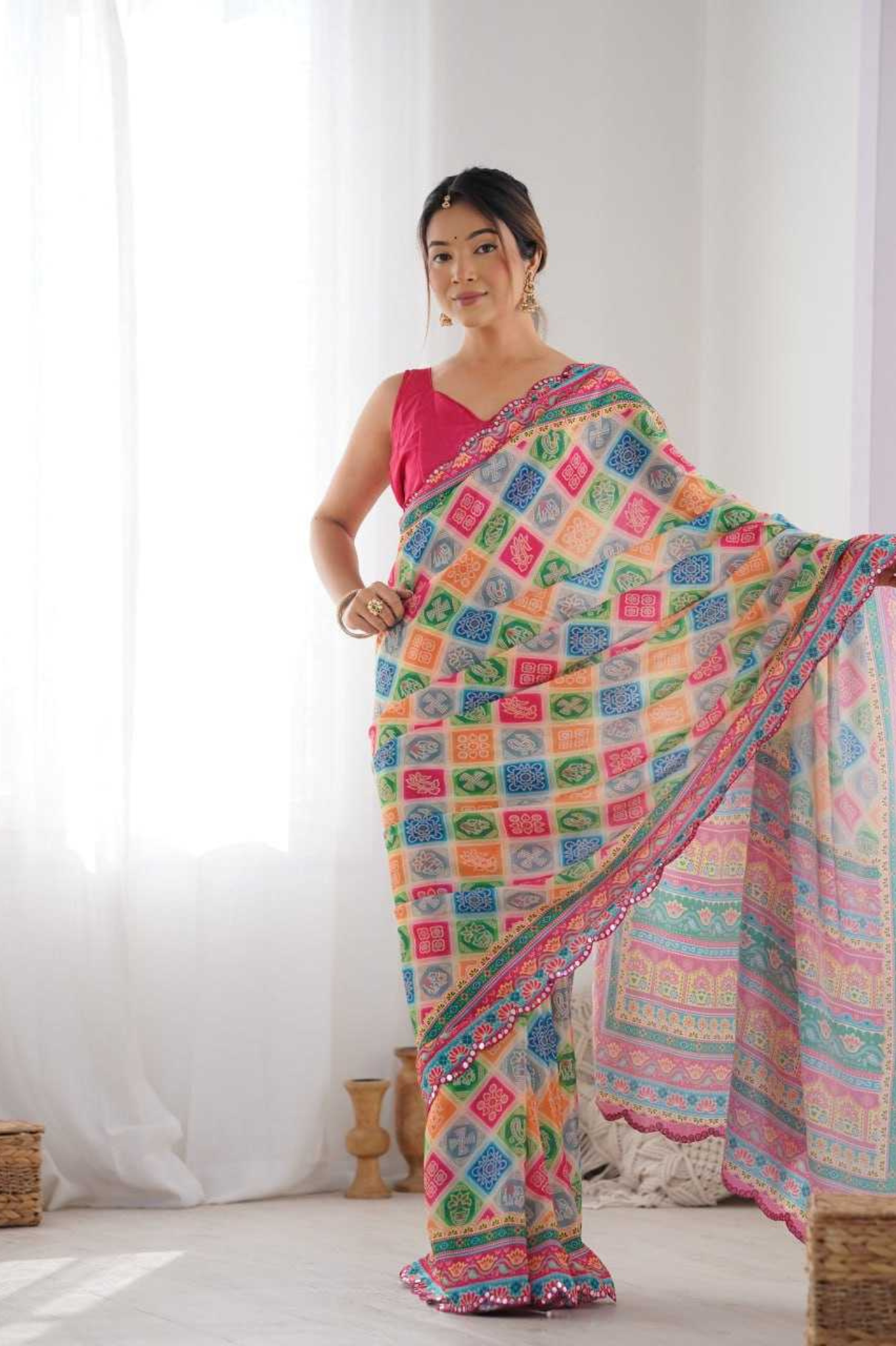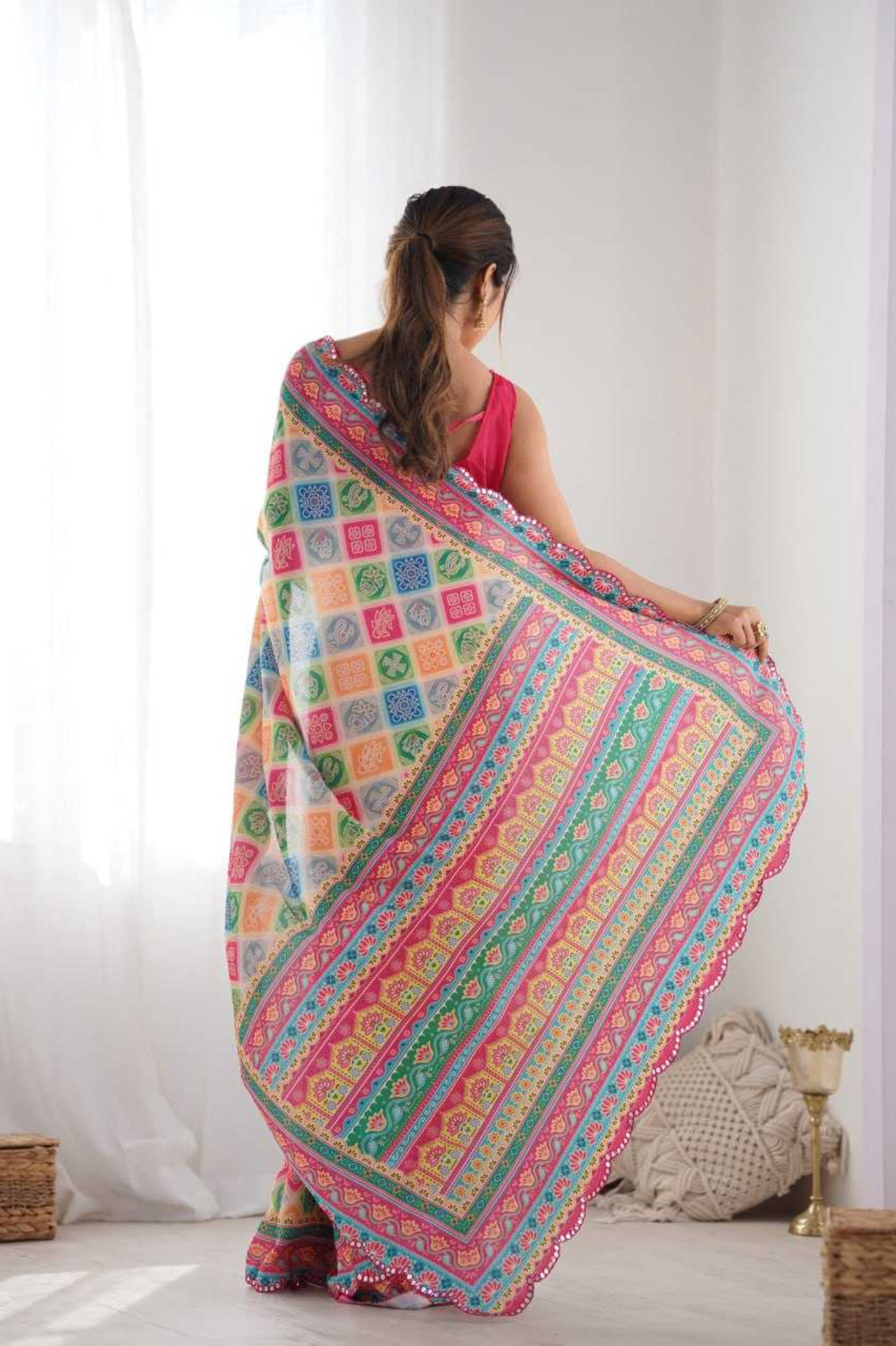 A perfect fusion of color and tradition, this Heavy Chinnon Saree showcases a vibrant Kutchi-inspired multicolor print that adds festive energy to your wardrobe. The saree is beautifully detailed with a mirror lace border, giving it a touch of ethnic elegance and shimmer.