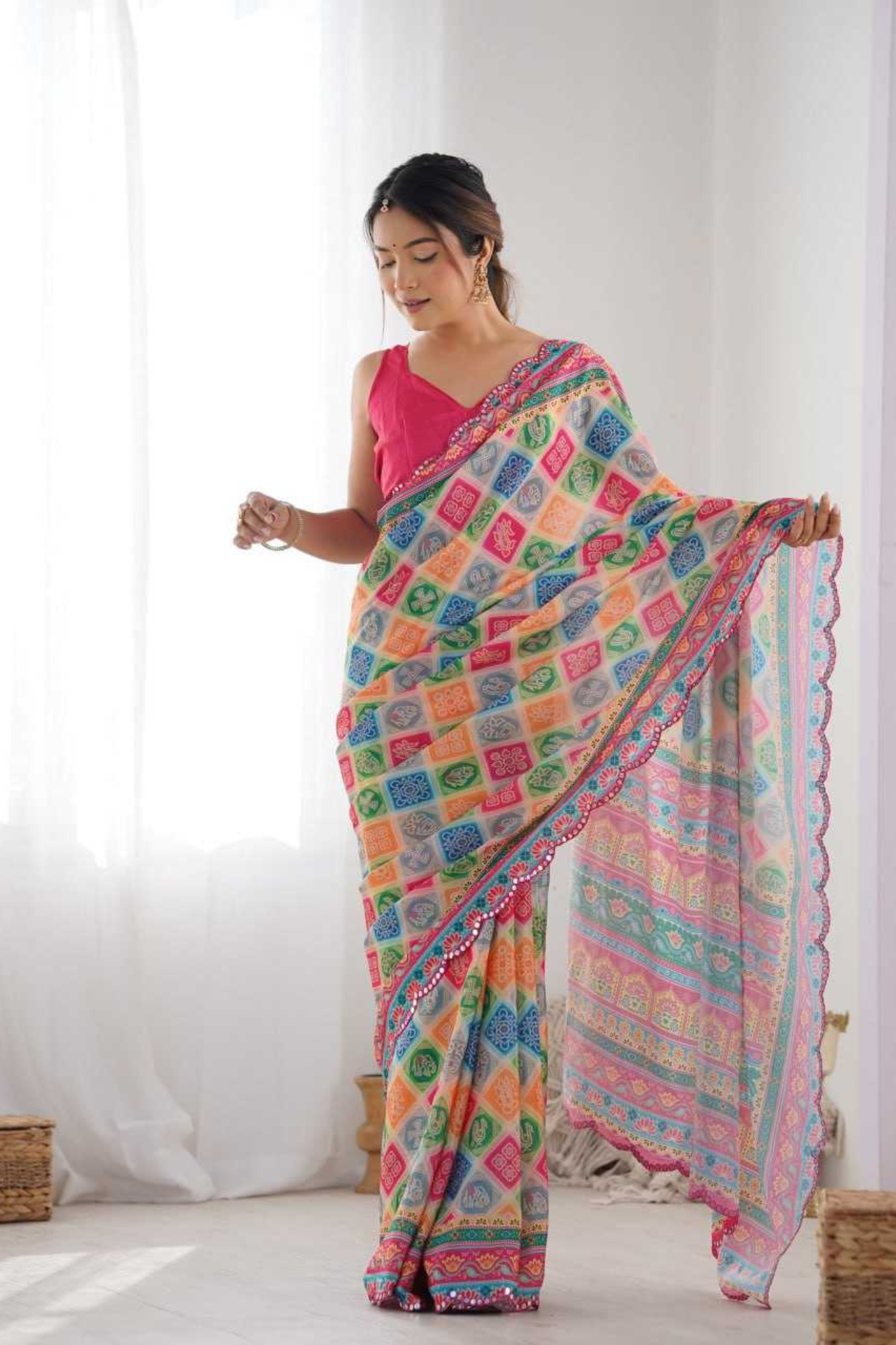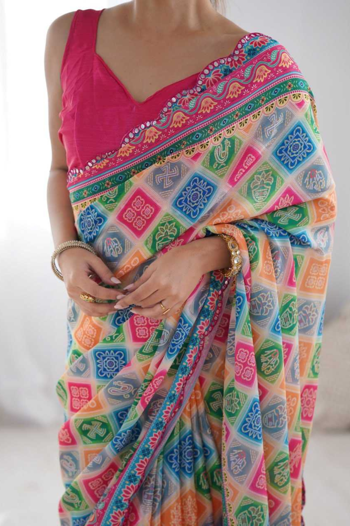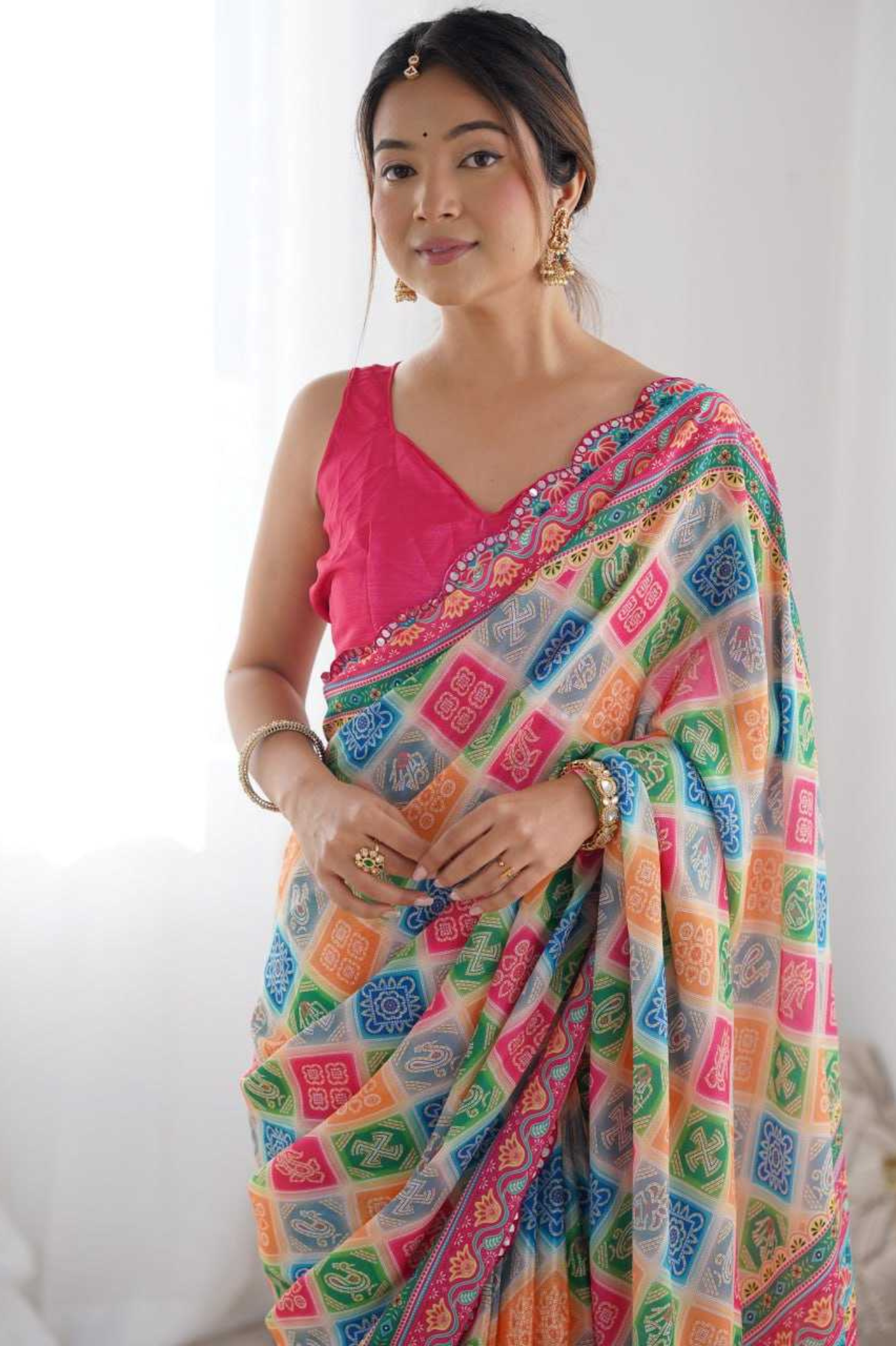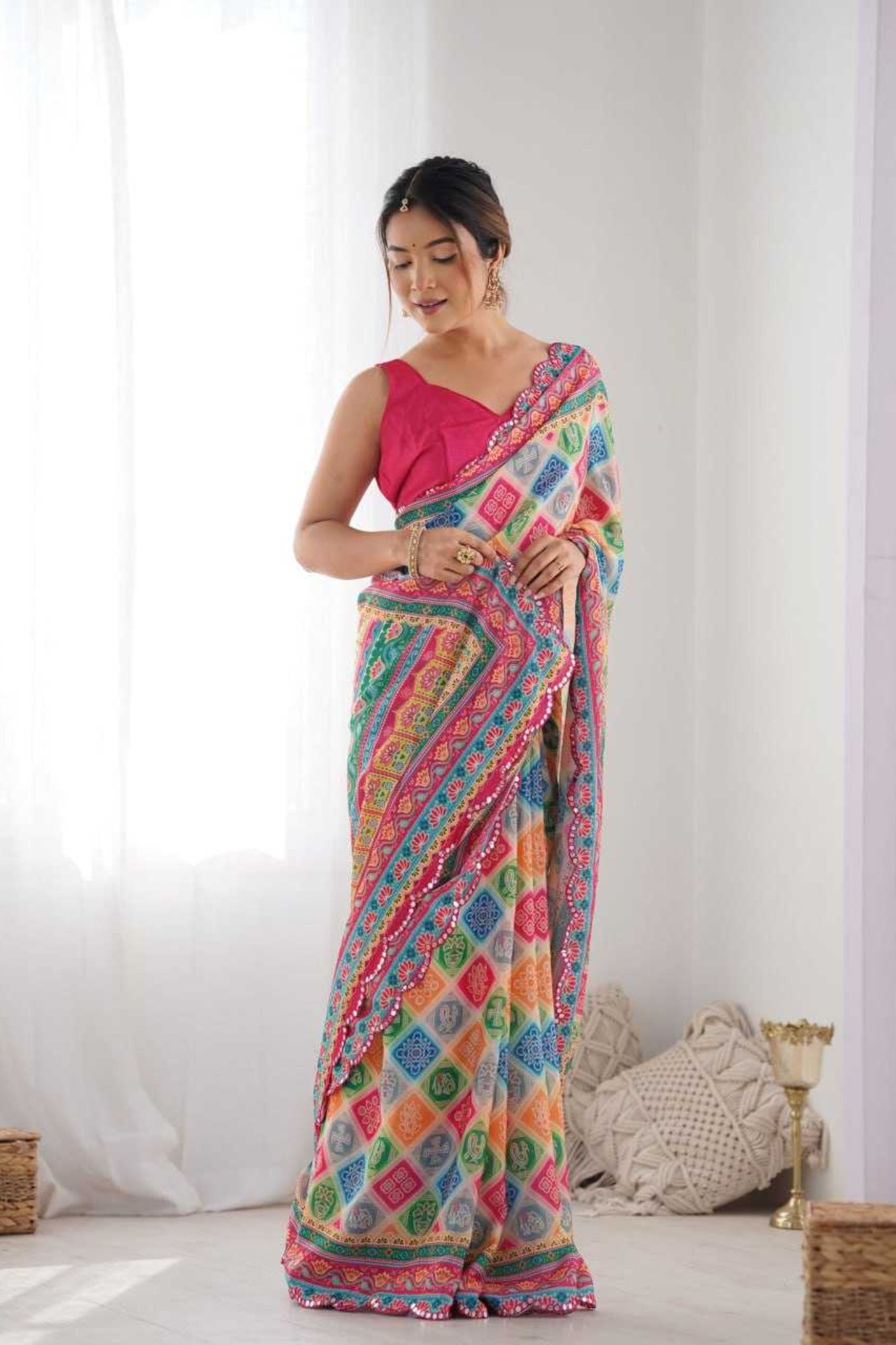 A perfect fusion of color and tradition, this Heavy Chinnon Saree showcases a vibrant Kutchi-inspired multicolor print that adds festive energy to your wardrobe. The saree is beautifully detailed with a mirror lace border, giving it a touch of ethnic elegance and shimmer.