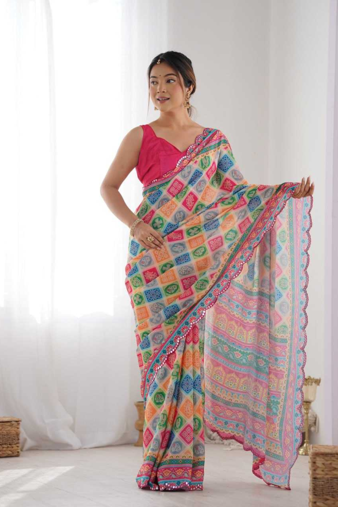 Vibrant Kutchi Print Heavy Chinnon Saree with Mirror Lace Border