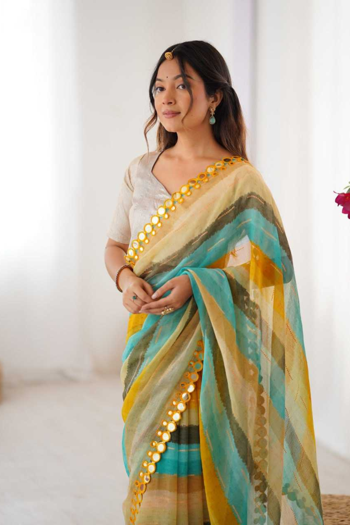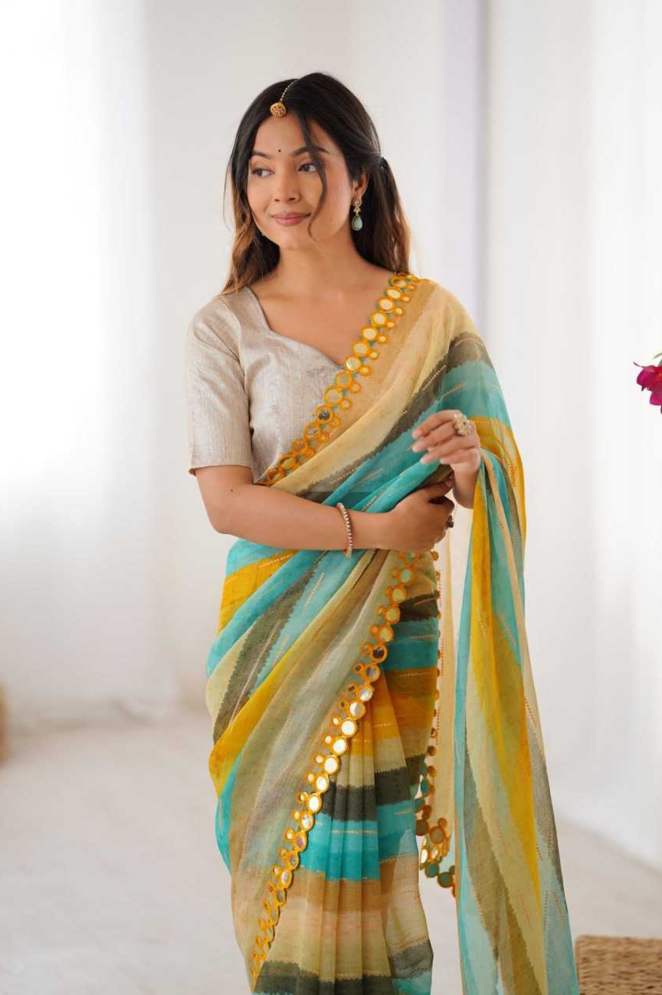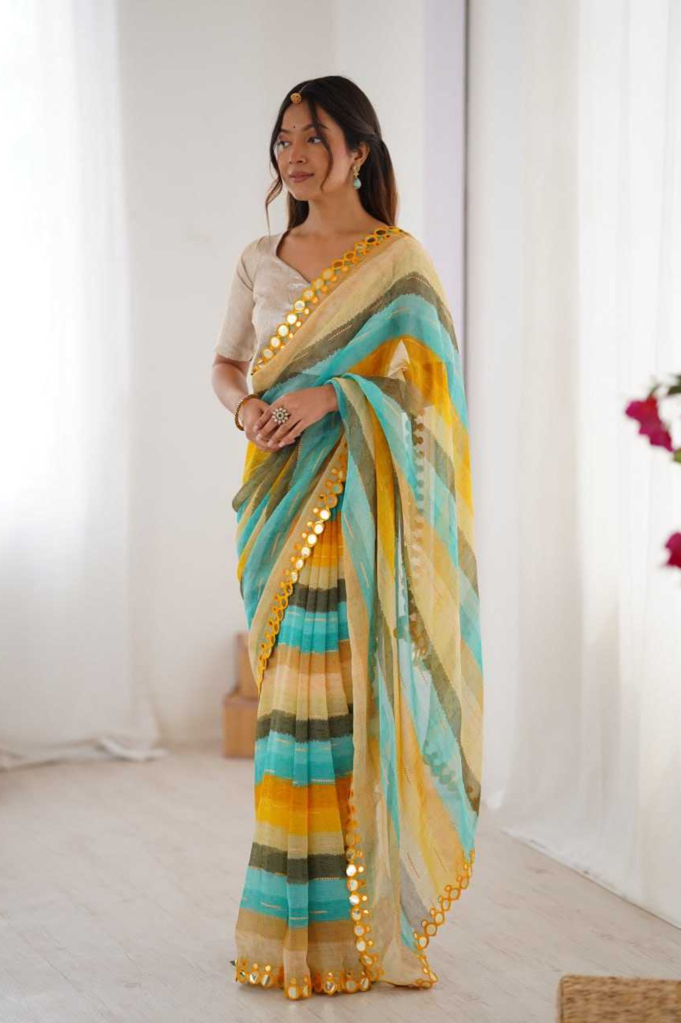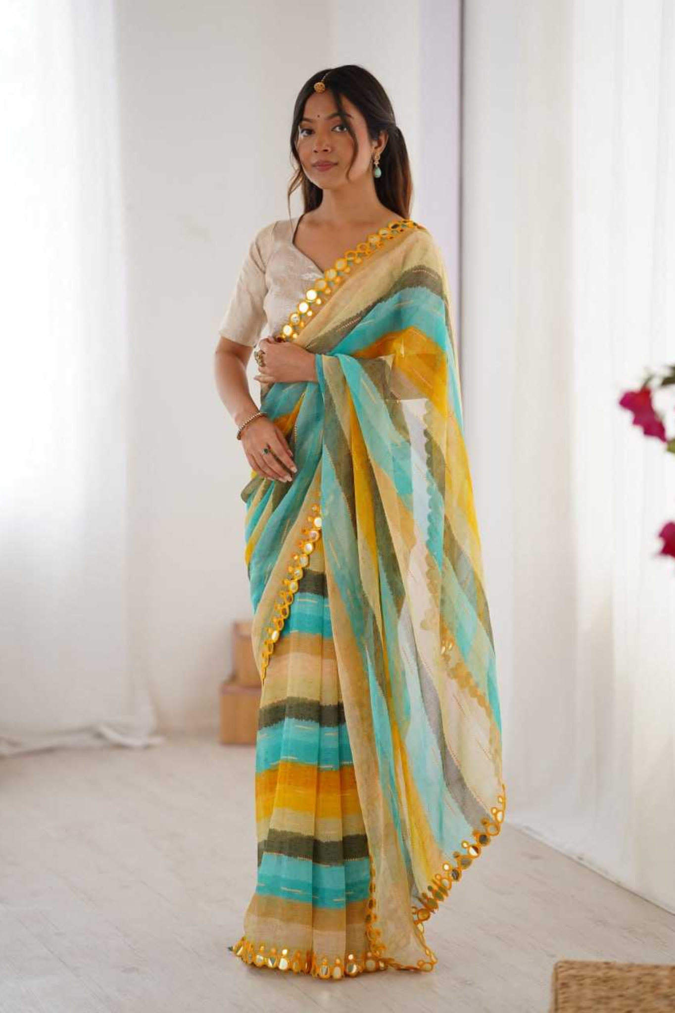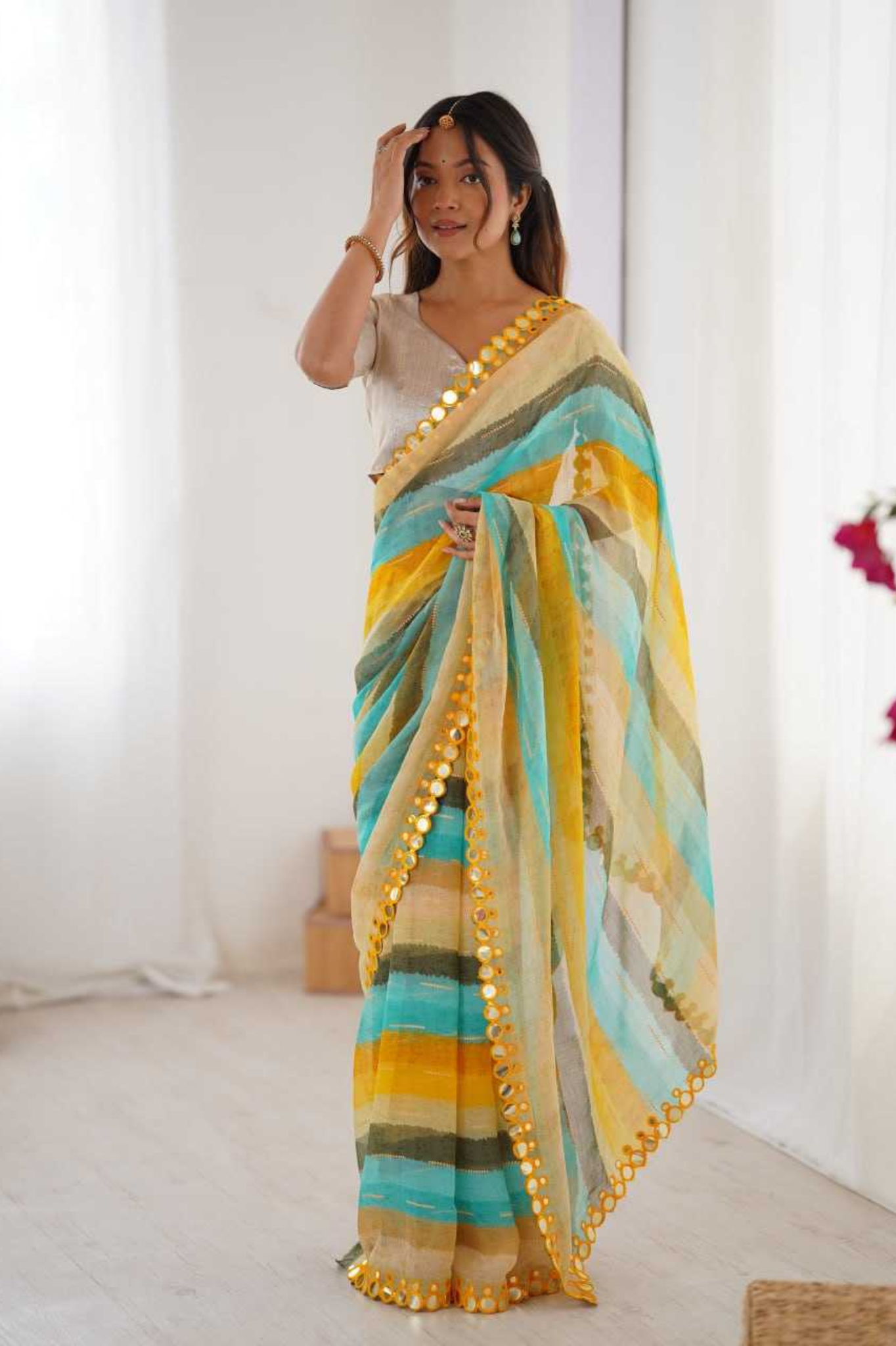 ✨ Lightweight yet luxurious, this Leriya Print Saree is perfect for festive gatherings, haldi events, and traditional celebrations.