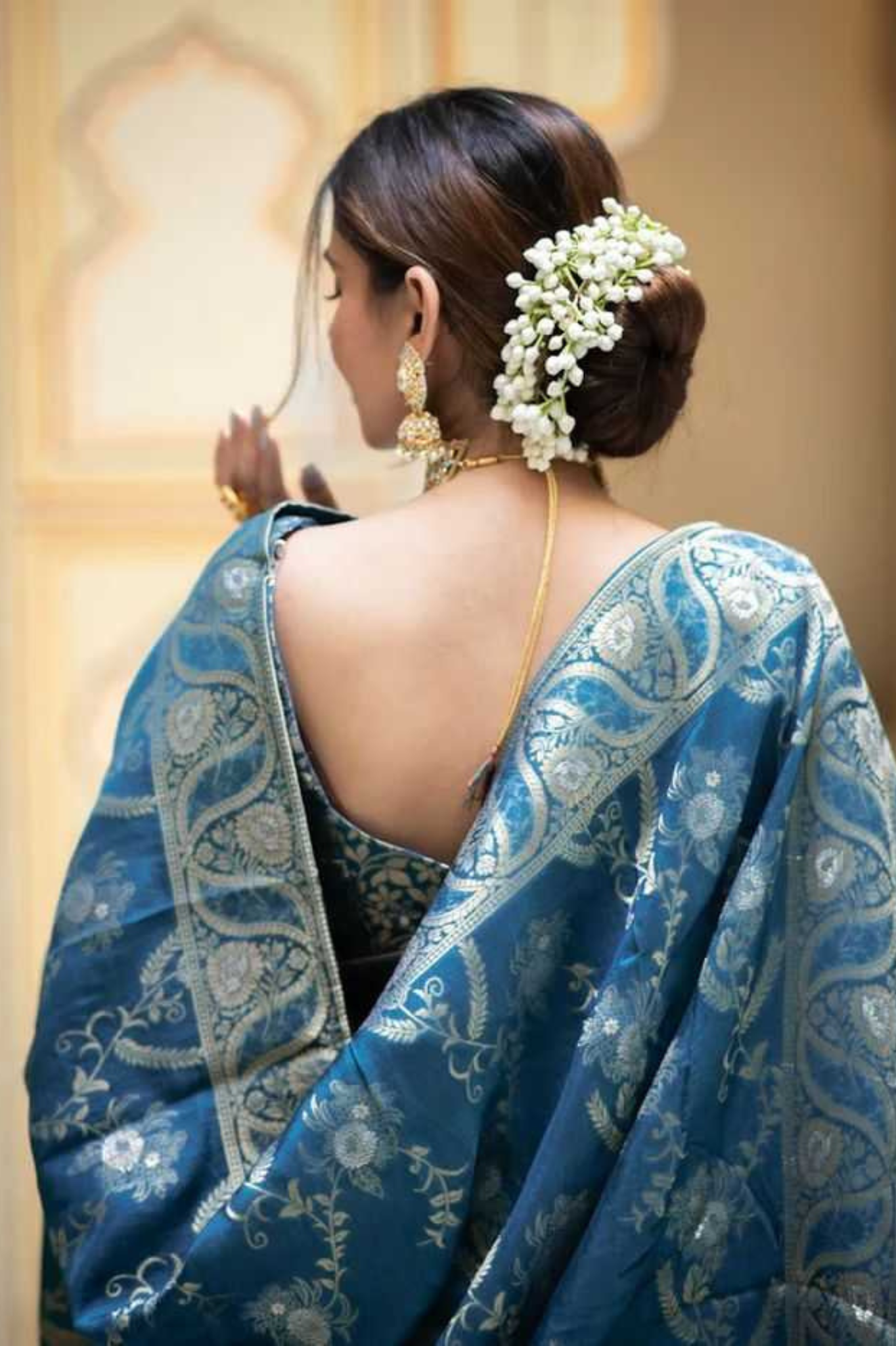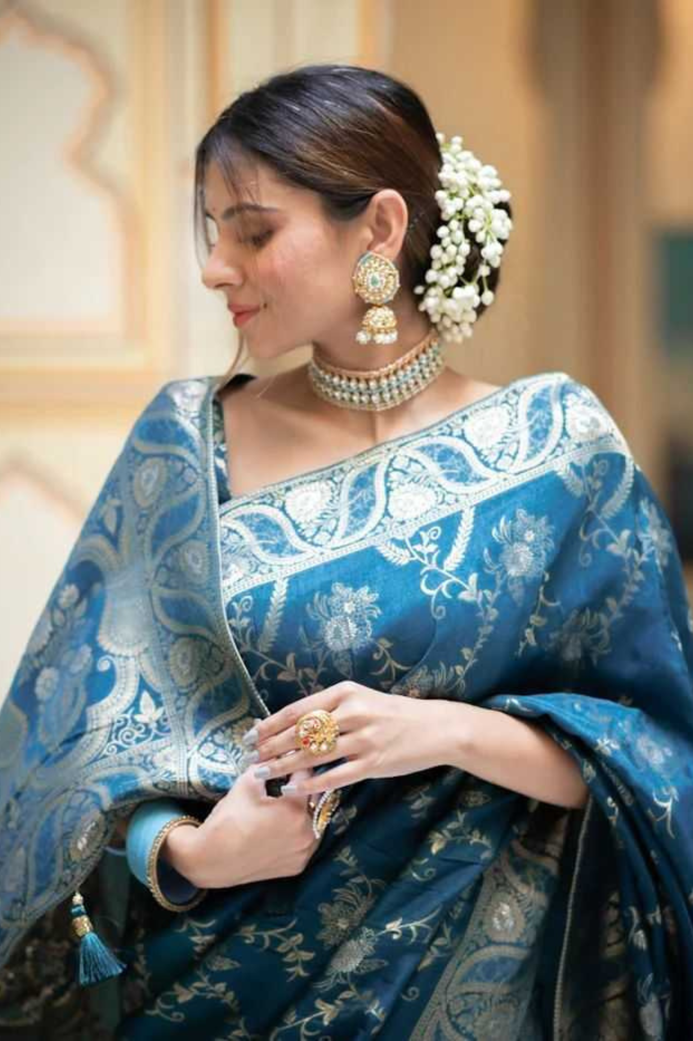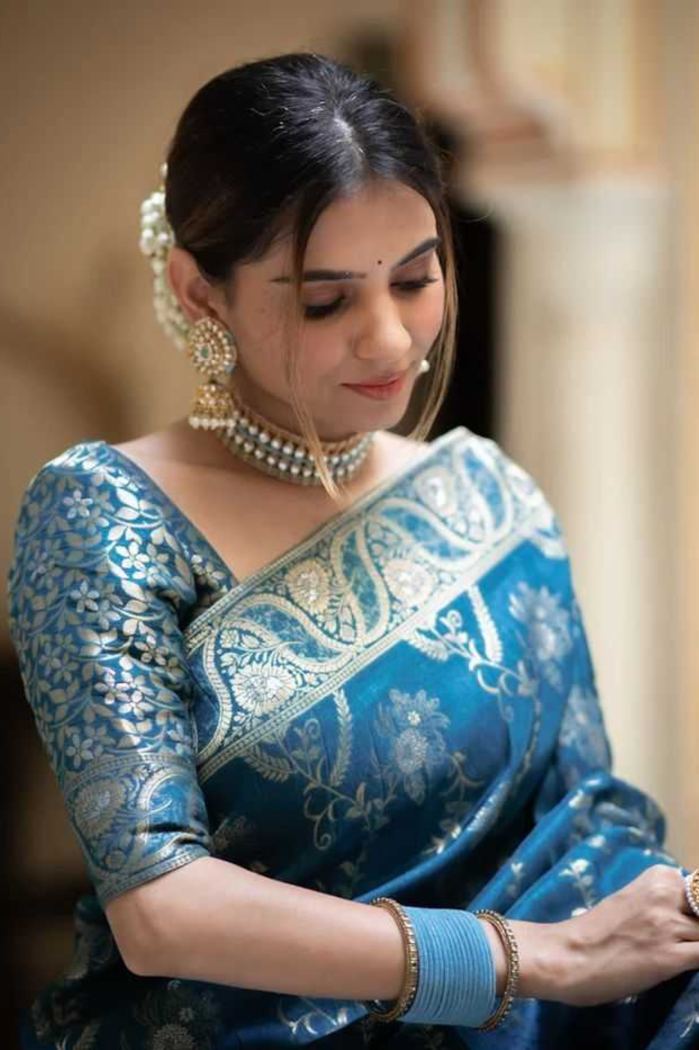 Sky Blue Kanjivaram Banarasi Silk Saree with Rich Zari Weaving & Jacquard Blouse