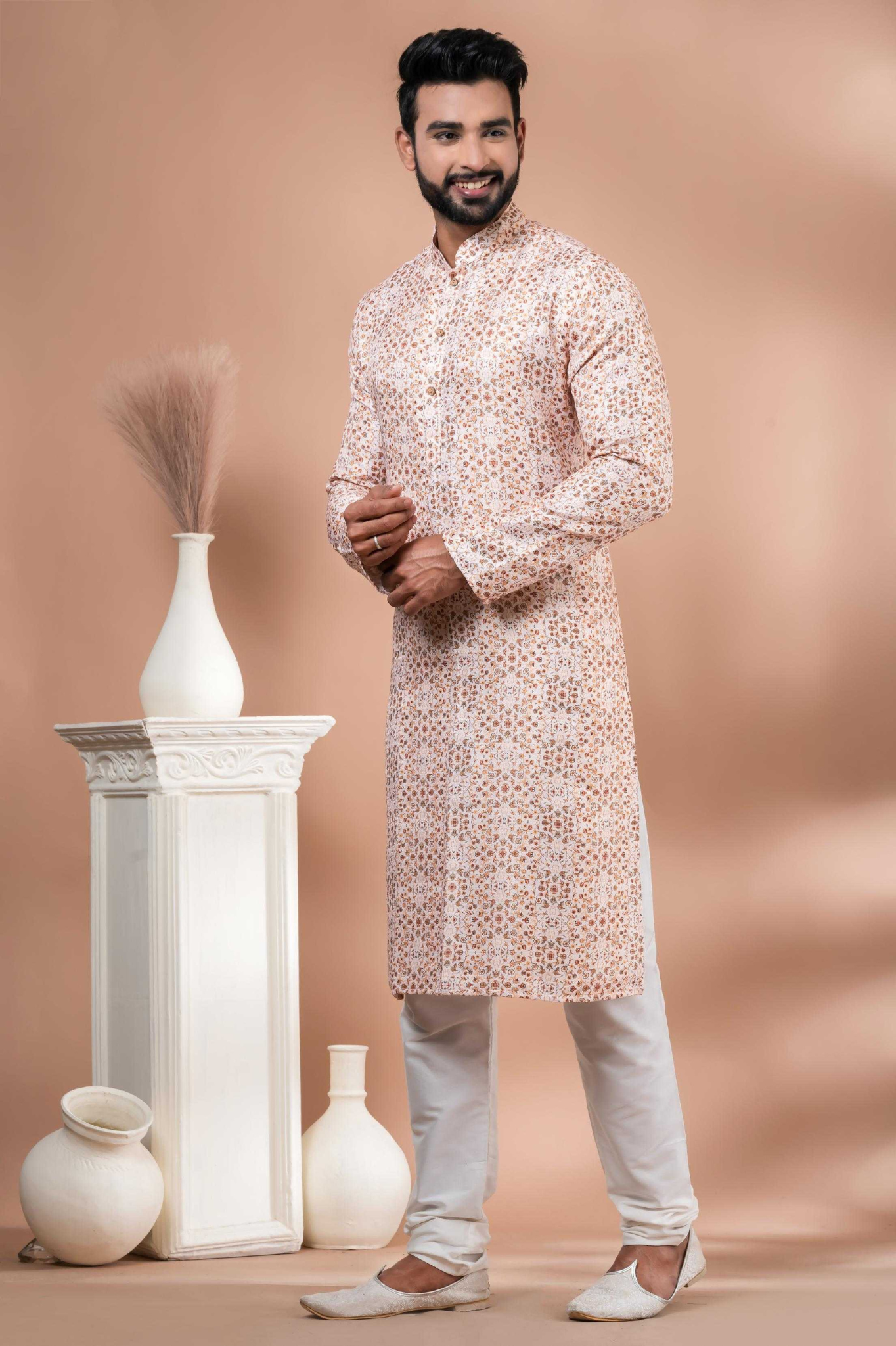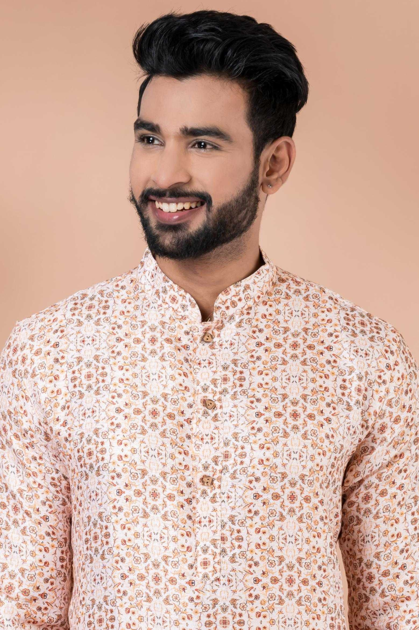 Refresh your ethnic collection with this men’s kurta pajama set, crafted from soft and breathable cotton fabric. Designed in a soothing white-orange tone with all-over subtle floral prints, this kurta offers both comfort and sophistication. Paired with a crisp white pajama, it makes the perfect outfit for festive gatherings, casual celebrations, or family functions.