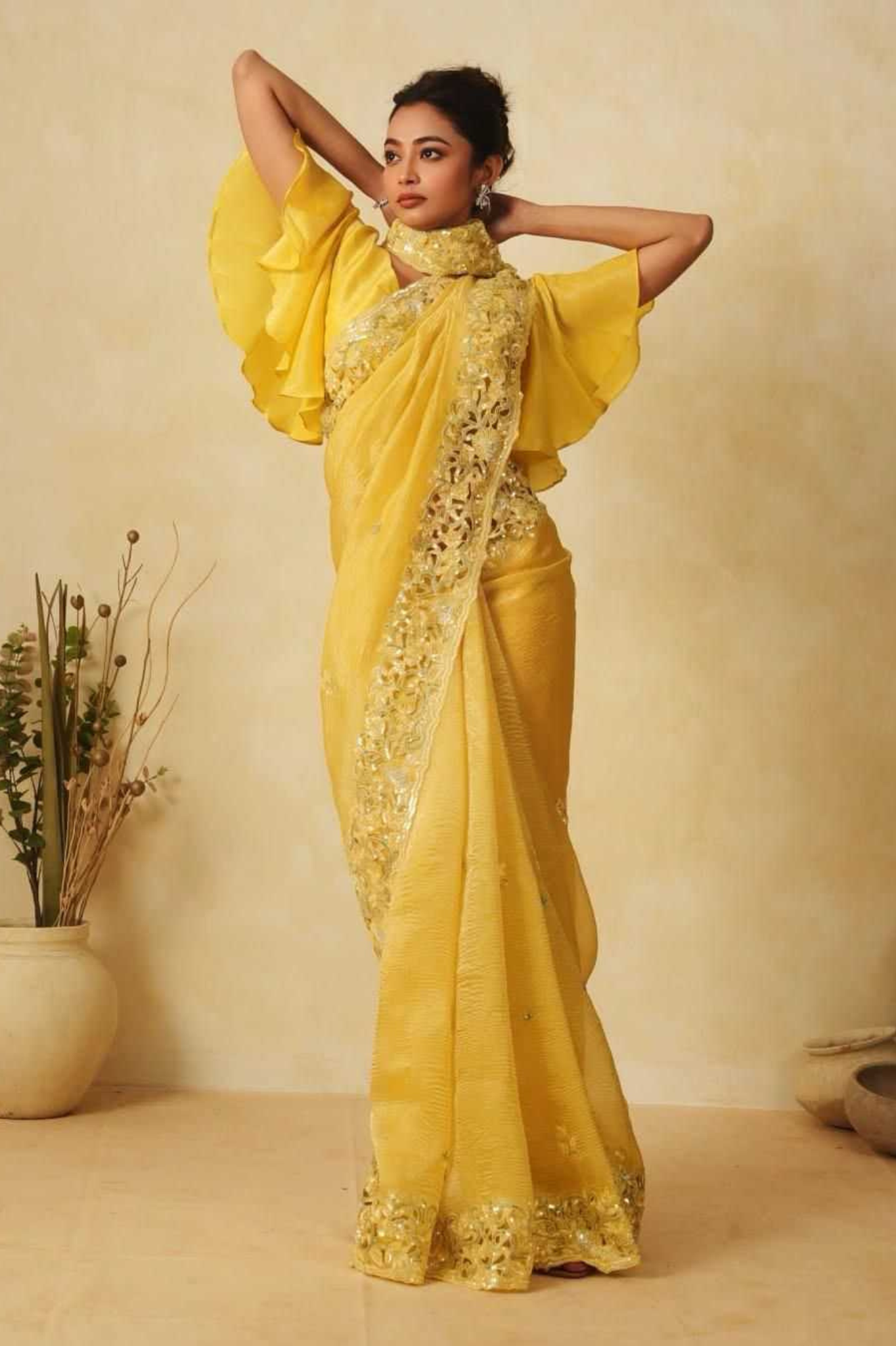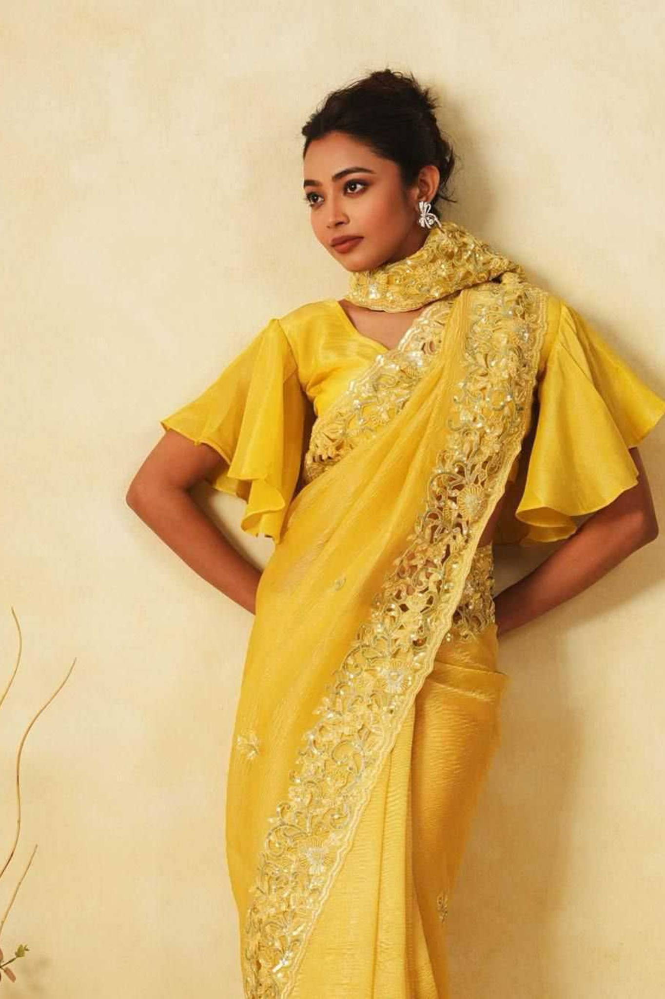 Soft Crunchy Silk Saree in Haldi Yellow with Sequin Embroidery