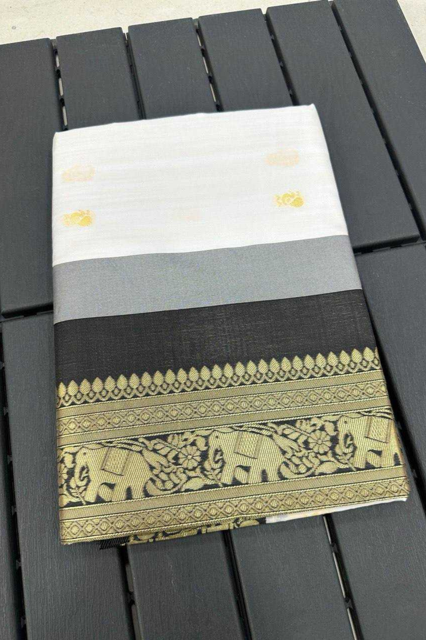 Soft Lichi Silk White Saree with Black & Golden Jacquard Border