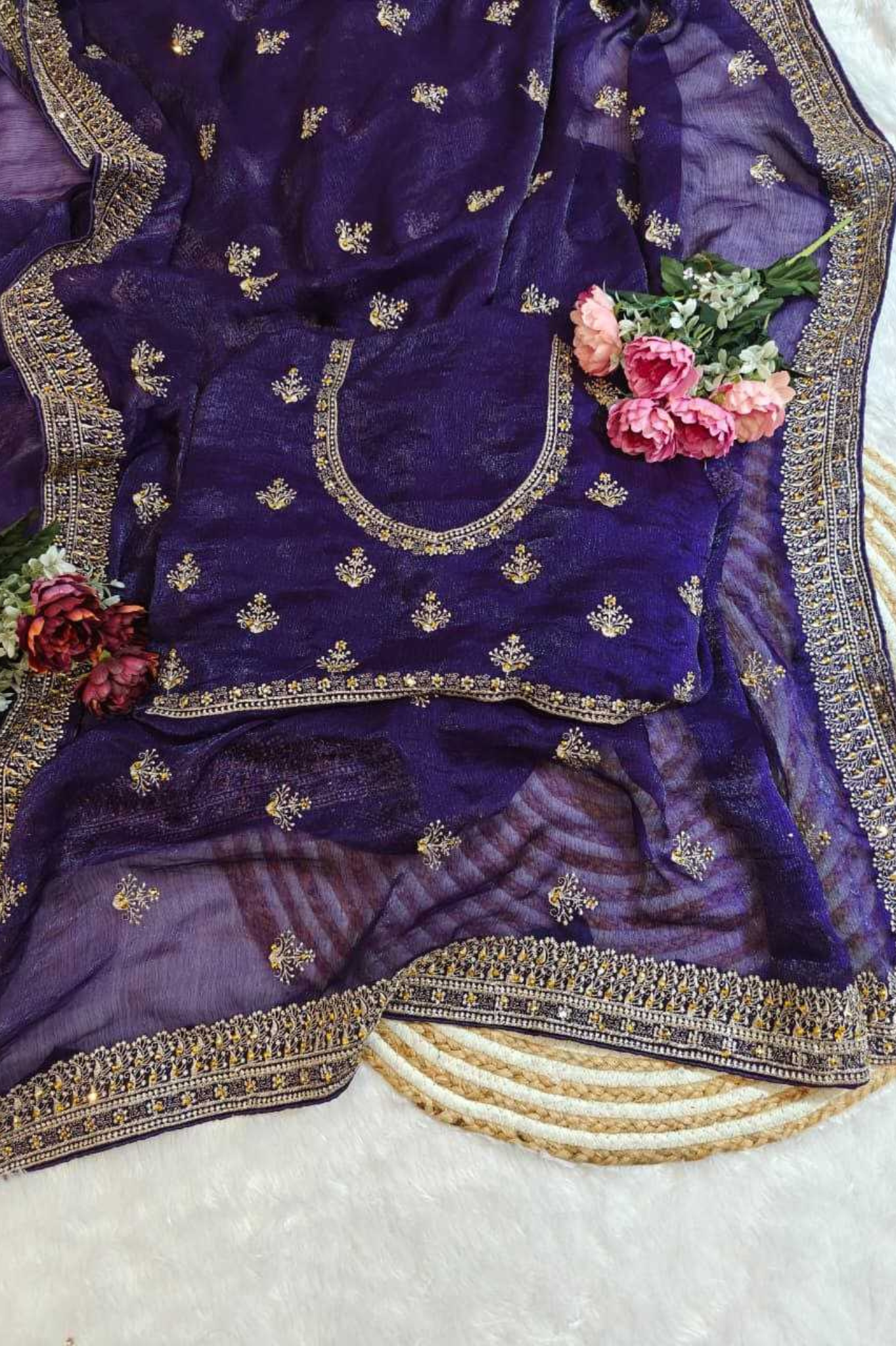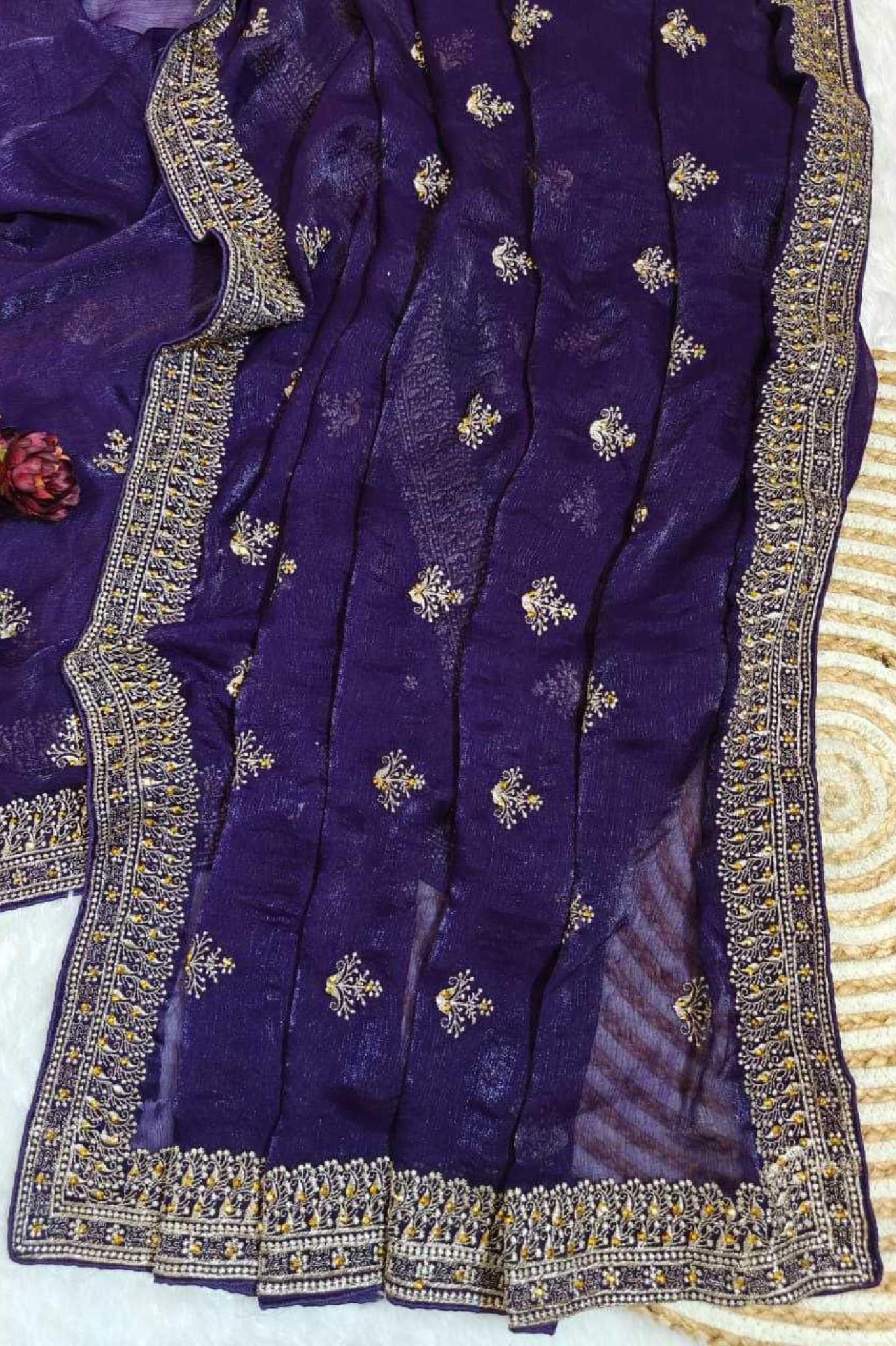 Purple Soft Fancy Chiffon Saree with Zari Pallu & Hand Stone Work