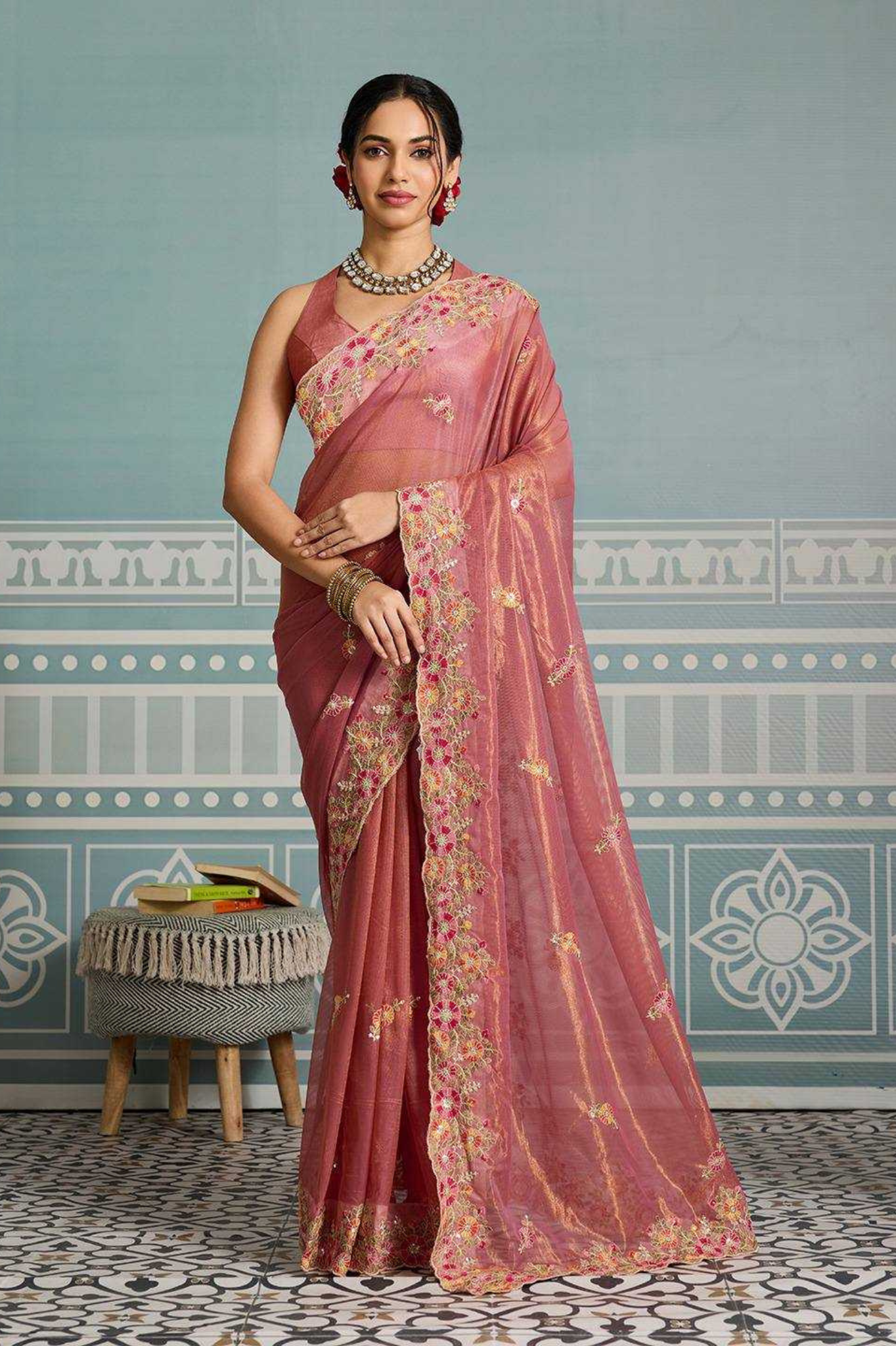 An elegant drape crafted from premium crunchy chiffon, this saree features a graceful scallop design with fine thread embroidery work, making it a timeless addition to your festive and wedding wardrobe. The satin digital print blouse complements the saree beautifully, adding a modern touch...