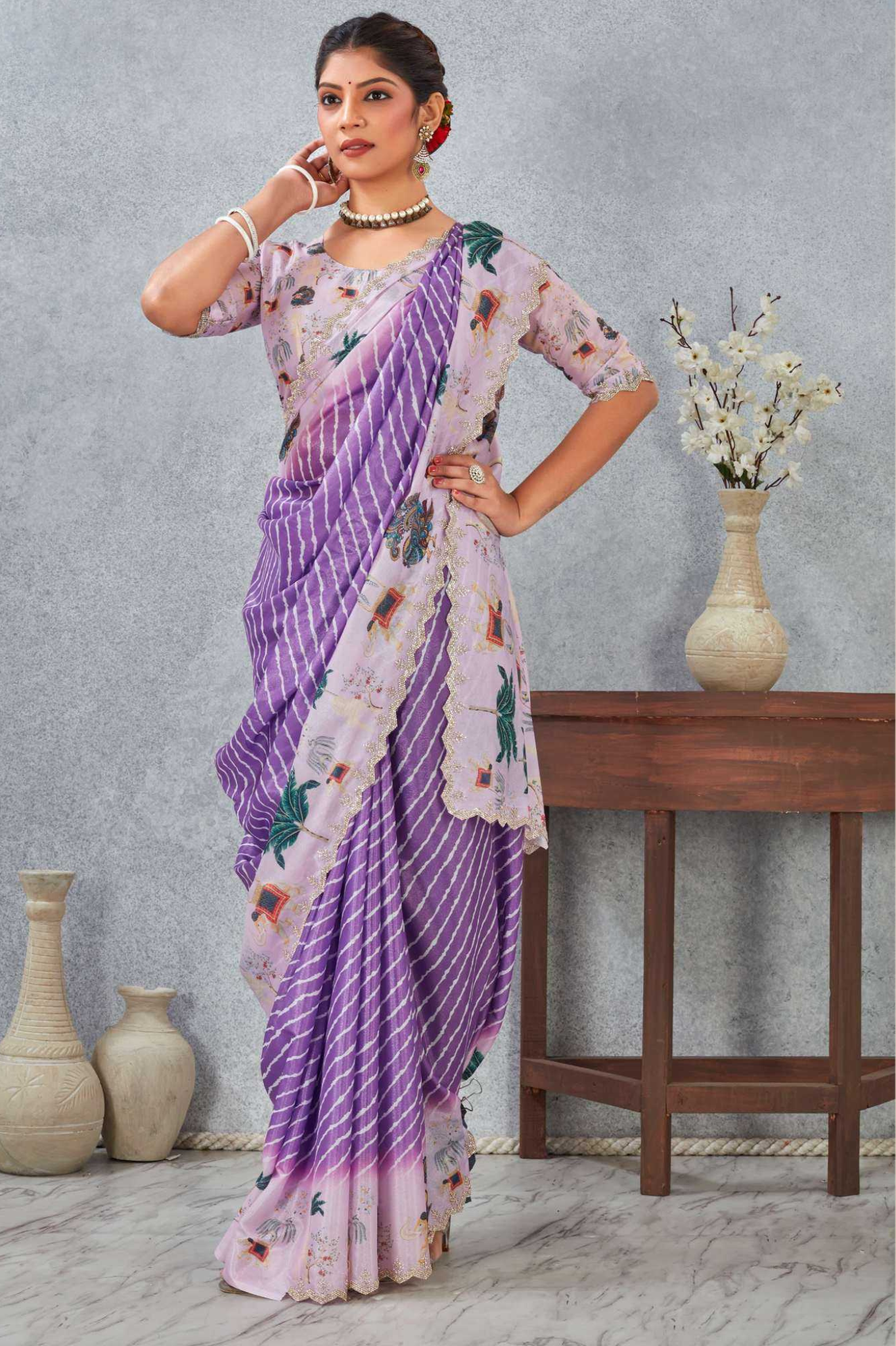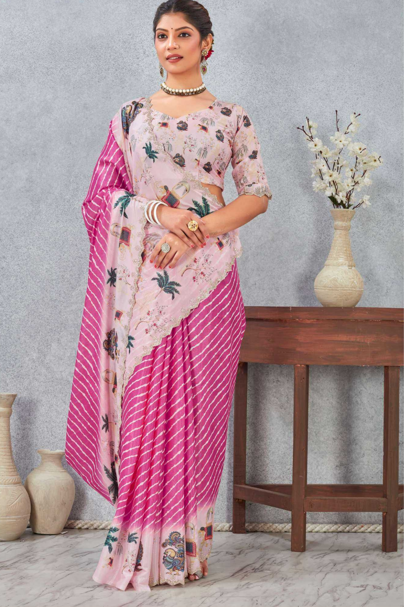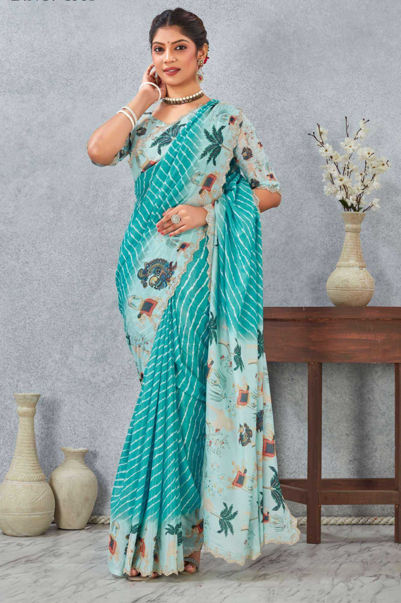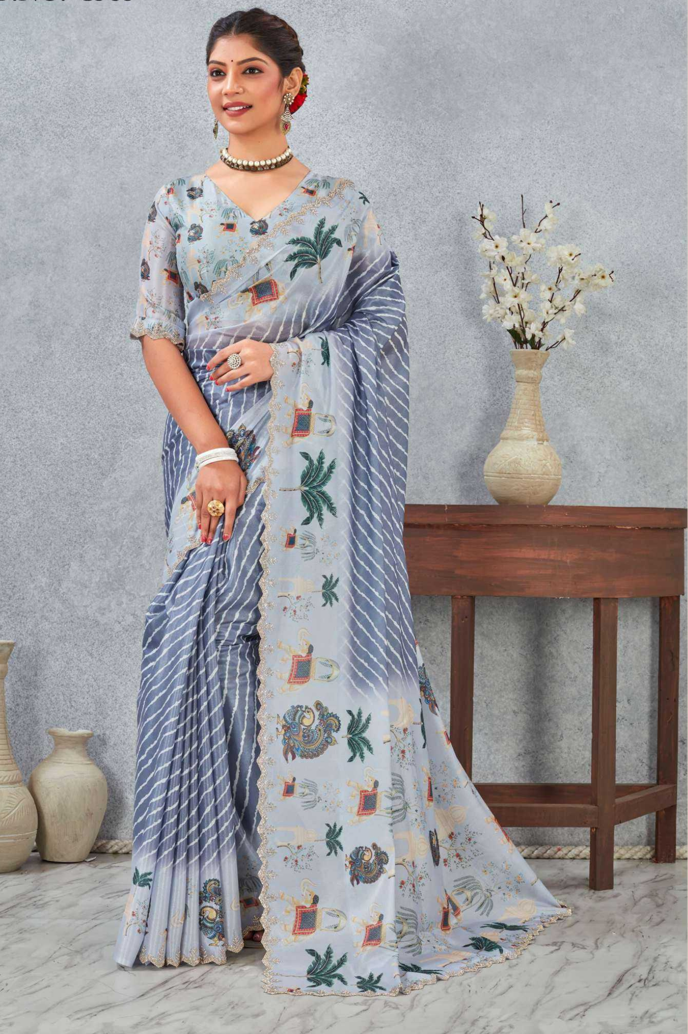 Paired with a matching printed blouse, this saree is lightweight, flowy, and perfect for day functions, festive wear, or elegant casual occasions.