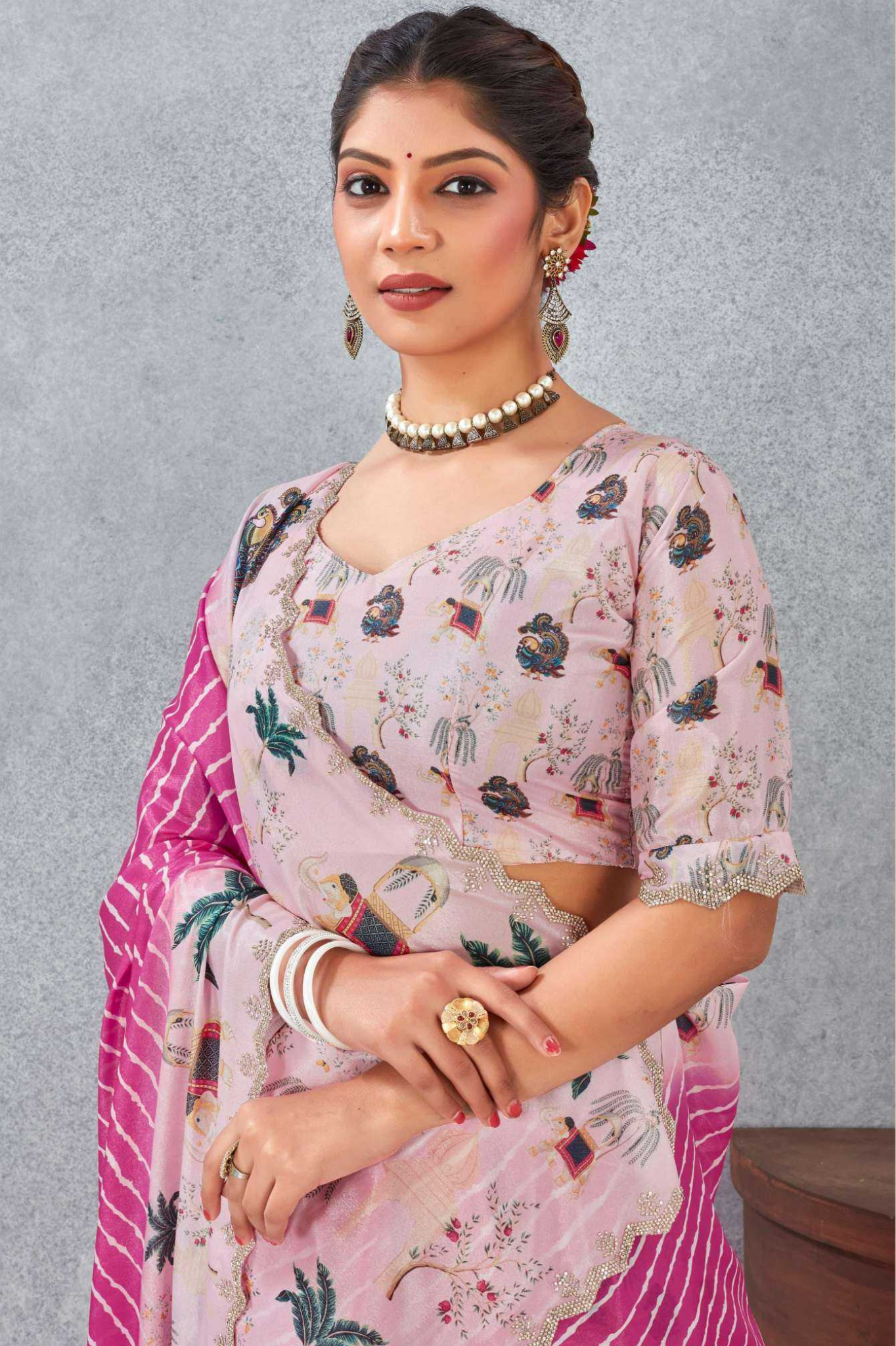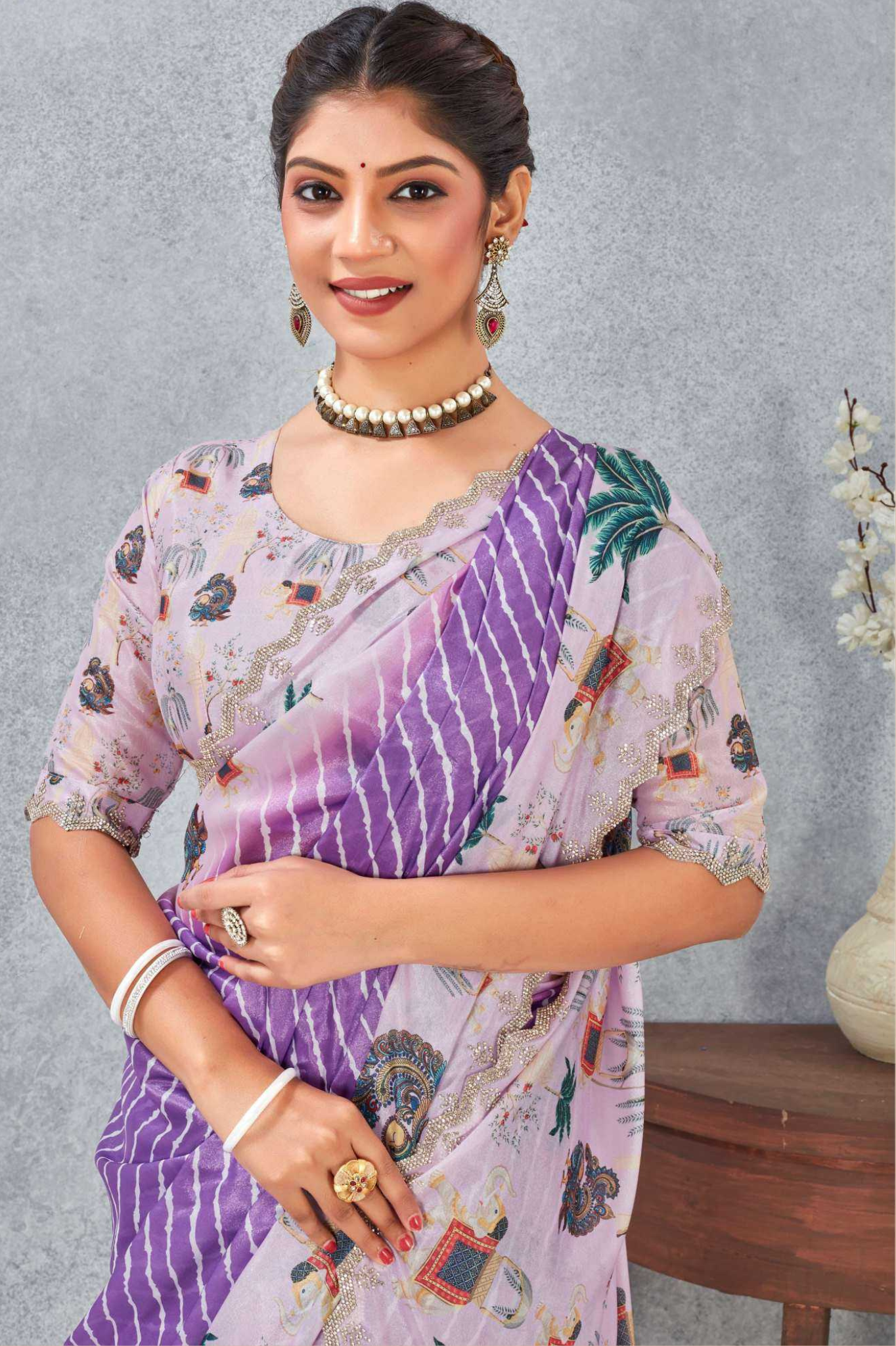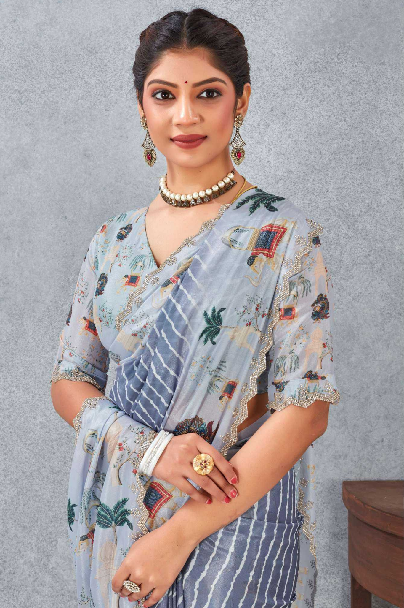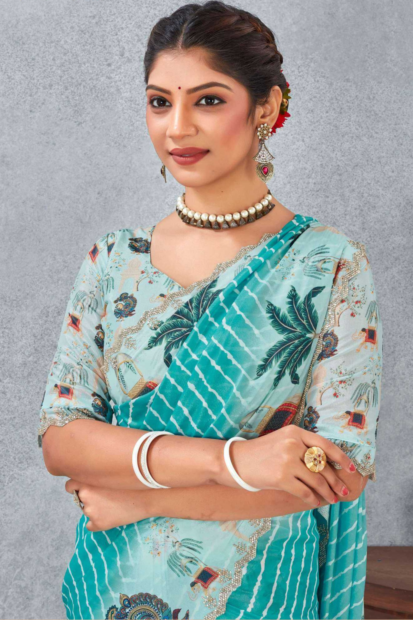 Paired with a matching printed blouse, this saree is lightweight, flowy, and perfect for day functions, festive wear, or elegant casual occasions.