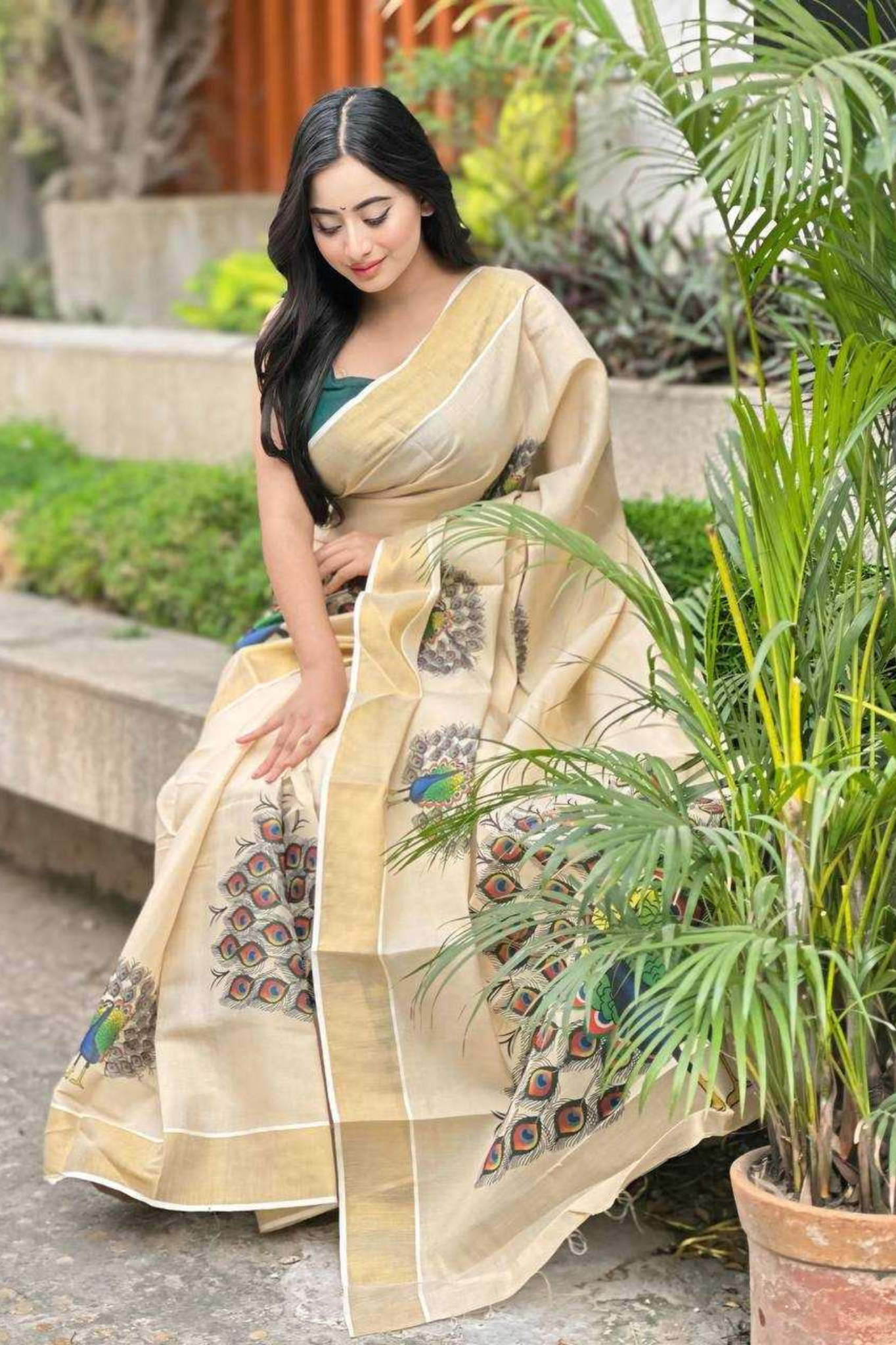 Saree Work: Intricate Zari and Thread Weaving with Printed Peacock Design