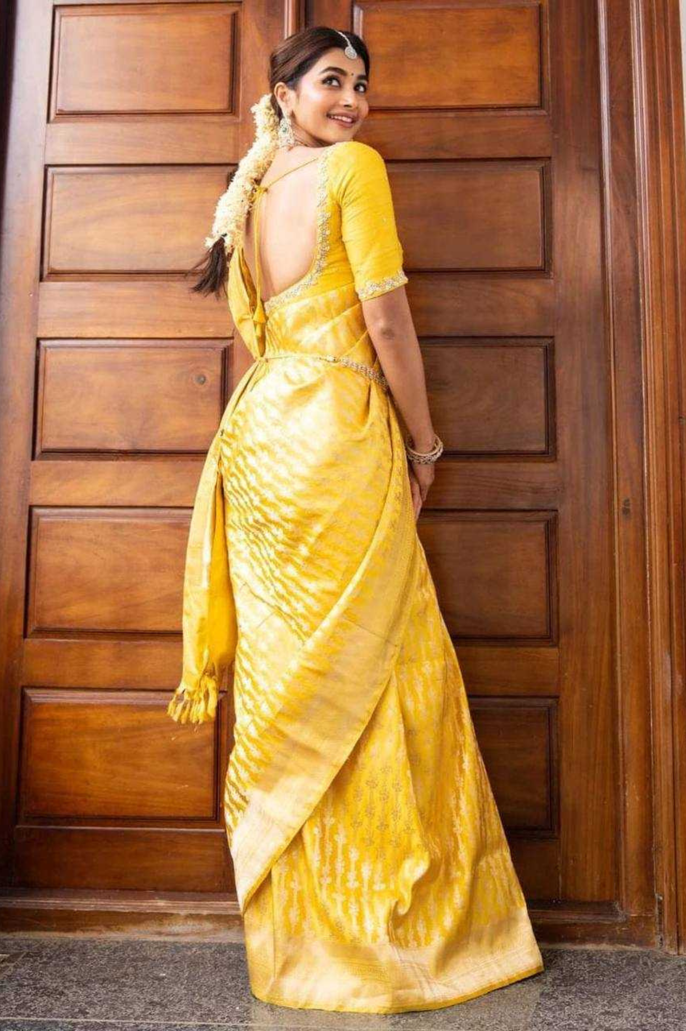 Radiate sunshine and sophistication with this Soft Lichi Silk Saree, beautifully woven with intricate Jacquard designs across the drape. The saree showcases a rich pallu that enhances its traditional charm, perfect for festive and wedding occasions.